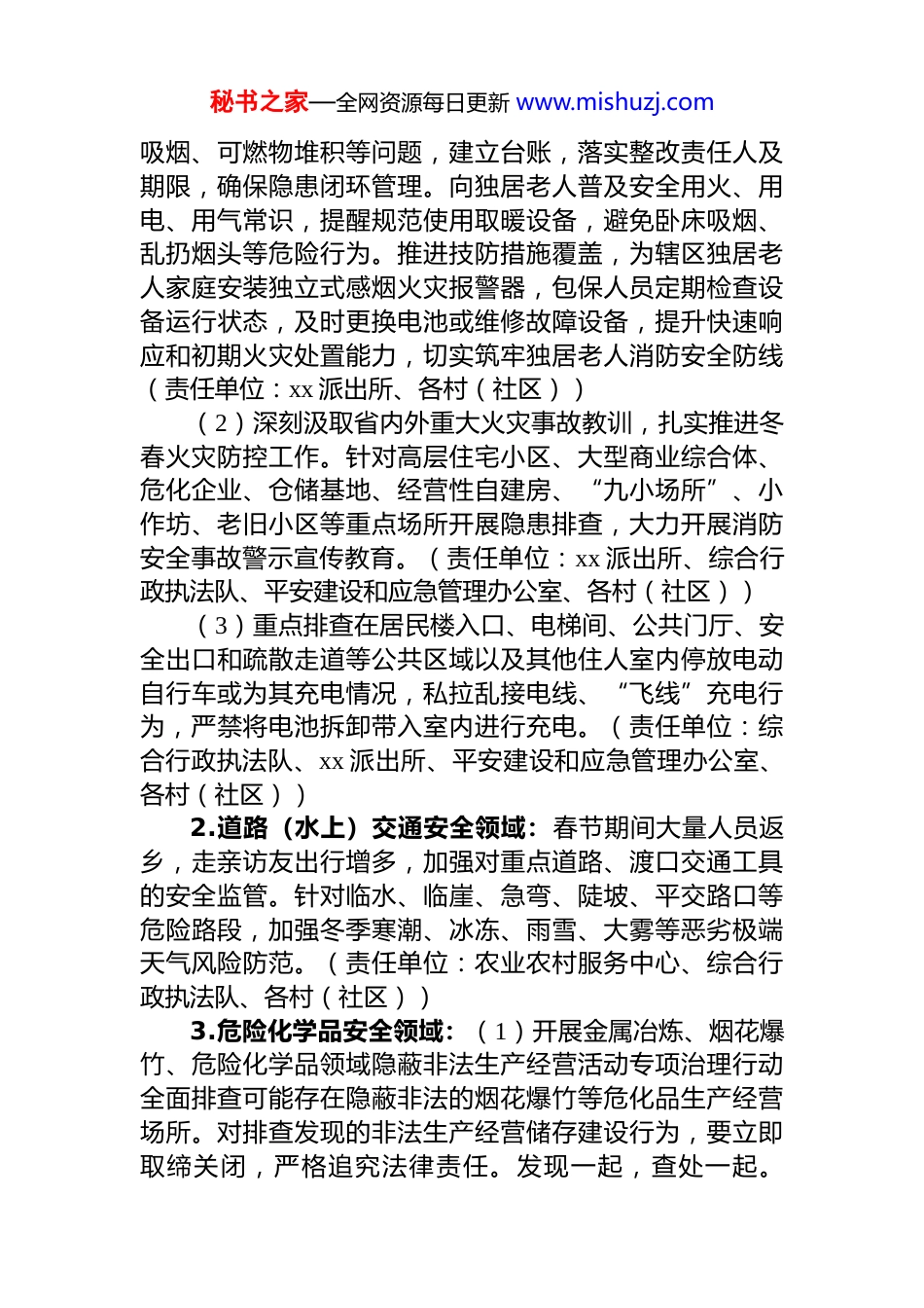 秘书之家—全网资源每日更新 www.mishuzj.comxx 镇 2026 年第一季度安全生产工作方案第一季度正值岁末年初关键期,为切实做好我镇 2026年第一季度安全生产工作,有效遏制各类安全生产事故发生,确保我镇安全生产形势稳定,经研究,特制定第一季度安全生产工作重点及专项整治工作方案。请各村(社区)、相关部门按照文件要求,认真开展安全生产隐患排查、整治工作,具体方案如下:一、指导思想深入贯彻落实******对安全生产工作的重要讲话和指示批示精神,牢固树立安全发展理念,坚持人民至上、生命至上,以“时时放心不下”的责任感和紧迫感,严格按照“三管三必须”监管要求及“*政同责、一岗双责、齐抓共管、失职追责”责任体系,确保安全生产责任覆盖每个环节、岗位、人员。聚焦突出矛盾问题持续整治攻坚,深入研判春节、两会及岁末年初等重点时段特点,坚决克服侥幸心理,强化隐患排查治理,着力提高全镇安全生产监督管理水平,坚决遏制安全生产事故发生。二、工作目标认真落实“三管三必须”的安全监管责任,扎实开展好安全生产治本攻坚三年行动,以提升本质安全水平为核心,强化源头治理和系统防控。针对冬季气候特点和春季复工复产,加大检查频次和整改力度。切实保障春节、两会期间、各节假日和重要时间点的全镇安全生产形势持续稳定,为高质量发展营造安全环境。三、工作重点1.消防安全领域:(1)遏制“小火亡人”加强独居老人火灾防范,组织网格员、包保人员开展独居老人一周一查,重点检查电气线路老化、违规使用大功率电器、卧床秘书之家—全网资源每日更新 www.mishuzj.com吸烟、可燃物堆积等问题,建立台账,落实整改责任人及期限,确保隐患闭环管理。向独居老人普及安全用火、用电、用气常识,提醒规范使用取暖设备,避免卧床吸烟、乱扔烟头等危险行为。推进技防措施覆盖,为辖区独居老人家庭安装独立式感烟火灾报警器,包保人员定期检查设备运行状态,及时更换电池或维修故障设备,提升快速响应和初期火灾处置能力,切实筑牢独居老人消防安全防线(责任单位:xx 派出所、各村(社区))(2)深刻汲取省内外重大火灾事故教训,扎实推进冬春火灾防控工作。针对高层住宅小区、大型商业综合体、危化企业、仓储基地、经营性自建房、“九小场所”、小作坊、老旧小区等重点场所开展隐患排查,大力开展消防安全事故警示宣传教育。(责任单位:xx 派出所、综合行政执法队、平安建设和应急管理办公室、各村(社区))(3)重点排查在居民楼入口、电梯间、公共门厅、安全出口和疏散走道等公共区域以及其他住人室内停放电动自行车或为其充电情况,私拉乱接电线、“飞线”充电行为,严禁将电池拆卸带入室内进行充电。(责任单位:综合行政执法队、xx 派出所、平安建设和应急管理办公室、各村(社区))2.道路(水上)交通安全领域:春节期间大量人员返乡,走亲访友出行增多,加强对重点道路、渡口交通工具的安全监管。针对临水、临崖、急弯、陡坡、平交路口等危险路段,加强冬季寒潮、冰冻、雨雪、大雾等恶劣极端天气风险防范。(责任单位:农业农村服务中心、综合行政执法队、各村(社区))3.危险化学品安全领域:(1)开展金属冶炼、烟花爆竹、危险化学品领域隐蔽非法生产经营活动专项治理行动全面排查可能存在隐蔽非法的烟花爆竹等危化品生产经营场所。对排查发现的非法生产经营储存建设行为,要立即取缔关闭,严格追究法律责任。发现一起,查处一起。秘书之家—全网资源每日更新 www.mishuzj.com(责任单位:xx 派出所、综合行政执法队、平安建设和应急管理办公室)(2)严格落实《望江县燃放烟花爆竹管理办法》,加强烟花爆竹的全链条监管。全面排查辖区内危险化学品经营单位、烟花爆竹零售点,严厉打击无证销售、超量储存违规运输等违法违规行为。针对元旦、春节、两会等重点时段,加密重点区域的巡查频次,广泛开展禁燃禁放宣传教育,通过村(社区)广播、公告栏、微信群、悬挂横幅入户宣传等渠道,普及燃放烟花爆竹的安全风险及法律后果,引导群众自觉抵制违规燃放行为。建立健全举报奖励机制,鼓励群众积极举报非法生产、储存、燃放危险化学品类物品的线...