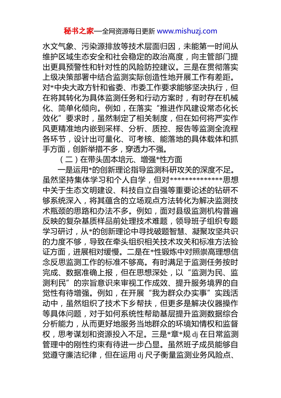 秘书之家—全网资源每日更新 www.mishuzj.com市生态环境监测中心领导班子 2025 年度民主生活会对照检查材料(五个带头)根据上级统一部署,紧扣本次民主生活会主题,中心领导班子在深化理论学习、广泛征求意见、深入谈心谈话的基础上,紧密联系思想、职责和工作实际,对照“五个带头”要求,全面深入查摆问题,深刻剖析思想根源,明确整改方向与措施。现将对照检查情况报告如下。一、存在的主要问题领导班子紧扣主题,对照*的二十届四中全会关于推进中国式现代化的战略部署和锲而不舍落实中央八项规定精神的要求,结合生态环境监测主责主业,认真查摆了以下五个方面的问题。(一)在带头强化政治忠诚、提高政治能力方面一是从政治高度谋划监测业务全局的视野有待拓宽。对标“国之大者”和高质量发展首要任务,将监测工作融入中国式现代化**实践进行系统性、前瞻性思考不足。例如,在编制年度监测方案时,虽然完成了上级下达的常规监测任务,但对如何通过监测数据更深层次地揭示区域生态环境质量与经济社会发展、产业结构调整间的内在关联从而为市委市政府宏观决策提供更具战略性的参考,主动研究谋划不够,监测数据的政策转化率和决策支撑效能尚有提升空间。二是运用政治眼光分析研判监测数据潜在风险的能力有待加强。面对复杂的环境质量形势,有时更多关注于数据本身的准确性和达标率,对其背后可能隐含的区域性、流域性环境风险,以及由此可能引发的社会关注乃至舆情风险,政治敏锐性和洞察力不足。例如,在分析2024 年某季度部分河流断面水质波动数据时,初期主要从秘书之家—全网资源每日更新 www.mishuzj.com水文气象、污染源排放等技术层面归因,未能第一时间从维护区域生态安全和社会稳定的政治高度,向主管部门提出更具预警性和针对性的风险防控建议。三是在贯彻落实上级决策部署中结合监测实际创造性地开展工作有差距。对*中央大政方针和省委、市委工作要求能够坚决执行,但在将其转化为具体监测任务和行动方案时,有时存在机械化、简单化倾向。例如,在落实“推进作风建设常态化长效化”要求时,虽然制定了相关制度,但在如何将严实作风更精准地内嵌到采样、分析、质控、报告等监测全流程各环节,设计出可量化、可考核、能落地的具体载体和抓手方面,创新举措不多,穿透力不强。(二)在带头固本培元、增强*性方面一是运用*的创新理论指导监测科研攻关的深度不足。虽然坚持集体学习和个人自学,但对**************思想中关于生态文明建设、科技自立自强等重要论述的钻研不够系统深入,将其蕴含的立场观点方法转化为解决监测技术瓶颈的思路和办法不多。例如,面对县级监测机构普遍反映的复杂基质样品前处理技术难题,领导班子组织专题学习研讨,从*的创新理论中寻找破题智慧、凝聚攻坚共识的力度不够,导致在牵头组织相关技术攻关和标准方法验证方面,进展相对缓慢。二是在*性锻炼中对照崇高理想信念反思监测工作的标准不够高。有时满足于监测任务按时完成、数据准确上报,但在思想深处,以“监测为民、监测利民”的宗旨意识来审视工作成效、提升服务境界的自觉性有待增强。例如,在开展“我为群众办实事”实践活动中,虽然组织了技术下乡帮扶,但更多是解决仪器操作等具体问题,对于如何系统性帮助基层提升监测数据综合分析能力,从而更好地服务当地群众的环境知情权和监督权,思考谋划和资源投入不足。三是*章*规 dj 在日常监测管理中的刚性约束有待进一步凸显。虽然班子成员能够自觉遵守廉洁纪律,但在运用 dj 尺子衡量监测业务风险点、秘书之家—全网资源每日更新 www.mishuzj.com规范监测权力运行方面,抓得不够细致具体。例如,在委托社会检测机构承担部分监测项目时,虽然履行了采购程序,但对于合同执行过程中可能存在的廉洁风险、数据质量风险,进行常态化 dj 教育和过程监督的频次和深度有待加强,将纪律要求融入业务管理的“防腐剂”作用发挥不够充分。(三)在带头敬畏人民、敬畏组织、敬畏法纪方面一是“四下基层”制度在监测领域的实践形式有待丰富。班子成员定期下基层调研,但有时“走马观花”多于“下马看花”,与一线监测人员、服务对象面...