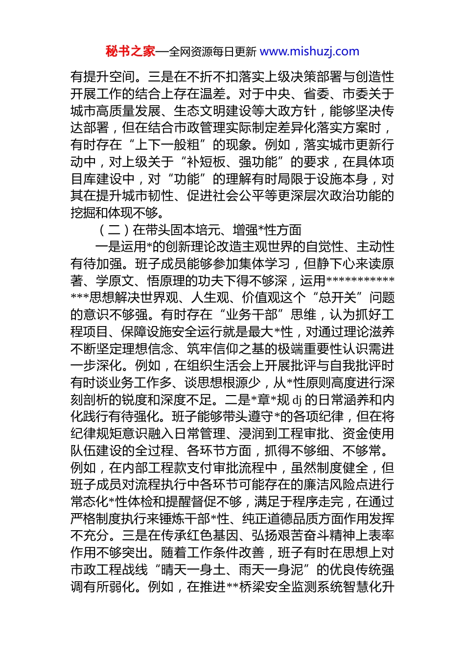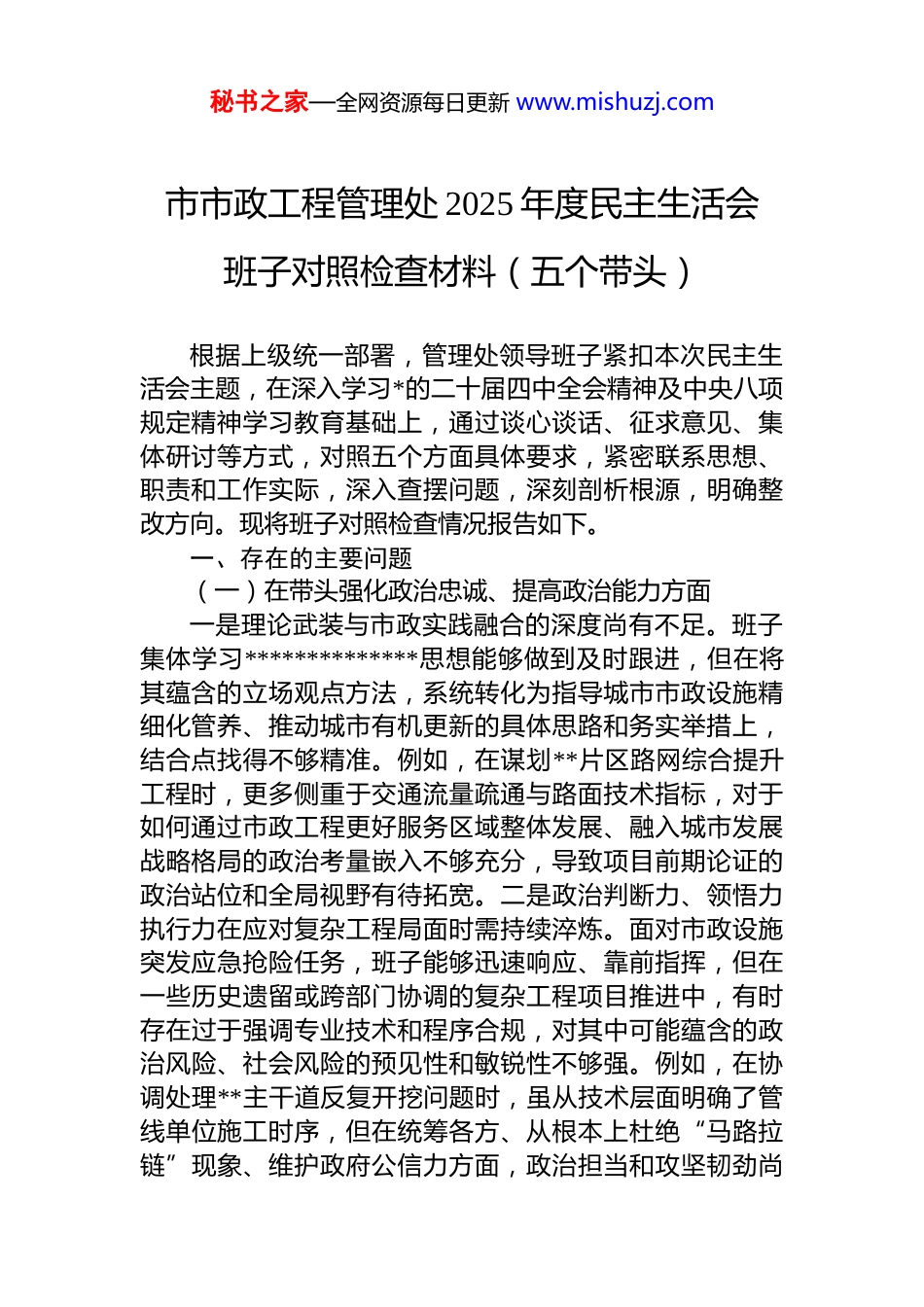 秘书之家—全网资源每日更新 www.mishuzj.com市市政工程管理处 2025 年度民主生活会班子对照检查材料(五个带头)根据上级统一部署,管理处领导班子紧扣本次民主生活会主题,在深入学习*的二十届四中全会精神及中央八项规定精神学习教育基础上,通过谈心谈话、征求意见、集体研讨等方式,对照五个方面具体要求,紧密联系思想、职责和工作实际,深入查摆问题,深刻剖析根源,明确整改方向。现将班子对照检查情况报告如下。一、存在的主要问题(一)在带头强化政治忠诚、提高政治能力方面一是理论武装与市政实践融合的深度尚有不足。班子集体学习**************思想能够做到及时跟进,但在将其蕴含的立场观点方法,系统转化为指导城市市政设施精细化管养、推动城市有机更新的具体思路和务实举措上,结合点找得不够精准。例如,在谋划**片区路网综合提升工程时,更多侧重于交通流量疏通与路面技术指标,对于如何通过市政工程更好服务区域整体发展、融入城市发展战略格局的政治考量嵌入不够充分,导致项目前期论证的政治站位和全局视野有待拓宽。二是政治判断力、领悟力执行力在应对复杂工程局面时需持续淬炼。面对市政设施突发应急抢险任务,班子能够迅速响应、靠前指挥,但在一些历史遗留或跨部门协调的复杂工程项目推进中,有时存在过于强调专业技术和程序合规,对其中可能蕴含的政治风险、社会风险的预见性和敏锐性不够强。例如,在协调处理**主干道反复开挖问题时,虽从技术层面明确了管线单位施工时序,但在统筹各方、从根本上杜绝“马路拉链”现象、维护政府公信力方面,政治担当和攻坚韧劲尚秘书之家—全网资源每日更新 www.mishuzj.com有提升空间。三是在不折不扣落实上级决策部署与创造性开展工作的结合上存在温差。对于中央、省委、市委关于城市高质量发展、生态文明建设等大政方针,能够坚决传达部署,但在结合市政管理实际制定差异化落实方案时,有时存在“上下一般粗”的现象。例如,落实城市更新行动中,对上级关于“补短板、强功能”的要求,在具体项目库建设中,对“功能”的理解有时局限于设施本身,对其在提升城市韧性、促进社会公平等更深层次政治功能的挖掘和体现不够。(二)在带头固本培元、增强*性方面一是运用*的创新理论改造主观世界的自觉性、主动性有待加强。班子成员能够参加集体学习,但静下心来读原著、学原文、悟原理的功夫下得不够深,运用**************思想解决世界观、人生观、价值观这个“总开关”问题的意识不够强。有时存在“业务干部”思维,认为抓好工程项目、保障设施安全运行就是最大*性,对通过理论滋养不断坚定理想信念、筑牢信仰之基的极端重要性认识需进一步深化。例如,在组织生活会上开展批评与自我批评时有时谈业务工作多、谈思想根源少,从*性原则高度进行深刻剖析的锐度和深度不足。二是*章*规 dj 的日常涵养和内化践行有待强化。班子能够带头遵守*的各项纪律,但在将纪律规矩意识融入日常管理、浸润到工程审批、资金使用队伍建设的全过程、各环节方面,抓得不够细、不够常。例如,在内部工程款支付审批流程中,虽然制度健全,但班子成员对流程执行中各环节可能存在的廉洁风险点进行常态化*性体检和提醒督促不够,满足于程序走完,在通过严格制度执行来锤炼干部*性、纯正道德品质方面作用发挥不充分。三是在传承红色基因、弘扬艰苦奋斗精神上表率作用不够突出。随着工作条件改善,班子有时在思想上对市政工程战线“晴天一身土、雨天一身泥”的优良传统强调有所弱化。例如,在推进**桥梁安全监测系统智慧化升秘书之家—全网资源每日更新 www.mishuzj.com级项目时,更多关注技术方案的先进性和预算合理性,但对于如何在此过程中培养锻炼年轻技术人员吃苦耐劳、深入一线的作风,思考谋划和具体引导不够。(三)在带头敬畏人民、敬畏组织、敬畏法纪方面一是践行“四下基层”制度、走好新时代群众路线存在“最后一公里”问题。班子成员能够定期下基层调研,但有时调研行程安排较满,“走马观花”听汇报多,“下马看花”深入街头巷尾、与一线养护工人、沿线商户居民面对面深入交流少。例如,在实施**老旧街区排水管网改造前,虽...