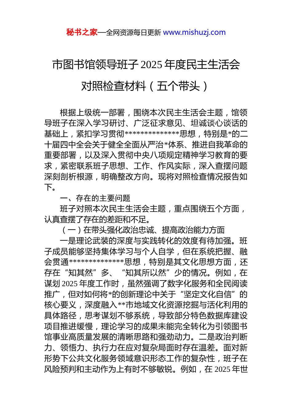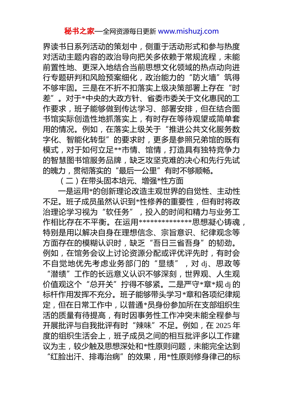 秘书之家—全网资源每日更新 www.mishuzj.com市图书馆领导班子 2025 年度民主生活会对照检查材料(五个带头)根据上级统一部署,围绕本次民主生活会主题,馆领导班子在深入学习研讨、广泛征求意见、坦诚谈心谈话的基础上,紧扣学习贯彻**************思想,特别是*的二十届四中全会关于健全全面从严治*体系、推进自我革命的重要部署,以及深入贯彻中央八项规定精神学习教育的要求,紧密联系班子思想、工作、作风实际,深入查摆问题深刻剖析根源,明确整改方向。现将对照检查情况报告如下。一、存在的主要问题班子对照本次民主生活会主题,重点围绕五个方面,认真查摆了存在的差距和不足。(一)在带头强化政治忠诚、提高政治能力方面一是理论武装的深度与实践转化的效度有待加强。班子成员能够坚持集体学习与个人自学,但在系统把握、融会贯通**************思想,特别是其文化思想方面,还存在“知其然”多、“知其所以然”少的情况。例如,在谋划 2025 年度工作时,虽然强调了数字化服务和全民阅读推广,但对如何将*的创新理论中关于“坚定文化自信”的核心要义,深度融入**市地域文化资源挖掘与活化利用的具体路径,思考谋划不够系统,导致部分特色数据库建设项目推进缓慢,理论学习的成果未能完全转化为引领图书馆事业高质量发展的清晰思路和强劲动力。二是政治判断力、领悟力、执行力在应对复杂局面时存在温差。面对新形势下公共文化服务领域意识形态工作的复杂性,班子在风险预判和主动作为上有时不够敏锐。例如,在 2025 年世秘书之家—全网资源每日更新 www.mishuzj.com界读书日系列活动的策划中,侧重于活动形式和参与热度对活动主题内容的政治导向把关多依赖于常规流程,未能前置性地、更深入地结合当前思想文化领域的热点动向进行专题研判和风险预案细化,政治能力的“防火墙”筑得不够牢固。三是在不折不扣落实上级决策部署上存在“时差”。对于*中央的大政方针、省委市委关于文化惠民的工作要求,班子能够做到传达学习、部署安排,但在结合图书馆实际创造性地抓落实上,有时存在等待观望或简单套用的情况。例如,在落实上级关于“推进公共文化服务数字化、智能化转型”的要求时,更多是参照兄弟馆的既有模式,对于如何立足**市情、馆情,打造具有独特竞争力的智慧图书馆服务品牌,缺乏攻坚克难的决心和先行先试的魄力,贯彻落实的“最后一公里”有时不够顺畅。(二)在带头固本培元、增强*性方面一是运用*的创新理论改造主观世界的自觉性、主动性不足。班子成员虽然认识到*性修养的重要性,但有时将政治理论学习视为“软任务”,投入的时间和精力与业务工作相比存在不平衡。在运用**************思想凝心铸魂,特别是用以解决自身在理想信念、宗旨意识、纪律观念等方面存在的模糊认识时,缺乏“吾日三省吾身”的韧劲。例如,在馆务会议上讨论资源分配或评优评先时,有时会不自觉地优先考虑业务部门的“显绩”,对 dj、思政等“潜绩”工作的长远意义认识不够深刻,世界观、人生观价值观这个“总开关”拧得不够紧。二是严守*章*规 dj 的标杆作用发挥不充分。班子能够带头学习*章和各项纪律规定,但在日常工作中,以普通*员身份参加所在支部组织生活的质量有待提高,有时因事务性工作冲突未能全程参与开展批评与自我批评有时“辣味”不足。例如,在 2025 年度的组织生活会上,班子成员之间的相互批评多以工作建议为主,较少触及思想深处和*性原则问题,未能完全达到“红脸出汗、排毒治病”的效果,用*性原则修身律己的标秘书之家—全网资源每日更新 www.mishuzj.com尺定得不够高。三是弘扬共产*人优良作风的示范引领有差距。面对图书馆事业发展的新挑战和读者日益增长的新需求,班子有时存在求稳怕乱的思想,艰苦奋斗、开拓创新的锐气有所减弱。例如,在推进内部管理第二轮改革的过程中,面对部分干部职工因岗位调整产生的思想波动,班子成员更多的是进行政策解释和安抚,未能及时、深入地从坚定理想信念、强化奉献精神的角度进行思想引导和*性教育,将解决思想问题与解决实际问题相结合的功夫下得不够深。(三)在带头敬畏人民、敬畏组织、敬畏法纪方面一...