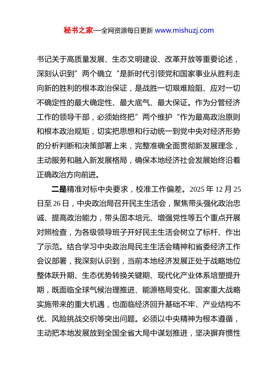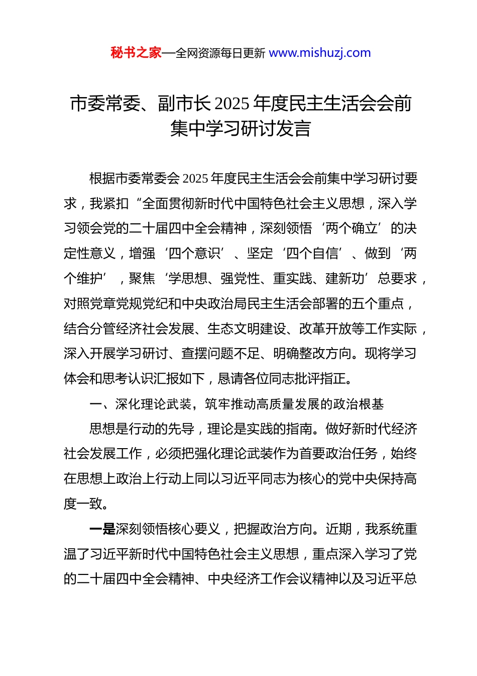 秘书之家—全网资源每日更新 www.mishuzj.com市委常委、副市长 2025 年度民主生活会会前集中学习研讨发言 根据市委常委会 2025 年度民主生活会会前集中学习研讨要求,我紧扣“全面贯彻新时代中国特色社会主义思想,深入学习领会党的二十届四中全会精神,深刻领悟‘两个确立’的决定性意义,增强‘四个意识’、坚定‘四个自信’、做到‘两个维护’,聚焦‘学思想、强党性、重实践、建新功’总要求,对照党章党规党纪和中央政治局民主生活会部署的五个重点,结合分管经济社会发展、生态文明建设、改革开放等工作实际,深入开展学习研讨、查摆问题不足、明确整改方向。现将学习体会和思考认识汇报如下,恳请各位同志批评指正。一、深化理论武装,筑牢推动高质量发展的政治根基思想是行动的先导,理论是实践的指南。做好新时代经济社会发展工作,必须把强化理论武装作为首要政治任务,始终在思想上政治上行动上同以习近平同志为核心的党中央保持高度一致。一是深刻领悟核心要义,把握政治方向。近期,我系统重温了习近平新时代中国特色社会主义思想,重点深入学习了党的二十届四中全会精神、中央经济工作会议精神以及习近平总秘书之家—全网资源每日更新 www.mishuzj.com书记关于高质量发展、生态文明建设、改革开放等重要论述,深刻认识到”两个确立“是新时代引领党和国家事业从胜利走向新的胜利的根本政治保证,是战胜一切艰难险阻、应对一切不确定性的最大确定性、最大底气、最大保证。作为分管经济工作的领导干部,必须始终把”两个维护“作为最高政治原则和根本政治规矩,切实把思想和行动统一到党中央对经济形势的分析判断和决策部署上来,完整准确全面贯彻新发展理念,主动服务和融入新发展格局,确保本地经济社会发展始终沿着正确政治方向前进。二是精准对标中央要求,校准工作偏差。2025 年 12 月 25日至 26 日,中央政治局召开民主生活会,聚焦带头强化政治忠诚、提高政治能力,带头固本培元、增强党性等五个重点开展对照检查,为各级领导班子开好民主生活会树立了标杆、作出了示范。结合学习中央政治局民主生活会精神和省委经济工作会议部署,我深刻认识到,当前本地经济发展正处于战略地位整体跃升期、生态优势转换关键期、现代化产业体系培塑提升期,既面临全球气候治理推进、能源格局变化、国家重大战略实施带来的重大机遇,也面临经济回升基础不牢、产业结构不优、风险挑战交织等突出问题。必须以中央精神为根本遵循,主动把本地发展放到全国全省大局中谋划推进,坚决摒弃惯性秘书之家—全网资源每日更新 www.mishuzj.com思维和路径依赖,以理论清醒保证政治坚定,以思想自觉引领行动自觉,切实把学习成果转化为推动经济高质量发展的实际成效。三是坚持学用结合贯通,提升履职能力。习近平总书记在中央经济工作会议上的重要讲话,通篇贯穿马克思主义认识论、实践论、方法论,为做好当前和今后一个时期经济工作指明了方向、提供了遵循。我坚持把学习贯彻中央精神与落实市委全会部署、推动分管领域工作结合起来,一体把握、融会贯通,重点围绕构建现代化产业体系、培育新质生产力、推动生态价值转化等重大课题开展调研思考,努力把学习成效体现到把握发展规律、破解发展难题、提升发展质效上,不断增强从政治上看经济、抓经济的能力,提高运用党的创新理论指导实践、推动工作的水平。二、聚焦主责主业,盘点经济社会发展工作成效与不足2025 年以来,在市委坚强领导下,我始终坚持稳中求进工作总基调,更好统筹发展和安全,聚焦高质量发展这一首要任务,牵头推进产业升级、生态保护、改革开放、民生保障等重点工作,经济社会发展呈现稳中有进、逐绿向新、扩量提质的良好态势,但也存在一些不容忽视的问题和短板。(一)工作推进成效秘书之家—全网资源每日更新 www.mishuzj.com一是经济运行态势总体平稳。面对严峻复杂的国内外形势,牵头制定稳经济一揽子政策及接续措施,强化政策协同发力,着力稳就业、稳企业、稳市场、稳预期。全年地区生产总值同比增长*%,固定资产投资增长*%,社会消费品零售总额增长*%,一般公共预算收入增长*%,主要经济指标保持在...