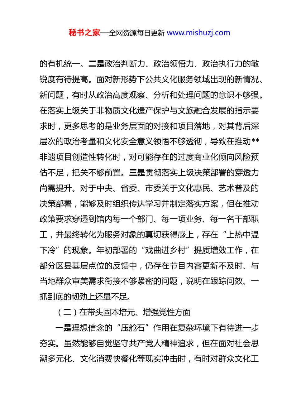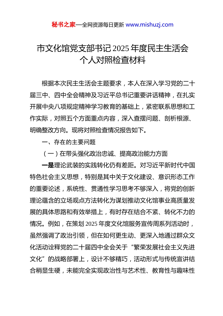 秘书之家—全网资源每日更新 www.mishuzj.com市文化馆党支部书记 2025 年度民主生活会个人对照检查材料 根据本次民主生活会主题要求,本人在深入学习党的二十届三中、四中全会精神及习近平总书记重要讲话精神,在扎实开展中央八项规定精神学习教育的基础上,紧密联系思想和工作实际,对照五个方面重点内容,深入查摆问题、剖析根源、明确整改方向。现将对照检查情况报告如下。一、存在的主要问题(一)在带头强化政治忠诚、提高政治能力方面一是理论武装的实践转化仍有差距。对习近平新时代中国特色社会主义思想,特别是其中关于文化建设、意识形态工作的重要论述,系统性、贯通性学习思考不够深入,将党的创新理论蕴含的立场观点方法转化为谋划推动文化馆事业高质量发展的具体思路和有效举措上,有时存在结合不紧、转化不力的情况。例如,在策划 2025 年度文化馆服务宣传周系列活动时,虽然强调了政治引领,但在如何更生动、更深入地通过群众文化活动诠释党的二十届四中全会关于“繁荣发展社会主义先进文化”的战略部署上,设计不够精巧,活动形式与传统宣讲结合稍显生硬,未能完全实现政治性与艺术性、教育性与趣味性秘书之家—全网资源每日更新 www.mishuzj.com的有机统一。二是政治判断力、政治领悟力、政治执行力的敏锐度有待提高。面对新形势下公共文化服务领域出现的新情况、新问题,有时从政治高度观察、分析和处理问题的意识不够强。在落实上级关于非物质文化遗产保护与文旅融合发展的指示要求时,更多思考的是业务层面的对接和项目落地,对其背后深层次的政治考量和文化安全意义领悟不够透彻,导致在推动**非遗项目创造性转化时,对可能存在的过度商业化倾向风险预估不足,把关不够前置。三是贯彻落实上级决策部署的穿透力尚需提升。对于中央、省委、市委关于文化惠民、艺术普及的决策部署,能够及时组织传达学习并制定落实方案,但在推动政策要求穿透到馆内每一个部门、每一项业务、每一名干部职工,并最终转化为服务对象的真切获得感上,存在“上热中温下冷”的现象。年初部署的“戏曲进乡村”提质增效工作,在部分区县基层点位的反馈中,仍存在节目内容更新不及时、与当地群众审美需求衔接不够紧密的问题,说明在跟踪问效、一抓到底的韧劲上还显不足。(二)在带头固本培元、增强党性方面一是理想信念的“压舱石”作用在复杂环境下有待进一步夯实。虽然能够自觉坚守共产党人精神追求,但在面对社会思潮多元化、文化消费快餐化等现实冲击时,有时对群众文化工秘书之家—全网资源每日更新 www.mishuzj.com作“以文化人、以文育人”根本功能的长期性和艰巨性认识产生波动,偶尔会产生“精品创作不如热点活动见效快”的功利化念头。在组织年度文艺精品创作扶持项目评审时,曾一度过于关注作品短期内可能带来的社会反响和获奖概率,对部分扎根基层、反映时代但艺术手法相对传统的作品扶持力度有所犹豫,这实质上是对文化工作内在规律和党性要求把握不够坚定的表现。二是党性修养的日常锤炼不够严格自觉。能够参加组织生活,完成学习任务,但将党性要求融入日常言行、化为自觉习惯的主动性有欠缺。例如,在馆内业务研讨中,有时过于强调专业见解,对于不同意见虽然能够听取,但内心深处未能完全做到闻过则喜、从善如流,批评和自我批评的武器运用得不够经常、不够有力,尤其是在非正式场合,存在“好人主义”思想,对个别同志工作中出现的标准不高、效率偏低等问题,提醒、批评不够直接、不够及时。三是宗旨意识在具体服务中未能完全贯穿始终。虽然主观上坚持为人民服务,但在设计公共文化服务产品时,有时习惯于从供给方角度思考“我们有什么”“我们能提供什么”,深入调研、精准把握不同年龄、不同群体市民,特别是**社区老年群体、**园区青年职工差异化、个性化文化需求的功夫下得不够深。今年推出的“市民夜校”部分课程,前期宣传火爆,但中期出现部分学员出勤率下秘书之家—全网资源每日更新 www.mishuzj.com滑的情况,事后分析发现,课程内容与部分学员的实际接受能力、时间安排存在脱节,这正是以人民为中心的发展思想在微观层面落实不到位的反映。(三)...