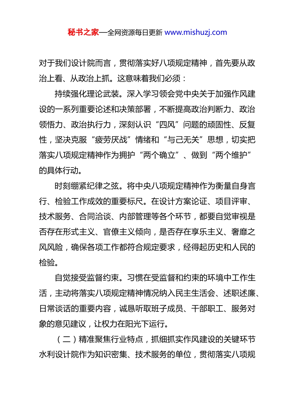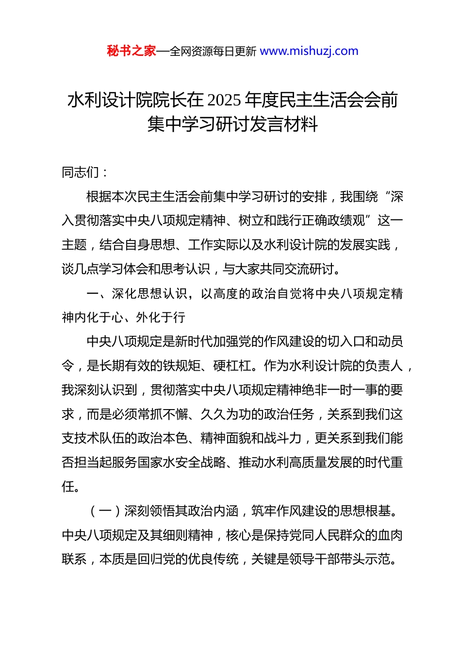 秘书之家—全网资源每日更新 www.mishuzj.com水利设计院院长在 2025 年度民主生活会会前集中学习研讨发言材料 同志们:根据本次民主生活会前集中学习研讨的安排,我围绕“深入贯彻落实中央八项规定精神、树立和践行正确政绩观”这一主题,结合自身思想、工作实际以及水利设计院的发展实践,谈几点学习体会和思考认识,与大家共同交流研讨。一、深化思想认识,以高度的政治自觉将中央八项规定精神内化于心、外化于行中央八项规定是新时代加强党的作风建设的切入口和动员令,是长期有效的铁规矩、硬杠杠。作为水利设计院的负责人,我深刻认识到,贯彻落实中央八项规定精神绝非一时一事的要求,而是必须常抓不懈、久久为功的政治任务,关系到我们这支技术队伍的政治本色、精神面貌和战斗力,更关系到我们能否担当起服务国家水安全战略、推动水利高质量发展的时代重任。(一)深刻领悟其政治内涵,筑牢作风建设的思想根基。中央八项规定及其细则精神,核心是保持党同人民群众的血肉联系,本质是回归党的优良传统,关键是领导干部带头示范。秘书之家—全网资源每日更新 www.mishuzj.com对于我们设计院而言,贯彻落实好八项规定精神,首先要从政治上看、从政治上抓。这意味着我们必须:持续强化理论武装。深入学习领会党中央关于加强作风建设的一系列重要论述和决策部署,不断提高政治判断力、政治领悟力、政治执行力,深刻认识“四风”问题的顽固性、反复性,坚决克服“疲劳厌战”情绪和“与己无关”思想,切实把落实八项规定精神作为拥护“两个确立”、做到“两个维护”的具体行动。时刻绷紧纪律之弦。将中央八项规定精神作为衡量自身言行、检验工作成效的重要标尺。在设计方案论证、项目评审、技术服务、合同洽谈、内部管理等各个环节,都要自觉审视是否存在形式主义、官僚主义倾向,是否存在享乐主义、奢靡之风风险,确保各项工作都符合规定要求,经得起历史和人民的检验。自觉接受监督约束。习惯在受监督和约束的环境中工作生活,主动将落实八项规定精神情况纳入民主生活会、述职述廉、日常谈话的重要内容,诚恳听取班子成员、干部职工、服务对象的意见建议,让权力在阳光下运行。(二)精准聚焦行业特点,抓细抓实作风建设的关键环节水利设计院作为知识密集、技术服务的单位,贯彻落实八项规秘书之家—全网资源每日更新 www.mishuzj.com定精神必须紧密结合行业实际,找准风险点和着力点。力戒科研设计领域的形式主义。要坚决防止为了“出成果”“快出图”而简化必要程序、降低技术标准;防止在项目论证中脱离实际、盲目追求技术“高大上”而忽视经济合理性和工程可实施性;防止在技术评审中搞“人情评审”“关系评审”。必须弘扬科学严谨、求真务实的精神,把每一份图纸、每一份报告都打造成精品。严防技术服务中的官僚主义。要坚决杜绝“衙门”作风,深入项目一线、工程现场,了解业主需求,解决技术难题,不能坐在办公室里“闭门造车”;要优化服务流程,提高办事效率,不能推诿扯皮、拖延塞责;要在对外交往中坚守职业操守和廉洁底线,构建“亲”“清”合作关系。严守财经纪律和廉洁规定。严格遵守科研经费、项目管理费、差旅费、业务接待费等各项开支标准和管理规定,坚决杜绝违规支出、变相开支。在办公用房、公务用车等方面严格执行标准。班子成员尤其要以身作则,带头勤俭节约,反对铺张浪费,营造风清气正的院风。(三)健全长效常治机制,推动作风建设走深走实。落实中央八项规定精神,既要靠思想自觉,也要靠制度保障。设计院必须扎紧制度笼子,强化刚性约束。秘书之家—全网资源每日更新 www.mishuzj.com完善制度体系。对照中央最新精神和上级要求,定期梳理修订院内在作风建设、廉洁从业、财务管理、项目管理等方面的规章制度,使制度更加精准严密、可操作性强。强化制度执行。加强对制度执行情况的监督检查,严肃查处各类违反中央八项规定精神的行为,无论涉及到谁,都要一查到底,绝不姑息。要运用好监督执纪“四种形态”,抓早抓小,防微杜渐。培育廉洁文化。将廉洁文化建设融入设计院文化建设和日常管理,加强警示教育,用身边事教育身边人,引导广大干部职...