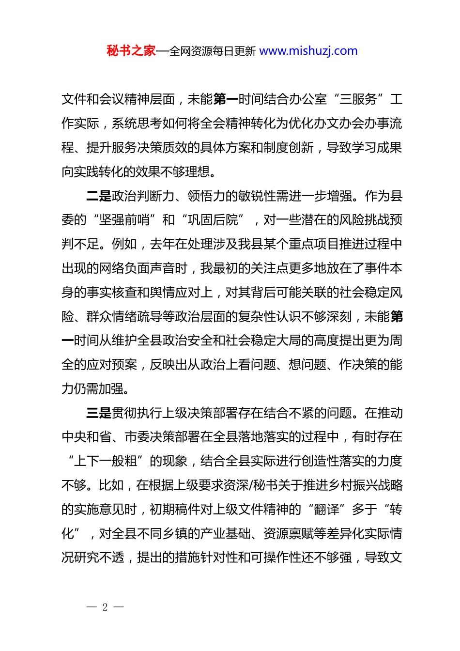 秘书之家—全网资源每日更新 www.mishuzj.com县委办主任 2025 年度民主生活会对照检查发言材料根据县委关于召开 2025 年度民主生活会的统一安排和部署,我紧扣本次民主生活会主题,深入学习了**************思想、*的二十届三中、四中全会精神以及******系列重要讲话和****批示精神,并围绕深入贯彻中央八项规定精神学习教育,通过群众提、自己找、上级点、互相帮等多种方式,广泛征求了各方意见。在此基础上,我聚焦“五个带头”,深入查摆自身存在的问题,深刻剖析问题根源,明确了今后的努力方向和整改措施。现将个人对照检查情况报告如下。一、存在的主要问题对照本次民主生活会主题和“五个带头”的具体要求,我坚持把自己摆进去、把职责摆进去、把工作摆进去,进行了深刻的自我检视和反思。(一)在带头强化政治忠诚、提高政治能力方面一是理论学习的系统性、连贯性不足。虽然能够坚持参加县委理论学习中心组学习,但有时满足于完成“规定动作”,在学懂弄通做实**************思想上还存在差距。例如,在学习*的二十届四中全会的重大决策部署时,更多地停留在通读— 1 —秘书之家—全网资源每日更新 www.mishuzj.com文件和会议精神层面,未能第一时间结合办公室“三服务”工作实际,系统思考如何将全会精神转化为优化办文办会办事流程、提升服务决策质效的具体方案和制度创新,导致学习成果向实践转化的效果不够理想。二是政治判断力、领悟力的敏锐性需进一步增强。作为县委的“坚强前哨”和“巩固后院”,对一些潜在的风险挑战预判不足。例如,去年在处理涉及我县某个重点项目推进过程中出现的网络负面声音时,我最初的关注点更多地放在了事件本身的事实核查和舆情应对上,对其背后可能关联的社会稳定风险、群众情绪疏导等政治层面的复杂性认识不够深刻,未能第一时间从维护全县政治安全和社会稳定大局的高度提出更为周全的应对预案,反映出从政治上看问题、想问题、作决策的能力仍需加强。三是贯彻执行上级决策部署存在结合不紧的问题。在推动中央和省、市委决策部署在全县落地落实的过程中,有时存在“上下一般粗”的现象,结合全县实际进行创造性落实的力度不够。比如,在根据上级要求资深/秘书关于推进乡村振兴战略的实施意见时,初期稿件对上级文件精神的“翻译”多于“转化”,对全县不同乡镇的产业基础、资源禀赋等差异化实际情况研究不透,提出的措施针对性和可操作性还不够强,导致文— 2 —秘书之家—全网资源每日更新 www.mishuzj.com件在指导实践时效果打了折扣。(二)在带头固本培元、增强*性方面一是*性锻炼的主动性、自觉性有所减弱。日常忙于大量的会务组织、文稿资深/秘书、督查督办等具体事务,静下心来反躬自省、加强*性修养的时间相对减少。有时以工作忙为借口,参加*支部组织生活不够积极主动,与支部*员的谈心谈话多是围绕工作,深入了解思想动态、帮助解决实际困难方面做得不够,未能完全做到以普通*员身份接受*组织的教育和监督。二是批评与自我批评的“辣味”不足。在民主生活会或组织生活会上,有时存在“好人主义”思想,批评同志时多是谈工作建议,怕伤和气、怕影响团结,没有真正做到“红脸出汗、排毒治病”。比如,在一次讨论办公室内部工作流程优化的会议上,对个别同志办事拖沓、效率不高的问题,我没有当面严厉指出,而是采取了比较委婉的方式提醒,导致问题未能得到及时有效的纠正。三是艰苦奋斗的优良传统有所淡化。随着工作条件的改善,思想上不自觉地放松了对自己的严格要求。虽然能够严格遵守中央八项规定精神但在一些细节上做得还不够好。例如,在组织全县性大型会议时,有时会下意识地追求会场布置的“高标准”,对一些不必要的开支把关不严,虽然没有超标,但与— 3 —秘书之家—全网资源每日更新 www.mishuzj.com“过紧日子”的要求相比,还有节约的空间。(三)在带头敬畏人民、敬畏组织、敬畏法纪方面一是调查研究存在“走马观花”现象。虽然经常下基层,但多数是陪同领导调研或开展专项督查真正带着问题、扑下身子、解剖麻雀式的深入调研较少。比如,去年在对全县“放管服”改革推进情况进行督查时,更多的是...
