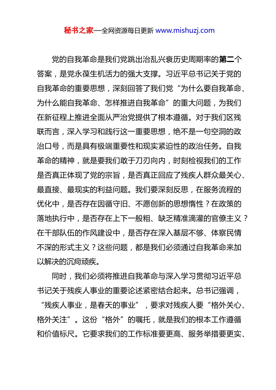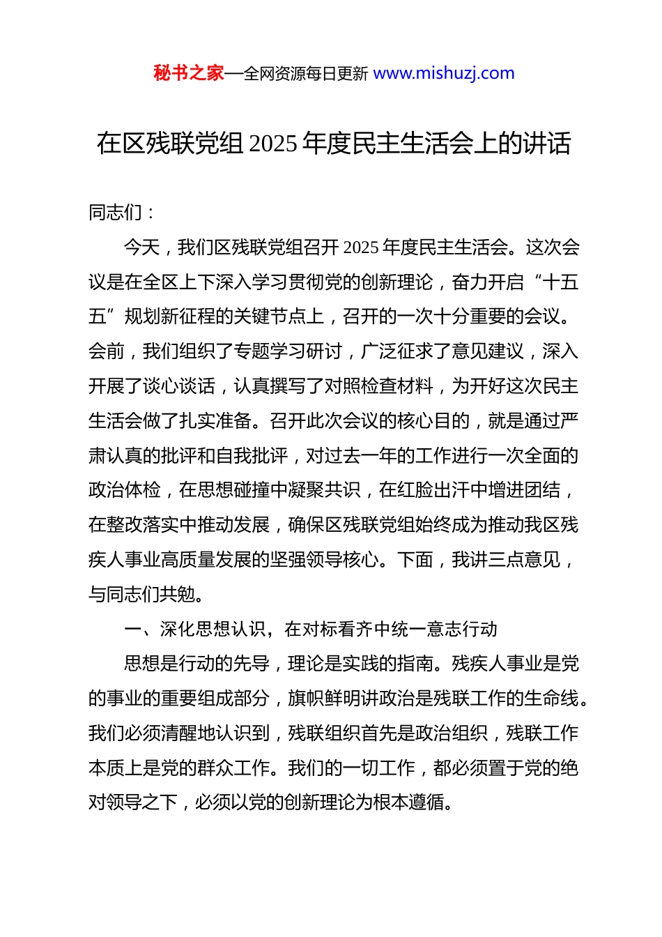秘书之家—全网资源每日更新 www.mishuzj.com在区残联党组 2025 年度民主生活会上的讲话 同志们:今天,我们区残联党组召开 2025 年度民主生活会。这次会议是在全区上下深入学习贯彻党的创新理论,奋力开启“十五五”规划新征程的关键节点上,召开的一次十分重要的会议。会前,我们组织了专题学习研讨,广泛征求了意见建议,深入开展了谈心谈话,认真撰写了对照检查材料,为开好这次民主生活会做了扎实准备。召开此次会议的核心目的,就是通过严肃认真的批评和自我批评,对过去一年的工作进行一次全面的政治体检,在思想碰撞中凝聚共识,在红脸出汗中增进团结,在整改落实中推动发展,确保区残联党组始终成为推动我区残疾人事业高质量发展的坚强领导核心。下面,我讲三点意见,与同志们共勉。一、深化思想认识,在对标看齐中统一意志行动思想是行动的先导,理论是实践的指南。残疾人事业是党的事业的重要组成部分,旗帜鲜明讲政治是残联工作的生命线。我们必须清醒地认识到,残联组织首先是政治组织,残联工作本质上是党的群众工作。我们的一切工作,都必须置于党的绝对领导之下,必须以党的创新理论为根本遵循。秘书之家—全网资源每日更新 www.mishuzj.com党的自我革命是我们党跳出治乱兴衰历史周期率的第二个答案,是党永葆生机活力的强大支撑。习近平总书记关于党的自我革命的重要思想,深刻回答了我们党“为什么要自我革命、为什么能自我革命、怎样推进自我革命”的重大问题,为我们在新征程上推进全面从严治党提供了根本遵循。对于我们区残联而言,深入学习和践行这一重要思想,绝不是一句空洞的政治口号,而是具有极端重要性和现实紧迫性的政治任务。自我革命的精神,就是要我们敢于刀刃向内,时刻检视我们的工作是否真正体现了党的宗旨,是否真正回应了残疾人群众最关心、最直接、最现实的利益问题。我们要深刻反思,在服务流程的优化中,是否存在因循守旧、不愿创新的思想惰性?在政策的落地执行中,是否存在上下一般粗、缺乏精准滴灌的官僚主义?在干部队伍的作风建设中,是否存在深入基层不够、体察民情不深的形式主义?这些问题,都是我们必须通过自我革命来加以解决的沉疴顽疾。同时,我们必须将推进自我革命与深入学习贯彻习近平总书记关于残疾人事业的重要论述紧密结合起来。总书记强调,“残疾人事业,是春天的事业”,要求对残疾人要“格外关心、格外关注”。这份“格外”的嘱托,就是我们的根本工作遵循和价值标尺。它要求我们的工作标准要更高、服务举措要更实、秘书之家—全网资源每日更新 www.mishuzj.com情感投入要更深。我们要以自我革命的精神,不断审视我们的工作是否达到了这份“格外”的要求。例如,我们建设了区残疾人综合服务中心,推出了“一人一策”精准服务模式,这是我们践行“格外”要求的具体体现。但我们更要思考,服务中心的覆盖面是否足够广?“一人一策”的精细化程度是否足够高?在面对残疾人日益增长的多元化、个性化需求时,我们的服务供给是否还存在短板和不足?这些都需要我们以彻底的自我革命精神,不断进行自我净化、自我完善、自我革新、自我提高。《中国共产党章程》是全党必须共同遵守的根本行为规范我们每一位党员领导干部,都必须把学习党章、遵守党章、贯彻党章、维护党章作为终身课题。要时常用党章这面镜子来对照自己的一言一行,严守权力边界,规范权力运行,做到公正用权、依法用权、廉洁用权,永葆共产党人的政治本色。要把对党章的尊崇内化于心、外化于行,将其作为谋划我区残疾人事业发展的根本依据,确保事业发展的每一个环节、每一项决策,都经得起历史、实践和人民的检验。二、坚持问题导向,在检视剖析中深化自我革命开好民主生活会,关键在于是否能够真正做到直面问题、揭短亮丑。成绩不讲跑不了,问题不讲不得了。过去一年,在秘书之家—全网资源每日更新 www.mishuzj.com区委区政府的坚强领导下,我区残疾人事业取得了长足进步,康复、教育、就业、维权、文化体育等各项工作都迈上了新台阶,残疾人群众的获得感、幸福感、安全感持续增强。这些成绩的取得,是全体残联干部职工共同努力奋斗的结果。但我...