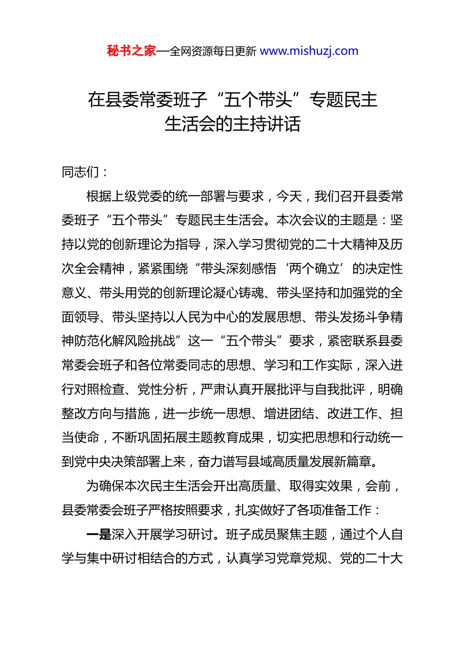秘书之家—全网资源每日更新 www.mishuzj.com在县委常委班子“五个带头”专题民主生活会的主持讲话 同志们:根据上级党委的统一部署与要求,今天,我们召开县委常委班子“五个带头”专题民主生活会。本次会议的主题是:坚持以党的创新理论为指导,深入学习贯彻党的二十大精神及历次全会精神,紧紧围绕“带头深刻感悟‘两个确立’的决定性意义、带头用党的创新理论凝心铸魂、带头坚持和加强党的全面领导、带头坚持以人民为中心的发展思想、带头发扬斗争精神防范化解风险挑战”这一“五个带头”要求,紧密联系县委常委会班子和各位常委同志的思想、学习和工作实际,深入进行对照检查、党性分析,严肃认真开展批评与自我批评,明确整改方向与措施,进一步统一思想、增进团结、改进工作、担当使命,不断巩固拓展主题教育成果,切实把思想和行动统一到党中央决策部署上来,奋力谱写县域高质量发展新篇章。为确保本次民主生活会开出高质量、取得实效果,会前,县委常委会班子严格按照要求,扎实做好了各项准备工作:一是深入开展学习研讨。班子成员聚焦主题,通过个人自学与集中研讨相结合的方式,认真学习党章党规、党的二十大秘书之家—全网资源每日更新 www.mishuzj.com报告、系列重要讲话精神和关于严肃党内政治生活的重要论述,以及党中央关于民主生活会的相关要求,进一步深化认识、提高站位、凝聚共识,切实增强政治判断力、政治领悟力、政治执行力,为开好民主生活会筑牢坚实思想基础。二是广泛征集意见建议。坚持开门纳谏,通过召开座谈会、发放征求意见表、设置意见箱、个别访谈、新媒体平台留言等多种形式,广泛听取各乡镇(街道)、县直各部门单位、部分“两代表一委员”、老干部代表、基层党员干部和群众代表的意见建议,并对征集到的意见原汁原味梳理汇总,分类整理,及时反馈给班子及每位成员,确保问题找得准、根源挖得深。三是深入开展谈心谈话。严格落实“四必谈”要求,主要负责同志与班子成员、班子成员相互之间、班子成员与分管单位主要负责同志、班子成员与本人组织关系所在党支部党员代表均开展了深入谈心谈话,交流思想、沟通情况、指出不足、提出建议,真正做到把问题谈开、把思想谈通、把意见谈实,达到了增进了解、加深信任、化解矛盾、形成合力的目的。四是认真撰写对照检查材料。班子和各位常委同志紧扣“五个带头”要求,坚持问题导向,严格对照检查,把自己摆进去、把职责摆进去、把工作摆进去,深入查找突出问题,深刻剖析问题根源,明确努力方向和整改措施,认真撰写对照检秘书之家—全网资源每日更新 www.mishuzj.com查材料和个人发言提纲,反复修改完善,并按程序报审,为开展批评和自我批评作了充分准备。本次会议主要有五项议程:第一项议程,由我代表县委常委班子作对照检查发言,全面查摆班子在“五个带头”方面存在的主要问题和不足,深刻剖析原因,提出整改措施。第二项议程,县委常委班子成员逐一作个人对照检查发言。每位同志发言后,其他常委同志要本着对组织、对事业、对同志高度负责的态度,开诚布公、实事求是地提出批评意见。第三项议程,班子成员就所收到的批评意见进行表态发言,表明虚心接受的态度和认真整改的决心。第四项议程,请到会指导的上级领导讲话(如有时)。我们将认真听取、深刻领会领导指示精神,抓好贯彻落实。第五项议程,由我代表县委常委会作会议总结,并就抓好后续整改落实工作提出明确要求。同志们,刚才,我代表班子作了对照检查,各位常委同志分别作了深刻的个人对照检查,并本着对党、对事业、对同志高度负责的态度,严肃认真地开展了批评与自我批评。大家的发言准备充分、思考深刻,紧扣会议主题,坚持问题导向,查摆问题实事求是,剖析原因深入透彻,相互批评出于公心、坦秘书之家—全网资源每日更新 www.mishuzj.com诚相见,体现了党内政治生活的政治性、时代性、原则性、战斗性,达到了统一思想、增进团结、改进工作的目的,实现了“团结—批评—团结”的预期成效。方才,**同志代表上级党委作了指导讲话,充分肯定本次民主生活会主题鲜明、程序规范、组织周密,查摆问题深入,批评与自我批评严肃认真...