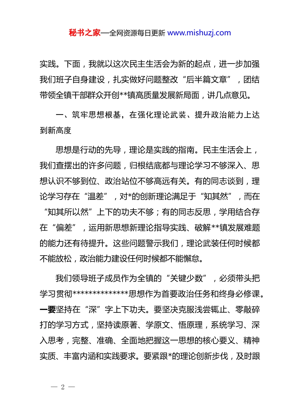 秘书之家—全网资源每日更新 www.mishuzj.com在镇*政领导班子 2025 年度民主生活会上的总结讲话同志们:今天,我们在这里召开了一次严肃认真、富有成效的 2025年度民主生活会。会议紧扣学习贯彻**************思想,全面落实*的二十届四中全会和******考察四川重要讲话精神这一主题,班子成员之间开诚布公、坦诚相见,进行了一次积极健康的思想交流和深入彻底的*性洗礼。刚才,大家紧密联系个人思想和工作实际,深入查摆问题,深刻剖析根源,严肃认真地开展了批评和自我批评。自我批评时,大家都能刀刃向内、揭短亮丑;相互批评时,都能出于公心、直截了当,达到了“红脸出汗、排毒治病”的效果,实现了增进团结、改进工作、担当使命的目的。县委第二督导组的同志全程到会指导,对我们会议的召开给予了充分肯定,并提出了明确的、具有很强指导性的要求,我们必须深刻领会、认真抓好落实。总的来看,这次民主生活会准备工作扎实充分,查摆剖析触及灵魂,相互批评动真碰硬,整改措施具体务实,是一次高质量的*内政治生活— 1 —秘书之家—全网资源每日更新 www.mishuzj.com实践。下面,我就以这次民主生活会为新的起点,进一步加强我们班子自身建设,扎实做好问题整改“后半篇文章”,团结带领全镇干部群众开创**镇高质量发展新局面,讲几点意见。一、筑牢思想根基,在强化理论武装、提升政治能力上达到新高度思想是行动的先导,理论是实践的指南。民主生活会上,我们查摆出的许多问题,归根结底都与理论学习不够深入、思想认识不够到位、政治站位不够高远有关。有的同志谈到,理论学习存在“温差”,对*的创新理论满足于“知其然”,而在“知其所以然”上下的功夫不够;有的同志反思,学用结合存在“偏差”,运用新思想新理论指导实践、破解**镇发展难题的能力还有待提升。这些问题警示我们,理论武装任何时候都不能放松,政治能力建设任何时候都不能懈怠。我们领导班子成员作为全镇的“关键少数”,必须带头把学习贯彻**************思想作为首要政治任务和终身必修课。一要坚持在“深”字上下功夫。要坚决克服浅尝辄止、零敲碎打的学习方式,坚持读原著、学原文、悟原理,系统学习、深入思考,完整、准确、全面地把握这一思想的核心要义、精神实质、丰富内涵和实践要求。要紧跟*的理论创新步伐,及时跟— 2 —秘书之家—全网资源每日更新 www.mishuzj.com进学习******最新重要讲话和****批示精神,真正做到学深悟透、融会贯通。二要坚持在“信”字上铸忠诚。理论学习的最终目的是坚定理想信念。我们要通过持续深入的学习,不断增进对*的创新理论的政治认同、思想认同、理论认同、情感认同,深刻领悟“两个确立”的决定性意义,增强“四个意识”、坚定“四个自信”、做到“两个维护”,始终在思想上政治上行动上同以***同志为核心的*中央保持高度一致。三要坚持在“用”字上见实效。学习的目的全在于运用。我们要大力弘扬理论联系实际的马克思主义学风,自觉用*的创新理论观察新形势、研究新情况、解决新问题。要紧密结合**镇当前面临的乡村全面振兴、产业结构优化、民生服务保障、社会治理创新等中心工作,从*的科学理论中找遵循、找思路、找答案、找方法,切实把学习成果转化为推动**镇高质量发展的强大动力和生动实践,不断提高我们的政治判断力、政治领悟力、政治执行力。二、坚持问题导向,在狠抓整改落实、巩固会议成果上展现新作为开好民主生活会只是一个开端,解决问题才是根本。这次民主生活会,我们不仅对照检查了班子存在的共性问题,每位同志也都查摆了个人存在的突出问题,同志们之间也相互提出— 3 —秘书之家—全网资源每日更新 www.mishuzj.com了许多中肯的批评意见。对于这些问题,我们绝不能“闯关”思想作祟,开过会就万事大吉,必须以“钉钉子”的精神,一项一项抓好整改,一件一件落到实处,真正把民主生活会的成果体现在解决问题的实际成效上。首先,要建立“清单化”台账,做到责任全覆盖。会后,我们要迅速对查摆出的问题进行系统梳理,无论是班子的问题,还是个人的问题,无论是自己查摆的,还是同志们批评指出的,都要逐项建立整改台账。要...