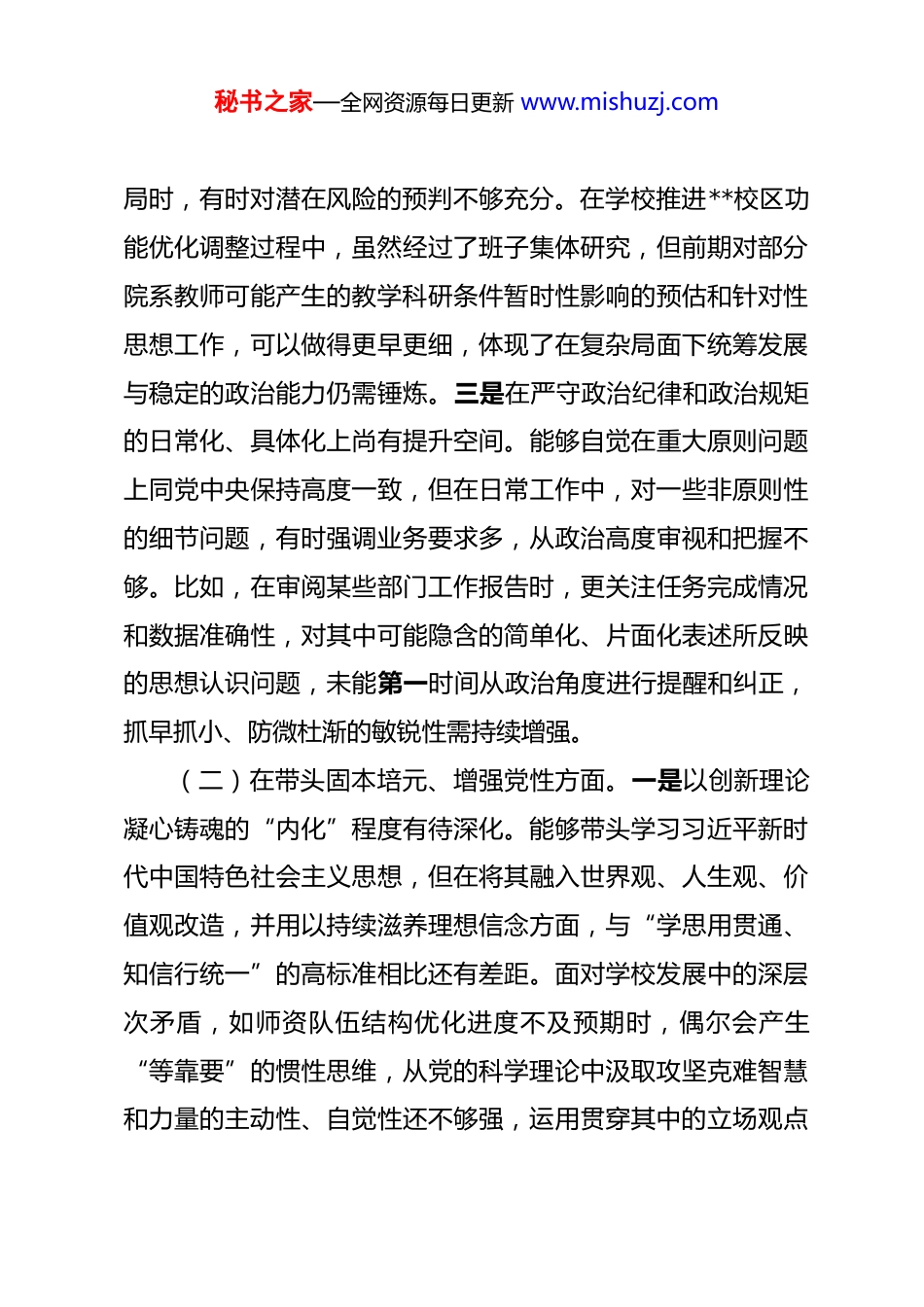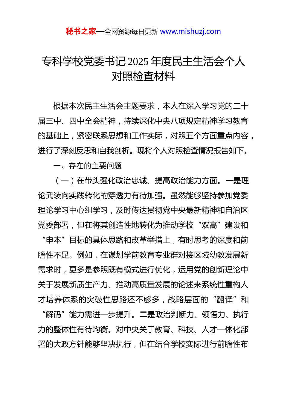 秘书之家—全网资源每日更新 www.mishuzj.com专科学校党委书记 2025 年度民主生活会个人对照检查材料 根据本次民主生活会主题要求,本人在深入学习党的二十届三中、四中全会精神,持续深化中央八项规定精神学习教育的基础上,紧密联系思想和工作实际,对照五个方面重点内容,进行了深刻反思和自我剖析。现将个人对照检查情况报告如下。一、存在的主要问题(一)在带头强化政治忠诚、提高政治能力方面。一是理论武装向实践转化的穿透力有待加强。虽然能够坚持参加党委理论学习中心组学习,及时传达贯彻党中央最新精神和自治区党委部署,但在将其创造性地转化为推动学校“双高”建设和“申本”目标的具体思路和改革举措上,有时思考的深度和前瞻性不足。例如,在谋划学前教育专业群对接区域幼教发展新需求时,更多是参照既有模式进行优化,运用党的创新理论中关于发展新质生产力、推动高质量发展的论述来系统性重构人才培养体系的突破性思路还不够多,战略层面的“翻译”和“解码”能力需进一步提升。二是政治判断力、领悟力、执行力的整体性有待均衡。对中央关于教育、科技、人才一体化部署的大政方针能够坚决执行,但在结合学校实际进行前瞻性布秘书之家—全网资源每日更新 www.mishuzj.com局时,有时对潜在风险的预判不够充分。在学校推进**校区功能优化调整过程中,虽然经过了班子集体研究,但前期对部分院系教师可能产生的教学科研条件暂时性影响的预估和针对性思想工作,可以做得更早更细,体现了在复杂局面下统筹发展与稳定的政治能力仍需锤炼。三是在严守政治纪律和政治规矩的日常化、具体化上尚有提升空间。能够自觉在重大原则问题上同党中央保持高度一致,但在日常工作中,对一些非原则性的细节问题,有时强调业务要求多,从政治高度审视和把握不够。比如,在审阅某些部门工作报告时,更关注任务完成情况和数据准确性,对其中可能隐含的简单化、片面化表述所反映的思想认识问题,未能第一时间从政治角度进行提醒和纠正,抓早抓小、防微杜渐的敏锐性需持续增强。(二)在带头固本培元、增强党性方面。一是以创新理论凝心铸魂的“内化”程度有待深化。能够带头学习习近平新时代中国特色社会主义思想,但在将其融入世界观、人生观、价值观改造,并用以持续滋养理想信念方面,与“学思用贯通、知信行统一”的高标准相比还有差距。面对学校发展中的深层次矛盾,如师资队伍结构优化进度不及预期时,偶尔会产生“等靠要”的惯性思维,从党的科学理论中汲取攻坚克难智慧和力量的主动性、自觉性还不够强,运用贯穿其中的立场观点秘书之家—全网资源每日更新 www.mishuzj.com方法分析和解决实际问题的能力有待提升。二是党性修养的主动性和常态化有所欠缺。有时将参加组织生活、完成学习任务视为“工作职责”,未能时时刻刻以党章党规党纪为镜,进行深刻的自我检视和党性分析。在推动“清廉学校”建设过程中,要求班子成员和各级干部严格自律多,但对照“君子检身,常若有过”的境界,主动将自己摆进去,深入查摆在学术资源分配、评奖评优等环节可能存在的“微权力”运行风险点并预先设防的意识和举措,还可以更加严格和周密。三是发扬斗争精神、增强斗争本领的自觉性不足。在原则问题上能够站稳立场,但在面对一些历史遗留问题或涉及多部门协调的难题时,有时存在“绕道走”或“求稳怕乱”的心态。例如,在推动跨系部教学资源整合共享时,遇到一些体制机制障碍和不同意见,虽然最终推动了解决,但过程中一度倾向于通过缓慢协调来化解矛盾,缺乏“啃硬骨头”的锐气和“钉钉子”的韧性,党员领导干部应有的历史主动精神发挥不充分。(三)在带头敬畏人民、敬畏组织、敬畏法纪方面。一是践行“四下基层”制度的深度和实效性有待拓展。虽然建立了基层联系点,也定期开展调研,但有时调研行程安排较满,与一线教师、辅导员、学生“坐下来”深入谈心的时间不够充裕,倾听“原汁原味”声音的耐心有所不足。2025 年秋季学期初的秘书之家—全网资源每日更新 www.mishuzj.com安全检查,虽然发现了**处硬件隐患并及时整改,但对学生反映的宿舍区网络信号不稳定等影响学习生活的“软性”...