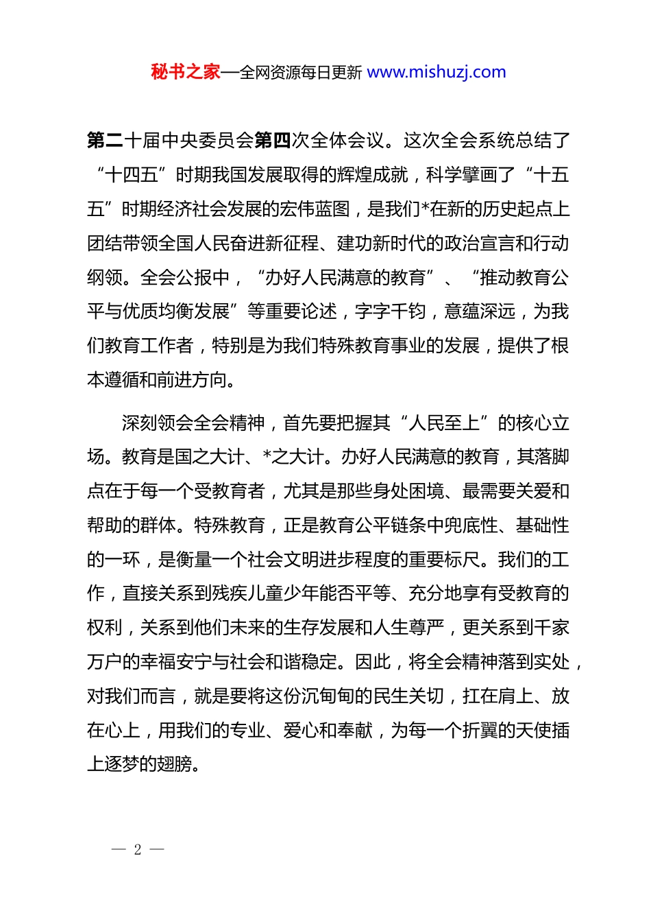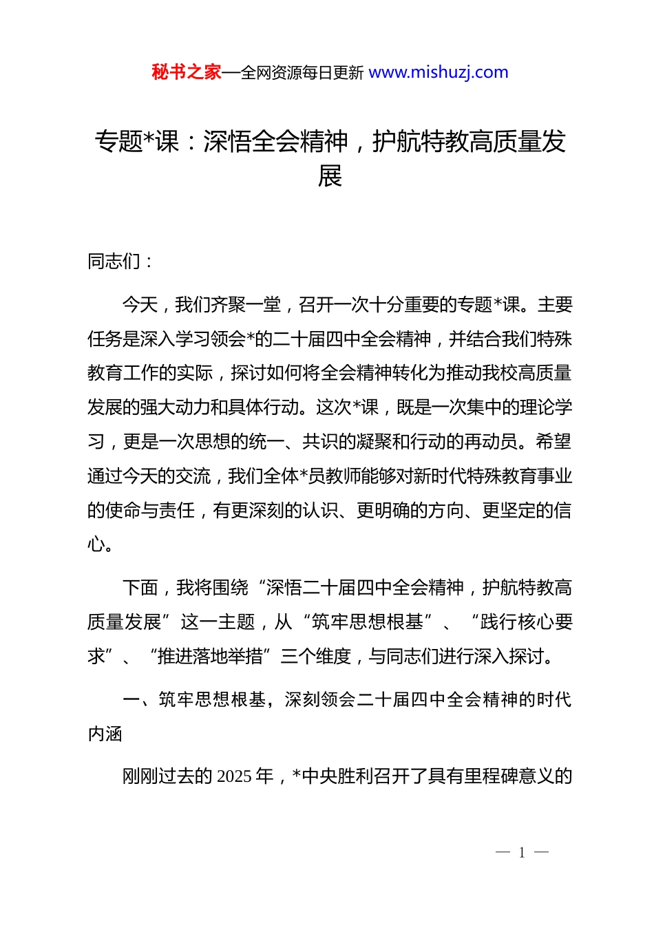 秘书之家—全网资源每日更新 www.mishuzj.com专题*课:深悟全会精神,护航特教高质量发展同志们:今天,我们齐聚一堂,召开一次十分重要的专题*课。主要任务是深入学习领会*的二十届四中全会精神,并结合我们特殊教育工作的实际,探讨如何将全会精神转化为推动我校高质量发展的强大动力和具体行动。这次*课,既是一次集中的理论学习,更是一次思想的统一、共识的凝聚和行动的再动员。希望通过今天的交流,我们全体*员教师能够对新时代特殊教育事业的使命与责任,有更深刻的认识、更明确的方向、更坚定的信心。下面,我将围绕“深悟二十届四中全会精神,护航特教高质量发展”这一主题,从“筑牢思想根基”、“践行核心要求”、“推进落地举措”三个维度,与同志们进行深入探讨。一、筑牢思想根基,深刻领会二十届四中全会精神的时代内涵刚刚过去的 2025 年,*中央胜利召开了具有里程碑意义的— 1 —秘书之家—全网资源每日更新 www.mishuzj.com第二十届中央委员会第四次全体会议。这次全会系统总结了“十四五”时期我国发展取得的辉煌成就,科学擘画了“十五五”时期经济社会发展的宏伟蓝图,是我们*在新的历史起点上团结带领全国人民奋进新征程、建功新时代的政治宣言和行动纲领。全会公报中,“办好人民满意的教育”、“推动教育公平与优质均衡发展”等重要论述,字字千钧,意蕴深远,为我们教育工作者,特别是为我们特殊教育事业的发展,提供了根本遵循和前进方向。深刻领会全会精神,首先要把握其“人民至上”的核心立场。教育是国之大计、*之大计。办好人民满意的教育,其落脚点在于每一个受教育者,尤其是那些身处困境、最需要关爱和帮助的群体。特殊教育,正是教育公平链条中兜底性、基础性的一环,是衡量一个社会文明进步程度的重要标尺。我们的工作,直接关系到残疾儿童少年能否平等、充分地享有受教育的权利,关系到他们未来的生存发展和人生尊严,更关系到千家万户的幸福安宁与社会和谐稳定。因此,将全会精神落到实处,对我们而言,就是要将这份沉甸甸的民生关切,扛在肩上、放在心上,用我们的专业、爱心和奉献,为每一个折翼的天使插上逐梦的翅膀。— 2 —秘书之家—全网资源每日更新 www.mishuzj.com深刻领会全会精神,还要把握其“高质量发展”的时代主题。“十五五”时期,我国发展的内外环境正在发生深刻复杂的变化,推动高质量发展是破解发展难题、增强发展动力的必由之路。对于特殊教育领域而言,高质量发展意味着我们不能再仅仅满足于“有学上”,而是要全力追求“上好学”。回顾“十四五”期间,在*和政府的高度重视下,我国特殊教育事业取得了长足进步,残疾儿童义务教育入学率稳定在 97%以上,普惠发展的格局基本形成。但我们必须清醒地看到,与人民群众日益增长的期盼相比,与建设教育强国的宏伟目标相比,我们的特殊教育在资源配置、师资水平、课程改革、康复服务、社会融合等方面,依然面临着诸多挑战。全会提出的“优质均衡”发展要求,为我们指明了主攻方向。我们必须从量的扩张转向质的提升,从外延式发展转向内涵式发展,以更高的标准、更实的举治,推动特殊教育迈向新的发展阶段。学习贯彻全会精神,不是一句空洞的口号,而是一项严肃的政治任务,更是一份专业的职业要求。我们每一位*员教师,都必须站在*和国家事业发展全局的高度,把思想和行动统一到*中央的决策部署上来,将学习成果转化为破解发展难题的思路、践行育人使命的担当,确保我们的事业始终沿着正确方向坚定— 3 —秘书之家—全网资源每日更新 www.mishuzj.com前行。二、践行核心要求,精准对标二十届四中全会精神的实践路径蓝图已经绘就,关键在于落实。结合我们**特殊教育中心的实际,贯彻落实好二十届四中全会精神,必须牢牢把握以下五个方面,将其作为我们当前和今后一个时期工作的核心要求和实践路径。第一,坚持*的全面领导,铸就特教事业的“红色引擎”办好中国的事情,关键在*。办好特殊教育,同样离不开*的坚强领导。这是我们事业发展的根本保证。我们必须毫不动摇地坚持和加强*对学校工作的全面领导,将*的政治优势、组织优势转化为推动学校发展的强大动力。...