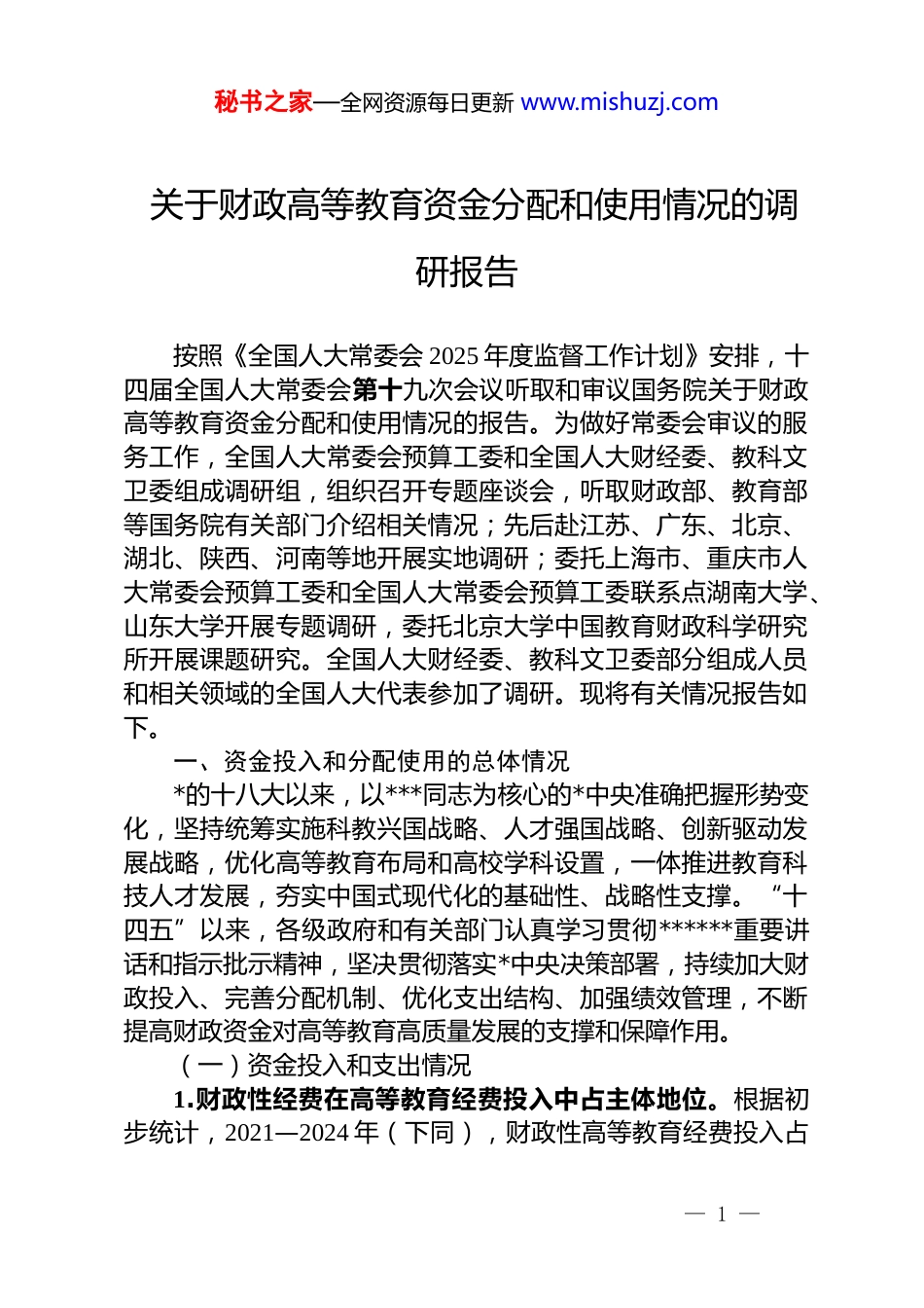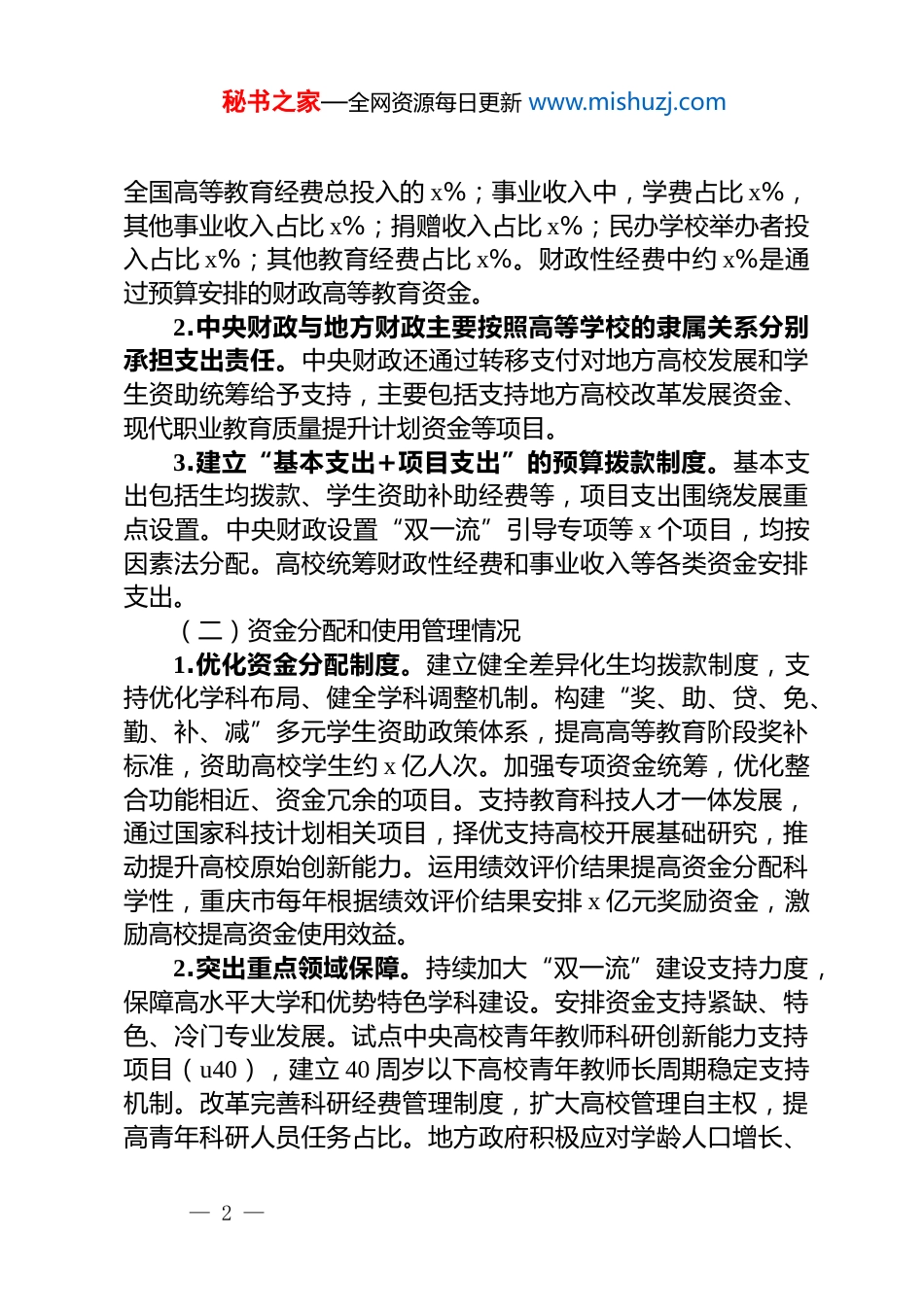 秘书之家—全网资源每日更新 www.mishuzj.com关于财政高等教育资金分配和使用情况的调研报告按照《全国人大常委会 2025 年度监督工作计划》安排,十四届全国人大常委会第十九次会议听取和审议国务院关于财政高等教育资金分配和使用情况的报告。为做好常委会审议的服务工作,全国人大常委会预算工委和全国人大财经委、教科文卫委组成调研组,组织召开专题座谈会,听取财政部、教育部等国务院有关部门介绍相关情况;先后赴江苏、广东、北京、湖北、陕西、河南等地开展实地调研;委托上海市、重庆市人大常委会预算工委和全国人大常委会预算工委联系点湖南大学、山东大学开展专题调研,委托北京大学中国教育财政科学研究所开展课题研究。全国人大财经委、教科文卫委部分组成人员和相关领域的全国人大代表参加了调研。现将有关情况报告如下。一、资金投入和分配使用的总体情况*的十八大以来,以***同志为核心的*中央准确把握形势变化,坚持统筹实施科教兴国战略、人才强国战略、创新驱动发展战略,优化高等教育布局和高校学科设置,一体推进教育科技人才发展,夯实中国式现代化的基础性、战略性支撑。“十四五”以来,各级政府和有关部门认真学习贯彻******重要讲话和指示批示精神,坚决贯彻落实*中央决策部署,持续加大财政投入、完善分配机制、优化支出结构、加强绩效管理,不断提高财政资金对高等教育高质量发展的支撑和保障作用。(一)资金投入和支出情况1.财政性经费在高等教育经费投入中占主体地位。根据初步统计,2021—2024 年(下同),财政性高等教育经费投入占— 1 —秘书之家—全网资源每日更新 www.mishuzj.com全国高等教育经费总投入的 x%;事业收入中,学费占比 x%,其他事业收入占比 x%;捐赠收入占比 x%;民办学校举办者投入占比 x%;其他教育经费占比 x%。财政性经费中约 x%是通过预算安排的财政高等教育资金。2.中央财政与地方财政主要按照高等学校的隶属关系分别承担支出责任。中央财政还通过转移支付对地方高校发展和学生资助统筹给予支持,主要包括支持地方高校改革发展资金、现代职业教育质量提升计划资金等项目。3.建立“基本支出+项目支出”的预算拨款制度。基本支出包括生均拨款、学生资助补助经费等,项目支出围绕发展重点设置。中央财政设置“双一流”引导专项等 x 个项目,均按因素法分配。高校统筹财政性经费和事业收入等各类资金安排支出。(二)资金分配和使用管理情况1.优化资金分配制度。建立健全差异化生均拨款制度,支持优化学科布局、健全学科调整机制。构建“奖、助、贷、免、勤、补、减”多元学生资助政策体系,提高高等教育阶段奖补标准,资助高校学生约 x 亿人次。加强专项资金统筹,优化整合功能相近、资金冗余的项目。支持教育科技人才一体发展,通过国家科技计划相关项目,择优支持高校开展基础研究,推动提升高校原始创新能力。运用绩效评价结果提高资金分配科学性,重庆市每年根据绩效评价结果安排 x 亿元奖励资金,激励高校提高资金使用效益。2.突出重点领域保障。持续加大“双一流”建设支持力度,保障高水平大学和优势特色学科建设。安排资金支持紧缺、特色、冷门专业发展。试点中央高校青年教师科研创新能力支持项目(u40),建立 40 周岁以下高校青年教师长周期稳定支持机制。改革完善科研经费管理制度,扩大高校管理自主权,提高青年科研人员任务占比。地方政府积极应对学龄人口增长、— 2 —秘书之家—全网资源每日更新 www.mishuzj.com高校扩招带来的软硬件困难,湖北省每年新增 x 亿元用于高校扩招,上海市每年安排 x 亿元用于校舍维修改造等,保障办学条件。3.加强资金资产监管。推进高校预算管理改革,将中央财政安排相关资金纳入零基预算改革试点范围。加强预算执行常态化监督,推进高校预算评审和预算管理一体化系统建设。推动资产管理与预算管理相衔接,从严审核新增资产配置。推进存量资产盘活利用。陕西省等地方自建资产调剂系统平台,推进高校资产、特别是大型科研仪器设备调剂共享。江苏省推动省属高校老校区置换工作,盘活收益超 x 亿元。指导高校加强财务制度和内部控制建设,加强...