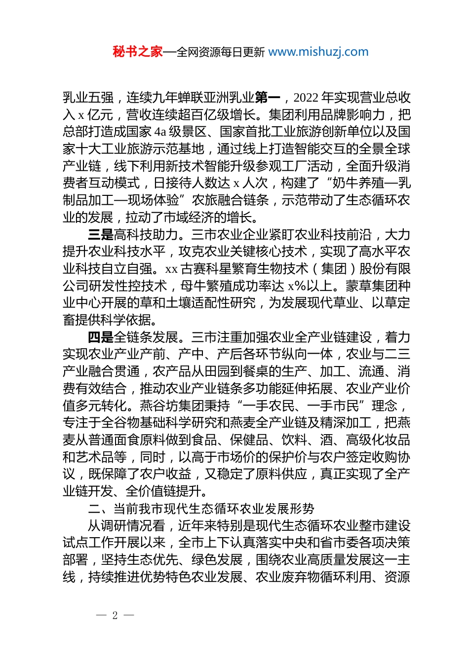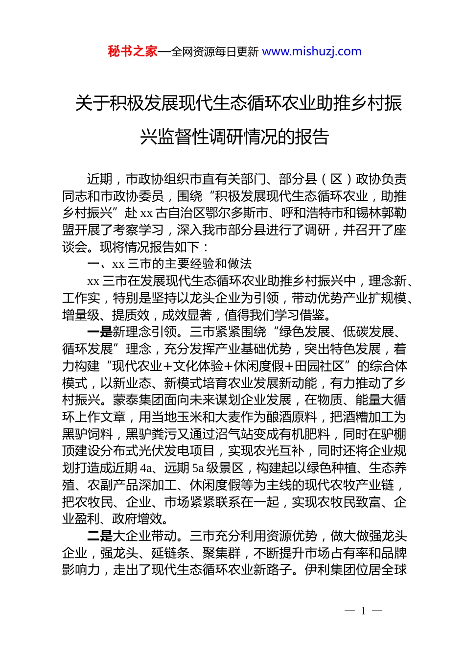 秘书之家—全网资源每日更新 www.mishuzj.com关于积极发展现代生态循环农业助推乡村振兴监督性调研情况的报告近期,市政协组织市直有关部门、部分县(区)政协负责同志和市政协委员,围绕“积极发展现代生态循环农业,助推乡村振兴”赴 xx 古自治区鄂尔多斯市、呼和浩特市和锡林郭勒盟开展了考察学习,深入我市部分县进行了调研,并召开了座谈会。现将情况报告如下:一、xx 三市的主要经验和做法xx 三市在发展现代生态循环农业助推乡村振兴中,理念新、工作实,特别是坚持以龙头企业为引领,带动优势产业扩规模、增量级、提质效,成效显著,值得我们学习借鉴。一是新理念引领。三市紧紧围绕“绿色发展、低碳发展、循环发展”理念,充分发挥产业基础优势,突出特色发展,着力构建“现代农业+文化体验+休闲度假+田园社区”的综合体模式,以新业态、新模式培育农业发展新动能,有力推动了乡村振兴。蒙泰集团面向未来谋划企业发展,在物质、能量大循环上作文章,用当地玉米和大麦作为酿酒原料,把酒糟加工为黑驴饲料,黑驴粪污又通过沼气站变成有机肥料,同时在驴棚顶建设分布式光伏发电项目,实现农光互补,同时还将企业规划打造成近期 4a、远期 5a 级景区,构建起以绿色种植、生态养殖、农副产品深加工、休闲度假等为主线的现代农牧产业链,把农牧民、企业、市场紧紧联系在一起,实现农牧民致富、企业盈利、政府增效。二是大企业带动。三市充分利用资源优势,做大做强龙头企业,强龙头、延链条、聚集群,不断提升市场占有率和品牌影响力,走出了现代生态循环农业新路子。伊利集团位居全球— 1 —秘书之家—全网资源每日更新 www.mishuzj.com乳业五强,连续九年蝉联亚洲乳业第一,2022 年实现营业总收入 x 亿元,营收连续超百亿级增长。集团利用品牌影响力,把总部打造成国家 4a 级景区、国家首批工业旅游创新单位以及国家十大工业旅游示范基地,通过线上打造智能交互的全景全球产业链,线下利用新技术智能升级参观工厂活动,全面升级消费者互动模式,日接待人数达 x 人次,构建了“奶牛养殖—乳制品加工—现场体验”农旅融合链条,示范带动了生态循环农业的发展,拉动了市域经济的增长。三是高科技助力。三市农业企业紧盯农业科技前沿,大力提升农业科技水平,攻克农业关键核心技术,实现了高水平农业科技自立自强。xx 古赛科星繁育生物技术(集团)股份有限公司研发性控技术,母牛繁殖成功率达 x%以上。蒙草集团种业中心开展的草和土壤适配性研究,为发展现代草业、以草定畜提供科学依据。四是全链条发展。三市注重加强农业全产业链建设,着力实现农业产业产前、产中、产后各环节纵向一体,农业与二三产业融合贯通,农产品从田园到餐桌的生产、加工、流通、消费有效结合,推动农业产业链条多功能延伸拓展、农业产业价值多元转化。燕谷坊集团秉持“一手农民、一手市民”理念,专注于全谷物基础科学研究和燕麦全产业链及精深加工,把燕麦从普通面食原料做到食品、保健品、饮料、酒、高级化妆品和艺术品等,同时,以高于市场价的保护价与农户签定收购协议,既保障了农户收益,又稳定了原料供应,真正实现了全产业链开发、全价值链提升。二、当前我市现代生态循环农业发展形势从调研情况看,近年来特别是现代生态循环农业整市建设试点工作开展以来,全市上下认真落实中央和省市委各项决策部署,坚持生态优先、绿色发展,围绕农业高质量发展这一主线,持续推进优势特色农业发展、农业废弃物循环利用、资源— 2 —秘书之家—全网资源每日更新 www.mishuzj.com环境节用保育,加快构建“全链条、全循环、高质量、高效益”的生态循环农业产业发展体系,现代生态循环农业发展取得了显著成效,为全面实施乡村振兴奠定了坚实基础。一是*政领导高度重视高位推进。市委、市政府把建设国家级现代生态循环农业示范市作为今后五年全市高质量发展的主要任务和奋斗目标之一,成立了由市委、市政府主要领导任组长的工作协调推进领导小组,修订完善了发展规划,制定了试点工作方案,编制了重点项目库,聚力打造农业全产业链和全循环链,为全市现代生态循环农业高质量发展指明了方...