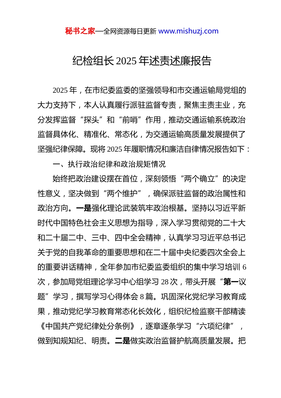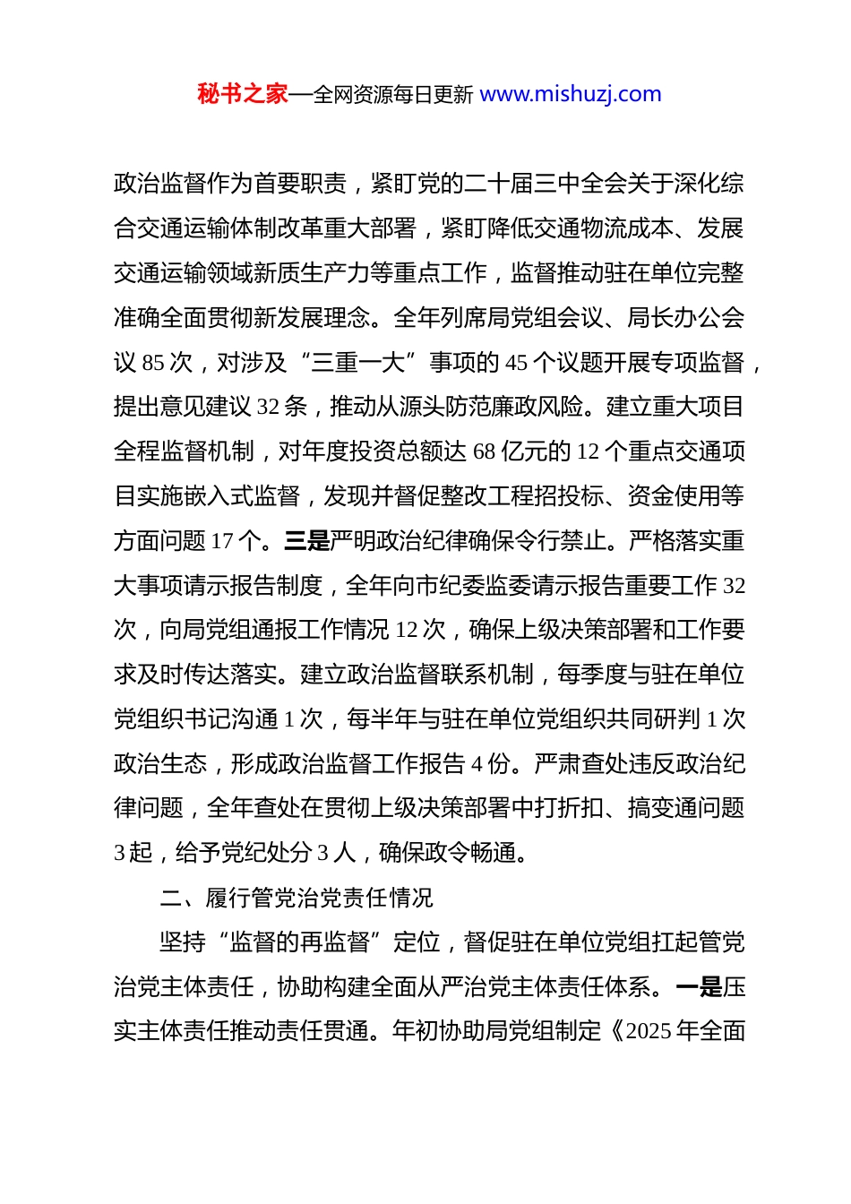 秘书之家—全网资源每日更新 www.mishuzj.com纪检组长 2025 年述责述廉报告 2025 年,在市纪委监委的坚强领导和市交通运输局党组的大力支持下,本人认真履行派驻监督专责,聚焦主责主业,充分发挥监督“探头”和“前哨”作用,推动交通运输系统政治监督具体化、精准化、常态化,为交通运输高质量发展提供了坚强纪律保障。现将 2025 年履职情况和廉洁自律情况报告如下:一、执行政治纪律和政治规矩情况始终把政治建设摆在首位,深刻领悟“两个确立”的决定性意义,坚决做到“两个维护”,确保派驻监督的政治属性和政治方向。一是强化理论武装筑牢政治根基。坚持以习近平新时代中国特色社会主义思想为指导,深入学习贯彻党的二十大和二十届二中、三中、四中全会精神,认真学习习近平总书记关于党的自我革命的重要思想和在二十届中央纪委四次全会上的重要讲话精神,全年参加市纪委监委组织的集中学习培训 6次,参加局党组理论学习中心组学习 28 次,带头开展“第一议题”学习,撰写学习心得体会 8 篇。巩固深化党纪学习教育成果,推动党纪学习教育常态化长效化,组织纪检监察干部精读《中国共产党纪律处分条例》,逐章逐条学习“六项纪律”,做到知规知纪、明责。二是做实政治监督护航高质量发展。把秘书之家—全网资源每日更新 www.mishuzj.com政治监督作为首要职责,紧盯党的二十届三中全会关于深化综合交通运输体制改革重大部署,紧盯降低交通物流成本、发展交通运输领域新质生产力等重点工作,监督推动驻在单位完整准确全面贯彻新发展理念。全年列席局党组会议、局长办公会议 85 次,对涉及“三重一大”事项的 45 个议题开展专项监督,提出意见建议 32 条,推动从源头防范廉政风险。建立重大项目全程监督机制,对年度投资总额达 68 亿元的 12 个重点交通项目实施嵌入式监督,发现并督促整改工程招投标、资金使用等方面问题 17 个。三是严明政治纪律确保令行禁止。严格落实重大事项请示报告制度,全年向市纪委监委请示报告重要工作 32次,向局党组通报工作情况 12 次,确保上级决策部署和工作要求及时传达落实。建立政治监督联系机制,每季度与驻在单位党组织书记沟通 1 次,每半年与驻在单位党组织共同研判 1 次政治生态,形成政治监督工作报告 4 份。严肃查处违反政治纪律问题,全年查处在贯彻上级决策部署中打折扣、搞变通问题3 起,给予党纪处分 3 人,确保政令畅通。二、履行管党治党责任情况坚持“监督的再监督”定位,督促驻在单位党组扛起管党治党主体责任,协助构建全面从严治党主体责任体系。一是压实主体责任推动责任贯通。年初协助局党组制定《2025 年全面秘书之家—全网资源每日更新 www.mishuzj.com从严治党工作要点》《党风廉政建设责任分工方案》,将责任分解到领导班子成员和机关各科室、下属各单位。督促局党组与下属 16 个单位签订党风廉政建设责任书,组织全系统 620 名干部职工签订廉洁从业承诺书。建立党风廉政建设季度督查制度,全年开展专项督查 4 次,对发现的制度执行不严格、“一岗双责”落实不到位等问题,向 4 个单位发出监察建议书,推动整改落实。督促局党组召开全系统党风廉政建设工作会议,通报典型案例 6 起,传导全面从严治党压力。二是强化日常监督提升监督质效。创新建立“室组地”联动监督机制,与市纪委监委相关监督检查室、辖区纪委监委加强协作配合,形成监督合力。全年开展专项监督检查 18 次,涉及工程建设、行政审批、政务服务、资金管理等重点领域,发现问题线索 23 条,立案查处违纪违法案件 14 件,给予党纪政务处分 14 人,其中科级干部 5 人,移送司法机关 2 人。建立“三重一大”事项监督台账,对年度审批行政许可事项 1240 件、审核交通工程招投标项目 186 个、使用财政资金 21.8 亿元等重点事项实施全程监督,确保权力规范运行。三是精准运用“四种形态”体现严管厚爱。坚持惩前毖后、治病救人方针,精准把握政策策略,综合运用监督执纪“四种形态”。全年运用“四种形态”处理 89 人次,其中第一种形态 68 人次,占 76.4%;第二种形态 17 人次,...