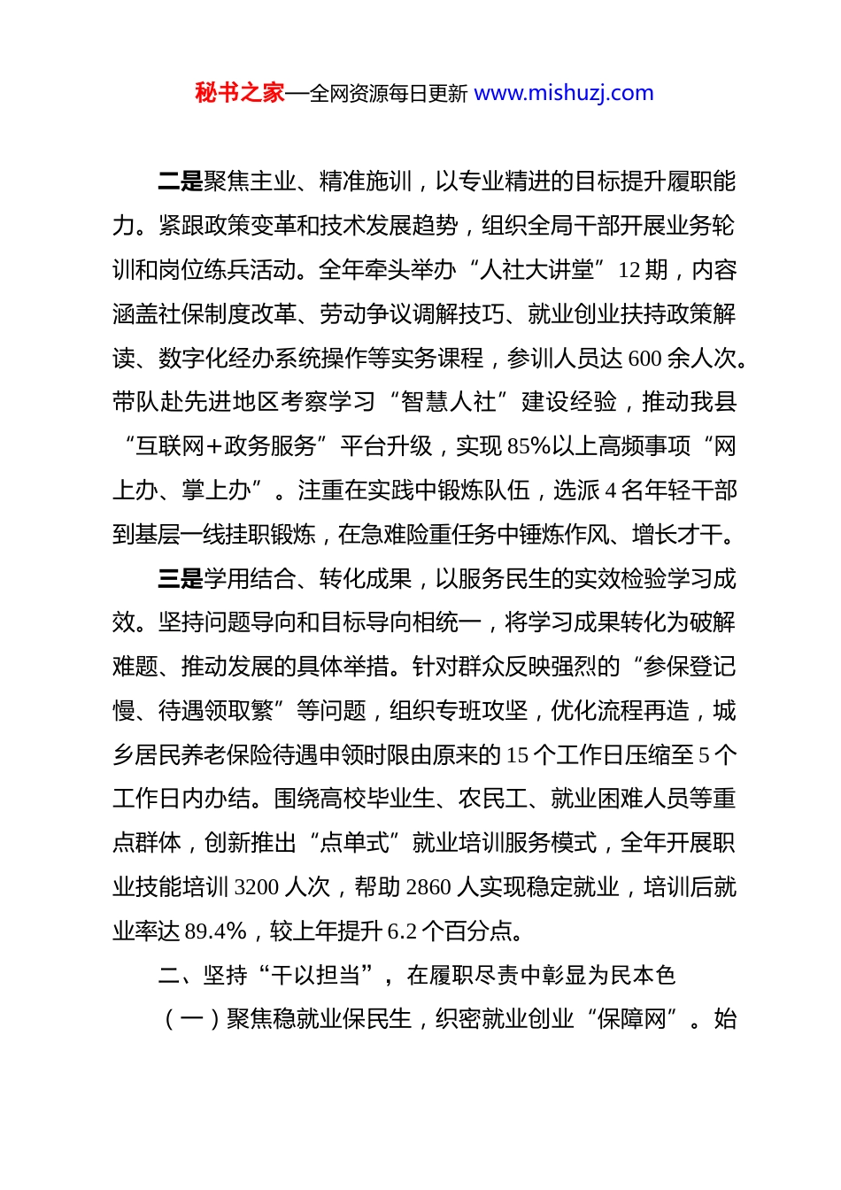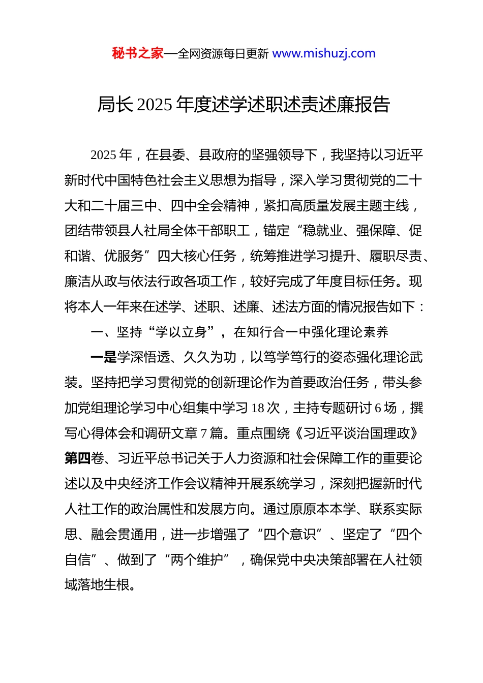 秘书之家—全网资源每日更新 www.mishuzj.com局长 2025 年度述学述职述责述廉报告 2025 年,在县委、县政府的坚强领导下,我坚持以习近平新时代中国特色社会主义思想为指导,深入学习贯彻党的二十大和二十届三中、四中全会精神,紧扣高质量发展主题主线,团结带领县人社局全体干部职工,锚定“稳就业、强保障、促和谐、优服务”四大核心任务,统筹推进学习提升、履职尽责、廉洁从政与依法行政各项工作,较好完成了年度目标任务。现将本人一年来在述学、述职、述廉、述法方面的情况报告如下:一、坚持“学以立身”,在知行合一中强化理论素养一是学深悟透、久久为功,以笃学笃行的姿态强化理论武装。坚持把学习贯彻党的创新理论作为首要政治任务,带头参加党组理论学习中心组集中学习 18 次,主持专题研讨 6 场,撰写心得体会和调研文章 7 篇。重点围绕《习近平谈治国理政》第四卷、习近平总书记关于人力资源和社会保障工作的重要论述以及中央经济工作会议精神开展系统学习,深刻把握新时代人社工作的政治属性和发展方向。通过原原本本学、联系实际思、融会贯通用,进一步增强了“四个意识”、坚定了“四个自信”、做到了“两个维护”,确保党中央决策部署在人社领域落地生根。秘书之家—全网资源每日更新 www.mishuzj.com二是聚焦主业、精准施训,以专业精进的目标提升履职能力。紧跟政策变革和技术发展趋势,组织全局干部开展业务轮训和岗位练兵活动。全年牵头举办“人社大讲堂”12 期,内容涵盖社保制度改革、劳动争议调解技巧、就业创业扶持政策解读、数字化经办系统操作等实务课程,参训人员达 600 余人次。带队赴先进地区考察学习“智慧人社”建设经验,推动我县“互联网+政务服务”平台升级,实现 85%以上高频事项“网上办、掌上办”。注重在实践中锻炼队伍,选派 4 名年轻干部到基层一线挂职锻炼,在急难险重任务中锤炼作风、增长才干。三是学用结合、转化成果,以服务民生的实效检验学习成效。坚持问题导向和目标导向相统一,将学习成果转化为破解难题、推动发展的具体举措。针对群众反映强烈的“参保登记慢、待遇领取繁”等问题,组织专班攻坚,优化流程再造,城乡居民养老保险待遇申领时限由原来的 15 个工作日压缩至 5 个工作日内办结。围绕高校毕业生、农民工、就业困难人员等重点群体,创新推出“点单式”就业培训服务模式,全年开展职业技能培训 3200 人次,帮助 2860 人实现稳定就业,培训后就业率达 89.4%,较上年提升 6.2 个百分点。二、坚持“干以担当”,在履职尽责中彰显为民本色(一)聚焦稳就业保民生,织密就业创业“保障网”。始秘书之家—全网资源每日更新 www.mishuzj.com终把稳就业作为最大民生工程,全面落实就业优先战略。全年城镇新增就业 4680 人,完成市下达任务的 104%;城镇登记失业率控制在 3.8%以内,低于全市平均水平。一是强化政策支持。制定出台《关于进一步促进城乡劳动者就业创业的若干措施》,发放创业担保贷款 2350 万元,扶持自主创业 217 人,带动就业860 余人。对吸纳就业困难人员的企业给予社保补贴和岗位补贴,累计发放资金 480 万元。二是拓宽就业渠道。联合产业园区、重点企业举办线上线下招聘会 28 场,提供就业岗位 1.2 万个,达成就业意向 3600 余人。开发公益性岗位 240 个,托底安置零就业家庭成员和大龄失业人员。三是突出重点帮扶。建立高校毕业生实名制台账,实施“一对一”就业指导服务,帮扶离校未就业高校毕业生就业率达 91.6%。开展“春风行动”“金秋招聘月”等专项活动,助力农民工返岗复工和就近就业。(二)聚力强保障惠民生,筑牢社会保障“安全堤”。持续推进覆盖全民、统筹城乡、公平统一、可持续的多层次社会保障体系建设。一是扩面提质持续推进。扎实开展“全民参保计划”攻坚行动,养老、工伤、失业三项保险参保人数分别达到 29.6 万、8.7 万、6.9 万人,基本实现应保尽保。城乡居民基础养老金标准提高至每月 165 元,同比增长 8.2%。二是基金管理安全规范。严格落实基金预算管理和内控制度,组织开展社秘书之家—全网资源每日更新 www.mishu...
