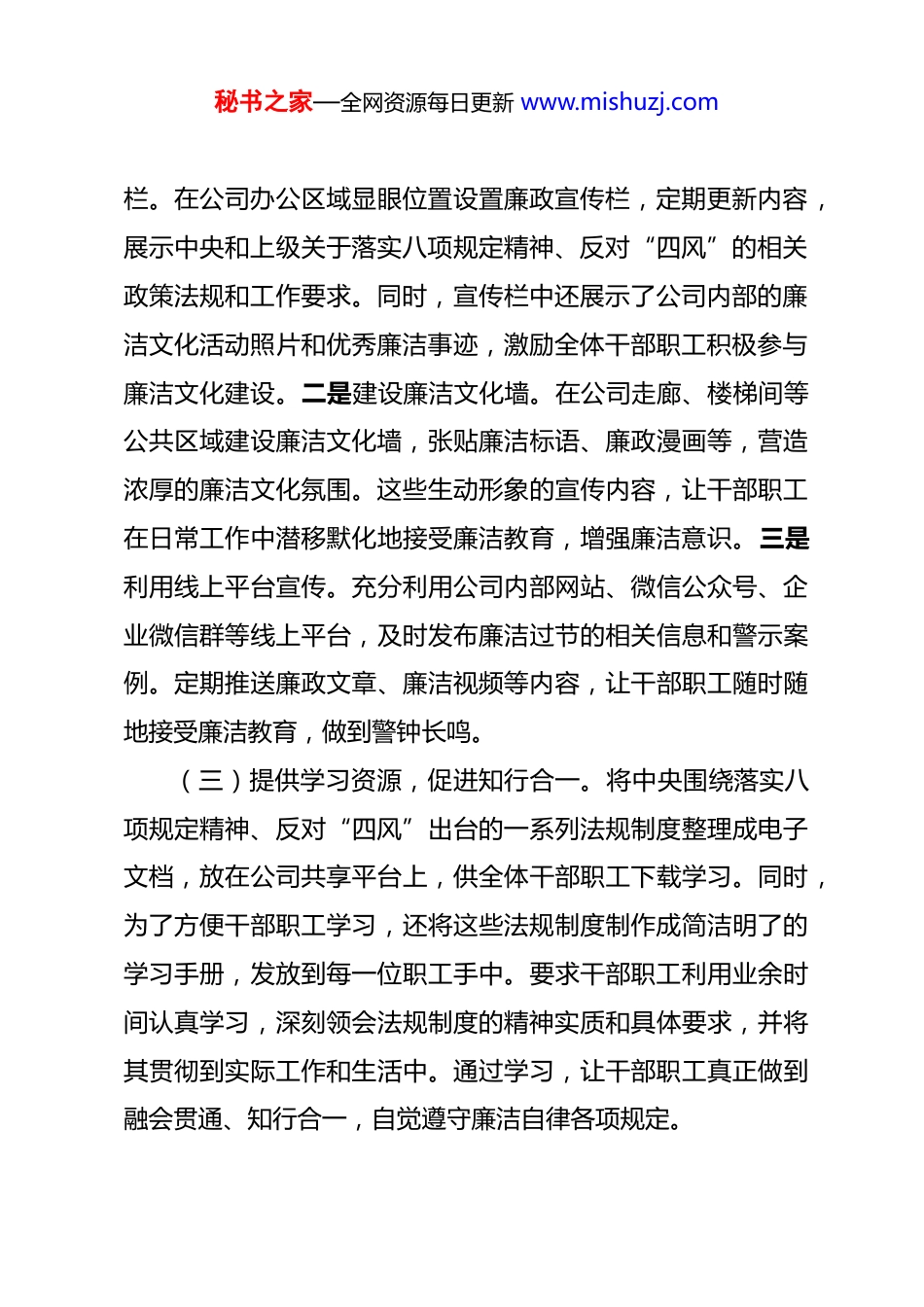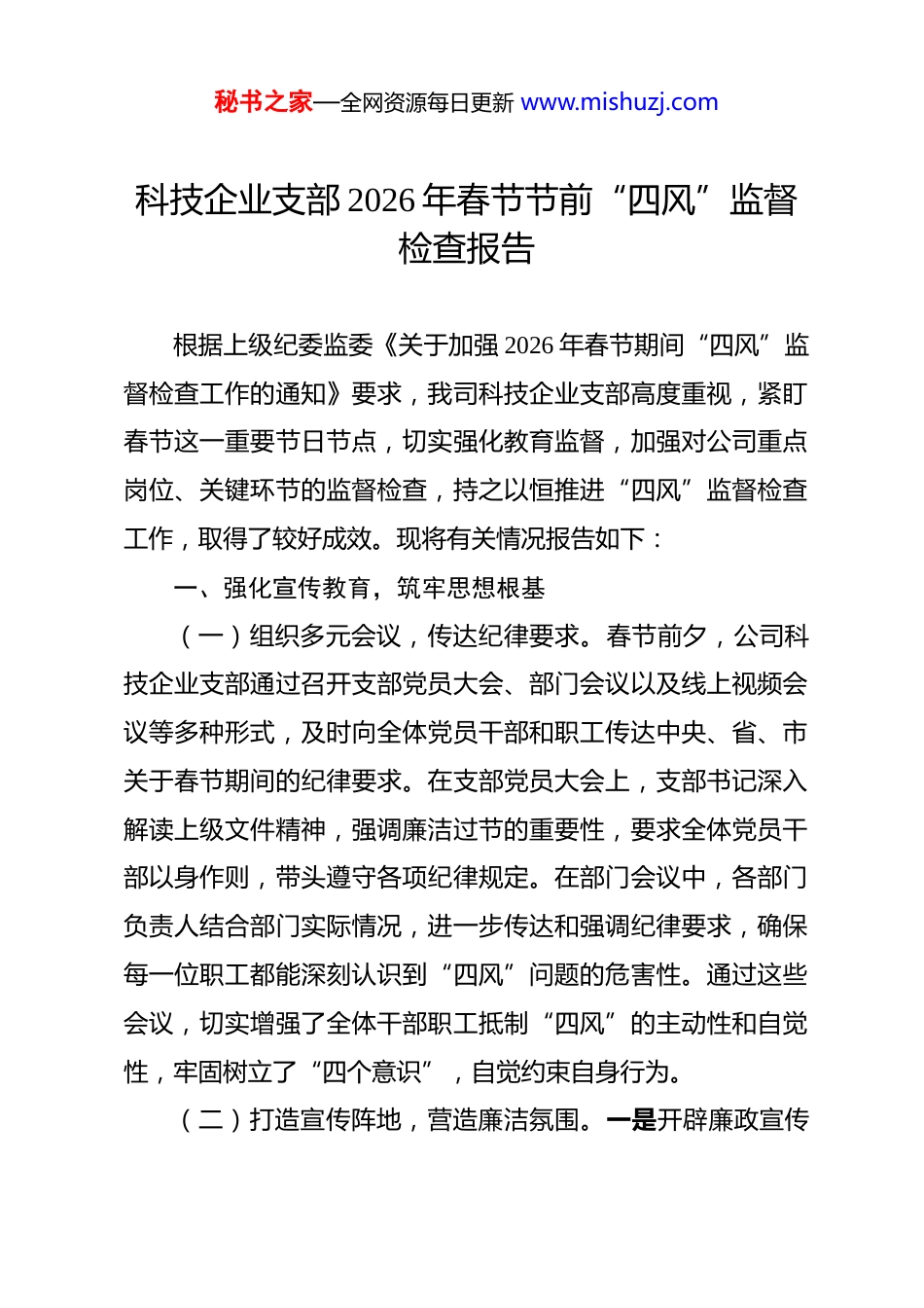秘书之家—全网资源每日更新 www.mishuzj.com科技企业支部 2026 年春节节前“四风”监督检查报告 根据上级纪委监委《关于加强 2026 年春节期间“四风”监督检查工作的通知》要求,我司科技企业支部高度重视,紧盯春节这一重要节日节点,切实强化教育监督,加强对公司重点岗位、关键环节的监督检查,持之以恒推进“四风”监督检查工作,取得了较好成效。现将有关情况报告如下:一、强化宣传教育,筑牢思想根基(一)组织多元会议,传达纪律要求。春节前夕,公司科技企业支部通过召开支部党员大会、部门会议以及线上视频会议等多种形式,及时向全体党员干部和职工传达中央、省、市关于春节期间的纪律要求。在支部党员大会上,支部书记深入解读上级文件精神,强调廉洁过节的重要性,要求全体党员干部以身作则,带头遵守各项纪律规定。在部门会议中,各部门负责人结合部门实际情况,进一步传达和强调纪律要求,确保每一位职工都能深刻认识到“四风”问题的危害性。通过这些会议,切实增强了全体干部职工抵制“四风”的主动性和自觉性,牢固树立了“四个意识”,自觉约束自身行为。(二)打造宣传阵地,营造廉洁氛围。一是开辟廉政宣传秘书之家—全网资源每日更新 www.mishuzj.com栏。在公司办公区域显眼位置设置廉政宣传栏,定期更新内容,展示中央和上级关于落实八项规定精神、反对“四风”的相关政策法规和工作要求。同时,宣传栏中还展示了公司内部的廉洁文化活动照片和优秀廉洁事迹,激励全体干部职工积极参与廉洁文化建设。二是建设廉洁文化墙。在公司走廊、楼梯间等公共区域建设廉洁文化墙,张贴廉洁标语、廉政漫画等,营造浓厚的廉洁文化氛围。这些生动形象的宣传内容,让干部职工在日常工作中潜移默化地接受廉洁教育,增强廉洁意识。三是利用线上平台宣传。充分利用公司内部网站、微信公众号、企业微信群等线上平台,及时发布廉洁过节的相关信息和警示案例。定期推送廉政文章、廉洁视频等内容,让干部职工随时随地接受廉洁教育,做到警钟长鸣。(三)提供学习资源,促进知行合一。将中央围绕落实八项规定精神、反对“四风”出台的一系列法规制度整理成电子文档,放在公司共享平台上,供全体干部职工下载学习。同时,为了方便干部职工学习,还将这些法规制度制作成简洁明了的学习手册,发放到每一位职工手中。要求干部职工利用业余时间认真学习,深刻领会法规制度的精神实质和具体要求,并将其贯彻到实际工作和生活中。通过学习,让干部职工真正做到融会贯通、知行合一,自觉遵守廉洁自律各项规定。秘书之家—全网资源每日更新 www.mishuzj.com二、严格监督检查,落实自查自纠(一)开展专项检查,聚焦重点问题。一是针对春节期间可能出现的“四风”问题,公司科技企业支部成立专项检查组,制定详细的检查方案,明确检查内容和重点。重点检查是否存在违规发放津补贴或福利、违规收送礼品礼金、违规公款吃喝、违规使用公车等问题。二是开展利用婚丧嫁娶事宜大操大办借机敛财问题的专项检查。要求全体干部职工如实报告个人婚丧嫁娶等事宜,严格执行相关规定,杜绝大操大办、借机敛财等行为。同时,设立举报电话和邮箱,接受广大职工的监督举报。三是开展专项整治利用公司资源谋取私利问题。加强对公司项目合作、物资采购、费用报销等环节的监督检查,防止干部职工利用职务之便,通过项目合作利益输送、虚假报销等方式谋取私利。对发现的问题及时进行调查处理,严肃追究相关人员的责任。(二)规范工作行为,强化日常监督。一是加强对干部职工日常工作行为的监督检查。严格考勤制度,严肃工作纪律,防止干部职工出现迟到早退、擅自离岗、工作时间上网聊天、玩游戏等问题。通过定期检查和不定期抽查相结合的方式,确保工作纪律得到有效执行。二是规范公务接待行为。严格执行公务接待标准,控制接待范围和接待费用,杜绝超标准接待、秘书之家—全网资源每日更新 www.mishuzj.com公款吃喝等问题。加强对公务接待审批流程的监督,要求每一次公务接待都必须事先经过审批,详细说明接待对象、接待事由、接待标准等信息。同时,对公务接待费用进行严格审核,确保费用支出合理合规...