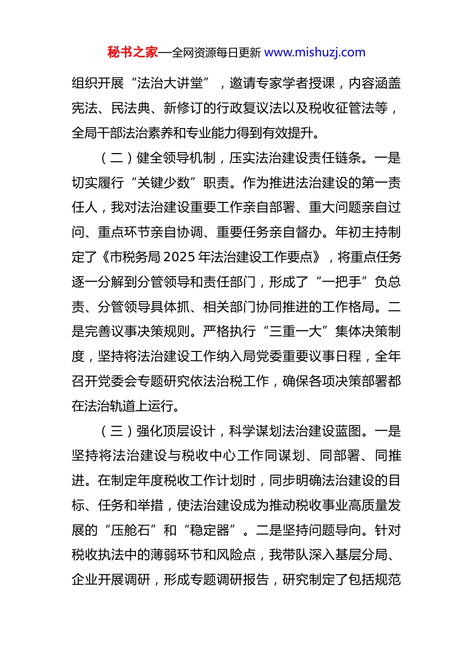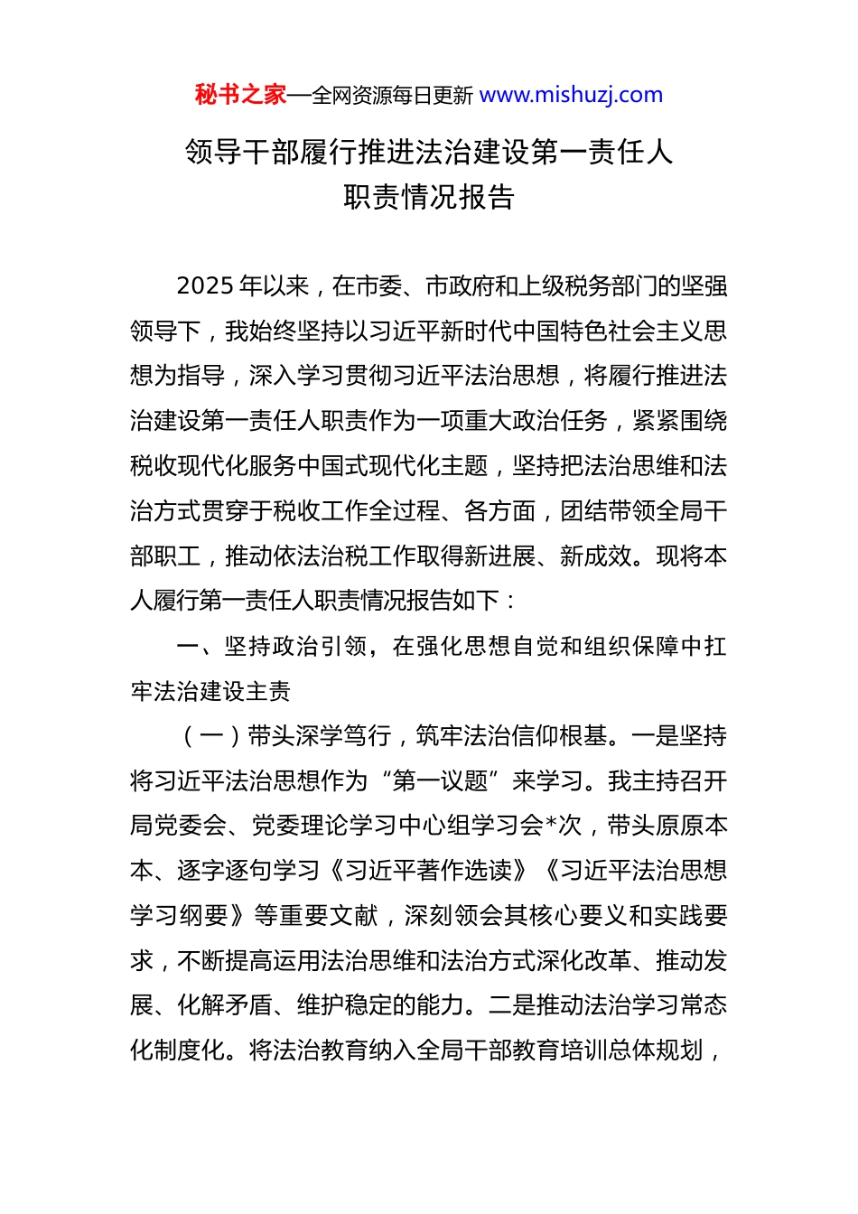 秘书之家—全网资源每日更新 www.mishuzj.com领导干部履行推进法治建设第一责任人职责情况报告 2025 年以来,在市委、市政府和上级税务部门的坚强领导下,我始终坚持以习近平新时代中国特色社会主义思想为指导,深入学习贯彻习近平法治思想,将履行推进法治建设第一责任人职责作为一项重大政治任务,紧紧围绕税收现代化服务中国式现代化主题,坚持把法治思维和法治方式贯穿于税收工作全过程、各方面,团结带领全局干部职工,推动依法治税工作取得新进展、新成效。现将本人履行第一责任人职责情况报告如下:一、坚持政治引领,在强化思想自觉和组织保障中扛牢法治建设主责(一)带头深学笃行,筑牢法治信仰根基。一是坚持将习近平法治思想作为“第一议题”来学习。我主持召开局党委会、党委理论学习中心组学习会*次,带头原原本本、逐字逐句学习《习近平著作选读》《习近平法治思想学习纲要》等重要文献,深刻领会其核心要义和实践要求,不断提高运用法治思维和法治方式深化改革、推动发展、化解矛盾、维护稳定的能力。二是推动法治学习常态化制度化。将法治教育纳入全局干部教育培训总体规划,秘书之家—全网资源每日更新 www.mishuzj.com组织开展“法治大讲堂”,邀请专家学者授课,内容涵盖宪法、民法典、新修订的行政复议法以及税收征管法等,全局干部法治素养和专业能力得到有效提升。(二)健全领导机制,压实法治建设责任链条。一是切实履行“关键少数”职责。作为推进法治建设的第一责任人,我对法治建设重要工作亲自部署、重大问题亲自过问、重点环节亲自协调、重要任务亲自督办。年初主持制定了《市税务局 2025 年法治建设工作要点》,将重点任务逐一分解到分管领导和责任部门,形成了“一把手”负总责、分管领导具体抓、相关部门协同推进的工作格局。二是完善议事决策规则。严格执行“三重一大”集体决策制度,坚持将法治建设工作纳入局党委重要议事日程,全年召开党委会专题研究依法治税工作,确保各项决策部署都在法治轨道上运行。(三)强化顶层设计,科学谋划法治建设蓝图。一是坚持将法治建设与税收中心工作同谋划、同部署、同推进。在制定年度税收工作计划时,同步明确法治建设的目标、任务和举措,使法治建设成为推动税收事业高质量发展的“压舱石”和“稳定器”。二是坚持问题导向。针对税收执法中的薄弱环节和风险点,我带队深入基层分局、企业开展调研,形成专题调研报告,研究制定了包括规范秘书之家—全网资源每日更新 www.mishuzj.com税务行政处罚裁量权、优化税务稽查流程等在内的制度性文件,以制度创新破解实践难题。二、聚焦中心大局,在服务经济社会高质量发展中彰显法治税务担当(一)依法依规组织收入,夯实国家财力保障。一是坚决守牢不收“过头税费”的底线。严格依照法定权限和程序组织税费收入,确保税费征收合法合规、公平公正。二是加强收入质量分析。定期主持召开税收经济分析会,运用税收大数据,精准分析经济运行态势,为地方党委、政府科学决策提供高质量的参考依据。(二)精准落实优惠政策,释放改革红利。一是确保政策红利直达快享。面对新出台的支持科技创新、制造业发展、中小微企业纾困等一系列税费优惠政策,我牵头成立政策落实工作专班,通过“线上+线下”多渠道开展政策宣传辅导,确保纳税人缴费人对政策应知尽知、应享尽享。二是强化政策效应跟踪。建立政策落实反馈机制,收集纳税人意见建议,及时向上级部门反映政策执行中遇到的问题,推动政策持续优化完善。(三)持续优化税收营商环境,提升纳税人满意度。一是深化“放管服”改革。深入推进“便民办税春风行动”,牵头推出便民服务举措。目前,全局涉税事项实现秘书之家—全网资源每日更新 www.mishuzj.com网上办理。二是保护纳税人合法权益。健全纳税人缴费人权利救济和税费争议解决机制,畅通诉求表达渠道。在地方政府组织的营商环境测评中,纳税指标位居前列。三、严格规范执法,在维护社会公平正义中树立税务机关良好形象(一)全面深化执法制度建设。一是严格落实行政执法“三项制度”。全面推行执法信息公示、执法全过程记录和重大执法决定法制审核制度,实现...