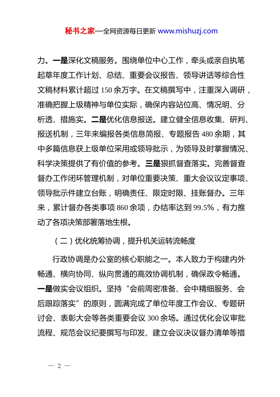 秘书之家—全网资源每日更新 www.mishuzj.com某办公室主任近三年工作总结自 2023 年初至 2026 年 2 月,本人在**单位办公室主任岗位上已履职三年。这三年,是国家迈入新发展阶段、单位事业迎接新挑战的关键时期,亦是我在组织的信任与培养下,在全体同仁的协作与支持下,砥砺前行、履职尽责、收获成长的三年。回顾此间历程,本人始终以强烈的责任感与使命感投入工作,恪尽职守,勤勉务实,围绕中心,服务大局,致力于提升办公室“三服务”工作水平,为保障单位高效平稳运行贡献了应有之力。现将三年来的主要工作情况总结如下。一、聚焦核心职能,提升综合服务保障能力办公室作为单位运转的中枢神经,承上启下、协调左右、联系内外的作用至关重要。三年来,本人始终将精准、高效、规范作为工作准绳,着力在参谋辅政、统筹协调、后勤保障三大核心板块精耕细作,确保各项工作有条不紊、运转顺畅。(一)强化参谋辅政,提升决策服务精准度始终坚持“身在兵位,胸为帅谋”,紧扣单位发展战略与年度重点工作,不断提升以文辅政、信息服务和督查督办的能— 1 —秘书之家—全网资源每日更新 www.mishuzj.com力。一是深化文稿服务。围绕单位中心工作,牵头或亲自执笔起草年度工作计划、总结、重要会议报告、领导讲话等综合性文稿材料累计超过 150 余万字。在文稿撰写中,注重深入调研,准确把握上级精神与单位实际,确保内容站位高、情况明、分析透、措施实。二是优化信息报送。建立健全信息收集、研判、报送机制,三年来编报各类信息简报、专题报告 480 余期,其中多篇信息获上级单位采用或领导批示,为领导及时掌握情况、科学决策提供了有价值的参考。三是狠抓督查落实。完善督查督办工作闭环管理机制,对单位重要决策、重大会议议定事项、领导批示件建立台账,明确责任、限定时限、挂账督办。三年来,累计督办各类事项 860 余项,办结率达到 99.5%,有力推动了各项决策部署落地生根。(二)优化统筹协调,提升机关运转流畅度行政协调是办公室的核心职能之一。本人致力于构建内外畅通、横向协同、纵向贯通的高效协调机制,确保政令畅通。一是做实会议组织。坚持“会前周密准备、会中精细服务、会后跟踪落实”的原则,圆满完成了单位年度工作会议、专题研讨会、表彰大会等各类重要会议 300 余场。通过优化会议审批流程、规范会议纪要撰写与印发、建立会议决议督办清单等措— 2 —秘书之家—全网资源每日更新 www.mishuzj.com施,会议组织的规范性和实效性得到显著提升,参会人员满意度调查平均分达到 95 分以上。二是深化部门协同。牢固树立“一盘棋”思想,主动加强与各部门的沟通联系,牵头建立了跨部门重点工作联席会议制度成功协调解决了“智慧办公系统升级”、“固定资产清查盘点”等涉及多部门的复杂事项,有效破除了部门壁垒,形成了工作合力。三是规范公文流转。严格执行公文处理规范,优化收发文、传阅、归档流程。通过引入电子签章、线上流转等技术手段,公文平均处理周期缩短了30%以上,确保了文件传递的及时性、准确性和安全性。(三)夯实后勤保障,提升服务保障满意度后勤保障工作是办公室的基石,直接关系到单位的稳定和职工的切身利益。本人坚持“管理精细化、服务人性化”的理念,全面提升后勤服务质量。一是强化日常管理。建立健全了办公用品采购与管理、车辆调度、食堂管理、环境卫生、安全保卫等一系列规章制度并严格监督执行。通过实施定点采购、成本核算等措施,三年来行政办公经费支出在保障需求的前提下,年均节约近 8%。二是优化资产管理。牵头完成了单位固定资产的全面清查、登记、建卡工作,实现了资产管理的账实相符和动态更新。设备设施维护响应及时率达到 98%,有效保— 3 —秘书之家—全网资源每日更新 www.mishuzj.com障了日常工作的正常开展。三是提升服务温度。关注职工需求,积极改善办公环境与生活条件。推动完成了职工食堂的升级改造,丰富了菜品种类,提升了就餐满意度。妥善安排重要来宾接待工作近千批次,展现了单位的良好形象。二、拥抱变革创新,驱动办公管理提质增效面对新时代数字化浪潮,本人深刻认识到创新是...