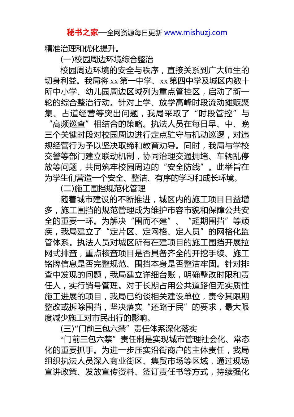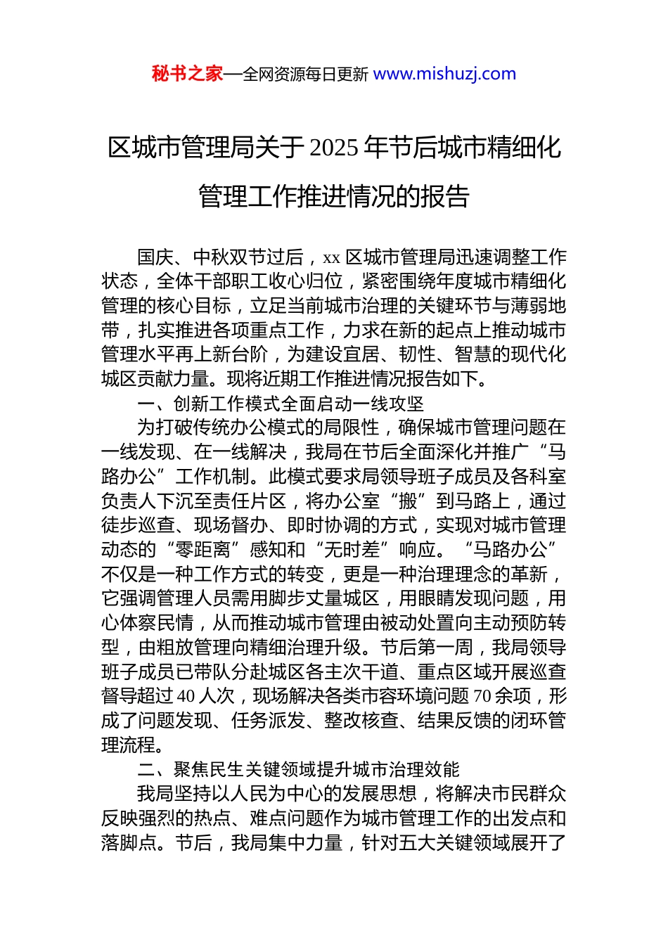 秘书之家—全网资源每日更新 www.mishuzj.com区城市管理局关于 2025 年节后城市精细化管理工作推进情况的报告国庆、中秋双节过后,xx 区城市管理局迅速调整工作状态,全体干部职工收心归位,紧密围绕年度城市精细化管理的核心目标,立足当前城市治理的关键环节与薄弱地带,扎实推进各项重点工作,力求在新的起点上推动城市管理水平再上新台阶,为建设宜居、韧性、智慧的现代化城区贡献力量。现将近期工作推进情况报告如下。一、创新工作模式全面启动一线攻坚为打破传统办公模式的局限性,确保城市管理问题在一线发现、在一线解决,我局在节后全面深化并推广“马路办公”工作机制。此模式要求局领导班子成员及各科室负责人下沉至责任片区,将办公室“搬”到马路上,通过徒步巡查、现场督办、即时协调的方式,实现对城市管理动态的“零距离”感知和“无时差”响应。“马路办公”不仅是一种工作方式的转变,更是一种治理理念的革新,它强调管理人员需用脚步丈量城区,用眼睛发现问题,用心体察民情,从而推动城市管理由被动处置向主动预防转型,由粗放管理向精细治理升级。节后第一周,我局领导班子成员已带队分赴城区各主次干道、重点区域开展巡查督导超过 40 人次,现场解决各类市容环境问题 70 余项,形成了问题发现、任务派发、整改核查、结果反馈的闭环管理流程。二、聚焦民生关键领域提升城市治理效能我局坚持以人民为中心的发展思想,将解决市民群众反映强烈的热点、难点问题作为城市管理工作的出发点和落脚点。节后,我局集中力量,针对五大关键领域展开了秘书之家—全网资源每日更新 www.mishuzj.com精准治理和优化提升。(一)校园周边环境综合整治校园周边环境的安全与秩序,直接关系到广大师生的切身利益。我局将 xx 第一中学、xx 第四中学及城区内数十所中小学、幼儿园周边区域列为重点管控区,启动了新一轮的综合整治行动。针对上学、放学高峰时段流动摊贩聚集、占道经营等突出问题,我局采取了“时段管控”与“高频巡查”相结合的策略。执法人员在每日早、中、晚三个关键时段对校园周边进行定点驻守与机动巡逻,对违规经营行为予以坚决取缔和教育劝导。同时,我局与学校交警等部门建立联动机制,协同治理交通拥堵、车辆乱停放等问题,共同筑牢校园周边的“安全防线”。此举旨在为学生们营造一个安全、整洁、有序的学习和成长环境。(二)施工围挡规范化管理随着城市建设的不断推进,城区内的施工项目日益增多,施工围挡的规范管理成为维护市容市貌和保障公共安全的重要一环。为解决“围而不建”、“超期围挡”等顽疾,我局建立了“定片区、定网格、定人员”的网格化监管体系。执法人员对城区所有在建项目的施工围挡开展拉网式排查,重点核查项目是否具备齐全的开挖手续、施工铭牌信息是否完整规范、围挡本身是否整洁牢固。针对排查中发现的问题,我局建立详细台账,明确整改时限和责任人,实行销号管理。对于长期占用公共道路但无实质性施工进展的项目,我局已约谈相关建设单位,责令其限期整改或拆除围挡,坚决落实“还路于民”的要求,最大限度减少施工对市民出行的影响。(三)“门前三包六禁”责任体系深化落实“门前三包六禁”责任制是实现城市管理社会化、常态化的重要抓手。为进一步压实沿街商户的主体责任,我局组织执法人员深入商业街区、集贸市场等区域,通过现场宣讲政策、发放宣传资料、签订责任书等方式,持续强化秘书之家—全网资源每日更新 www.mishuzj.com商户的责任意识。同时,加大巡查力度,对店外经营、乱堆杂物、乱贴乱画等违反“门前三包”规定的行为进行常态化劝导和整改。自节后以来,我局已累计开展相关宣传活动近百场,规范各类商户经营行为超过 1500 余次。通过持续不断地督促与引导,沿街商铺“各扫门前雪”的自觉性显著提升,城市街道的整洁度和有序性得到有效巩固。(四)非机动车停放秩序专项整治非机动车乱停乱放问题是城市治理中的一个普遍性难题。为破解此问题,我局依托“定点划线停车归位+巡查劝导规范”的双轨模式,系统推进非机动车停放秩序的整治工作。一方面,我局组织人员在人流量较大的主街人行道游园广场、商超及地...