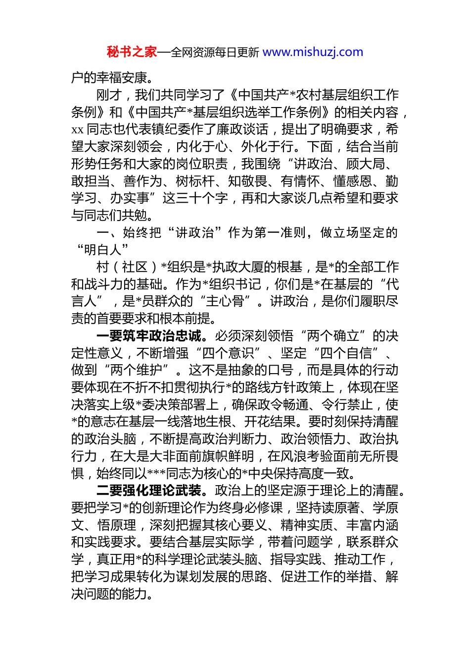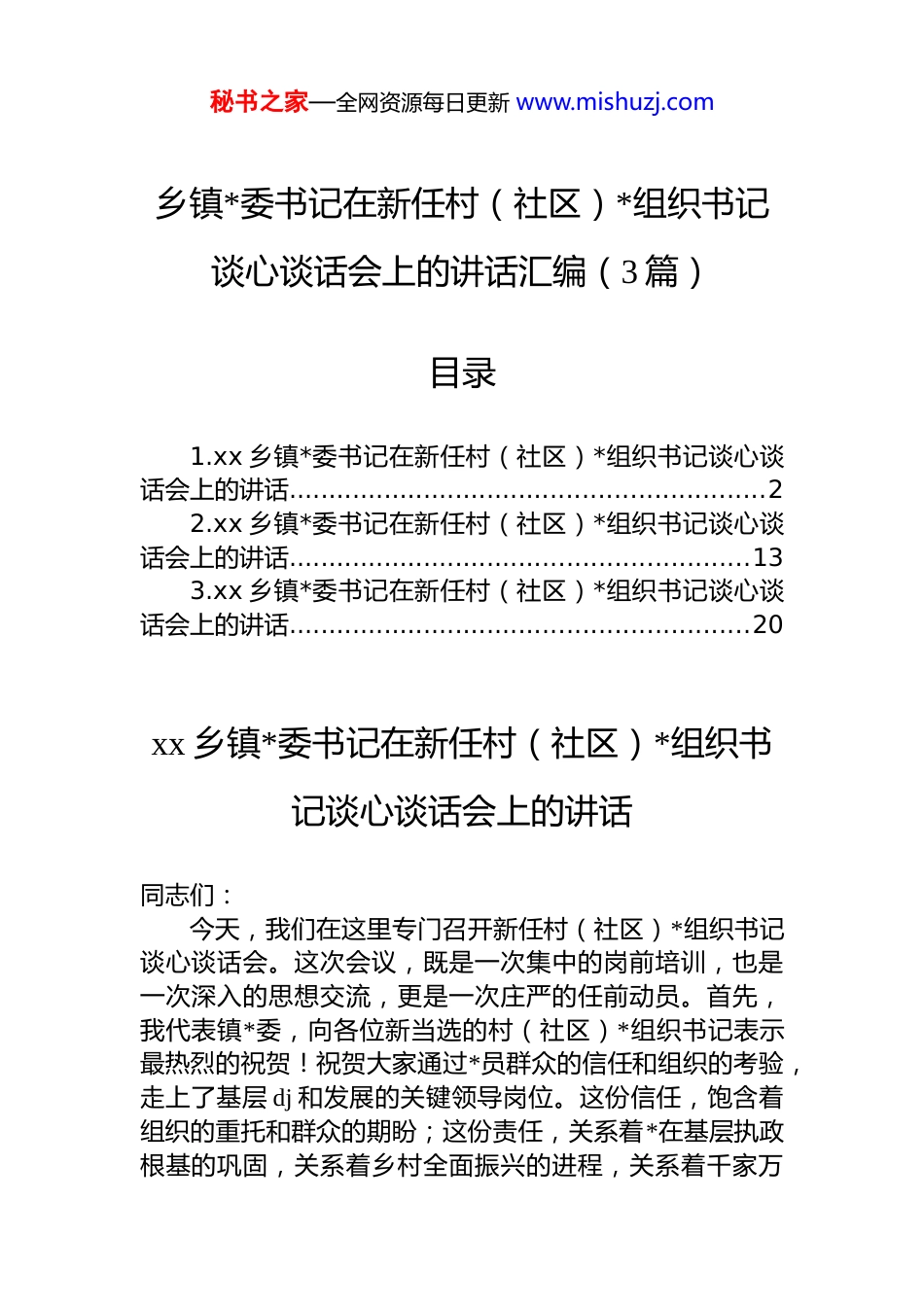 秘书之家—全网资源每日更新 www.mishuzj.com乡镇*委书记在新任村(社区)*组织书记谈心谈话会上的讲话汇编(3 篇)目录1.xx 乡镇*委书记在新任村(社区)*组织书记谈心谈话会上的讲话............................................................22.xx 乡镇*委书记在新任村(社区)*组织书记谈心谈话会上的讲话..........................................................133.xx 乡镇*委书记在新任村(社区)*组织书记谈心谈话会上的讲话..........................................................20xx 乡镇*委书记在新任村(社区)*组织书记谈心谈话会上的讲话同志们:今天,我们在这里专门召开新任村(社区)*组织书记谈心谈话会。这次会议,既是一次集中的岗前培训,也是一次深入的思想交流,更是一次庄严的任前动员。首先,我代表镇*委,向各位新当选的村(社区)*组织书记表示最热烈的祝贺!祝贺大家通过*员群众的信任和组织的考验,走上了基层 dj 和发展的关键领导岗位。这份信任,饱含着组织的重托和群众的期盼;这份责任,关系着*在基层执政根基的巩固,关系着乡村全面振兴的进程,关系着千家万秘书之家—全网资源每日更新 www.mishuzj.com户的幸福安康。刚才,我们共同学习了《中国共产*农村基层组织工作条例》和《中国共产*基层组织选举工作条例》的相关内容,xx 同志也代表镇纪委作了廉政谈话,提出了明确要求,希望大家深刻领会,内化于心、外化于行。下面,结合当前形势任务和大家的岗位职责,我围绕“讲政治、顾大局、敢担当、善作为、树标杆、知敬畏、有情怀、懂感恩、勤学习、办实事”这三十个字,再和大家谈几点希望和要求与同志们共勉。一、始终把“讲政治”作为第一准则,做立场坚定的“明白人”村(社区)*组织是*执政大厦的根基,是*的全部工作和战斗力的基础。作为*组织书记,你们是*在基层的“代言人”,是*员群众的“主心骨”。讲政治,是你们履职尽责的首要要求和根本前提。一要筑牢政治忠诚。必须深刻领悟“两个确立”的决定性意义,不断增强“四个意识”、坚定“四个自信”、做到“两个维护”。这不是抽象的口号,而是具体的行动要体现在不折不扣贯彻执行*的路线方针政策上,体现在坚决落实上级*委决策部署上,确保政令畅通、令行禁止,使*的意志在基层一线落地生根、开花结果。要时刻保持清醒的政治头脑,不断提高政治判断力、政治领悟力、政治执行力,在大是大非面前旗帜鲜明,在风浪考验面前无所畏惧,始终同以***同志为核心的*中央保持高度一致。二要强化理论武装。政治上的坚定源于理论上的清醒。要把学习*的创新理论作为终身必修课,坚持读原著、学原文、悟原理,深刻把握其核心要义、精神实质、丰富内涵和实践要求。要结合基层实际学,带着问题学,联系群众学,真正用*的科学理论武装头脑、指导实践、推动工作,把学习成果转化为谋划发展的思路、促进工作的举措、解决问题的能力。秘书之家—全网资源每日更新 www.mishuzj.com三要严守政治纪律。必须把遵守*的政治纪律和政治规矩摆在首位。决不允许在贯彻执行中央决策部署上打折扣做选择、搞变通;决不允许散布违背*的理论和路线方针政策的言论;决不允许参与各种非法组织和活动;决不允许搞小山头、小圈子、小团伙。要自觉维护班子团结,坚持民主集中制,营造风清气正的政治生态。二、始终以“顾大局”的胸襟谋划工作,做团结协作的“领头雁”“不谋全局者,不足以谋一域。”村(社区)*组织书记虽然身处基层,但必须具备全局观念和战略眼光。要善于站在全镇、全区乃至全市发展的高度来思考和处理本村(社区)的问题。一要自觉服从服务于中心大局。要深刻理解上级*委政府的战略意图和工作重点,自觉将本村(社区)的发展融入全镇、全区发展大局中去谋划、去推进。在产业发展、项目建设、环境整治、社会治理等方面,要坚决克服本位主义思想,有时为了全局利益,可能需要牺牲一些局部利益、眼前利益,大家要有这个胸襟和觉悟,做到小局服从大局、局部服从整体。二要善于凝聚班子合力。书记是“班长”,不是“家长”。要充分发挥*组织在基层各类组织中的领导核心作用,支持和保证...