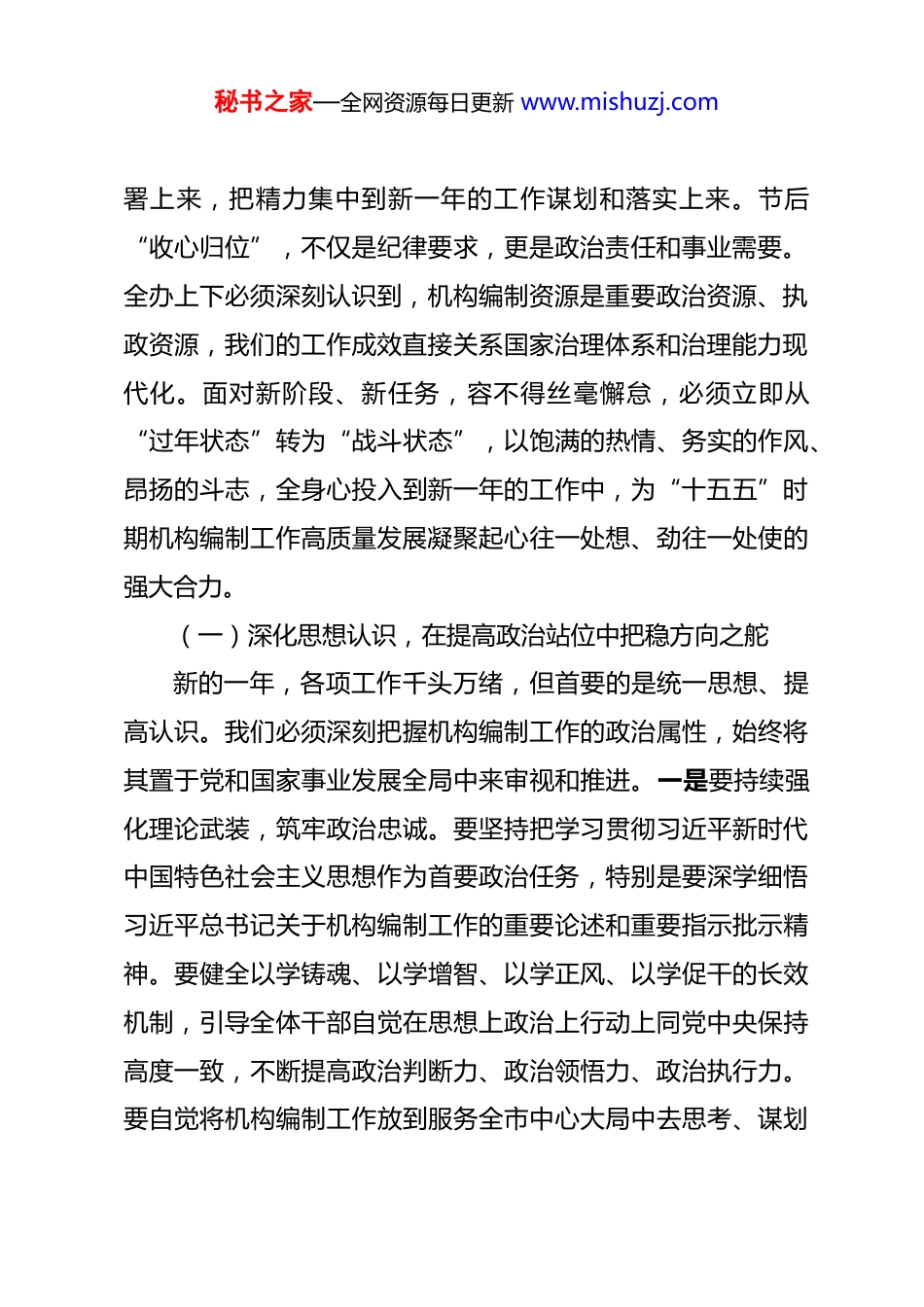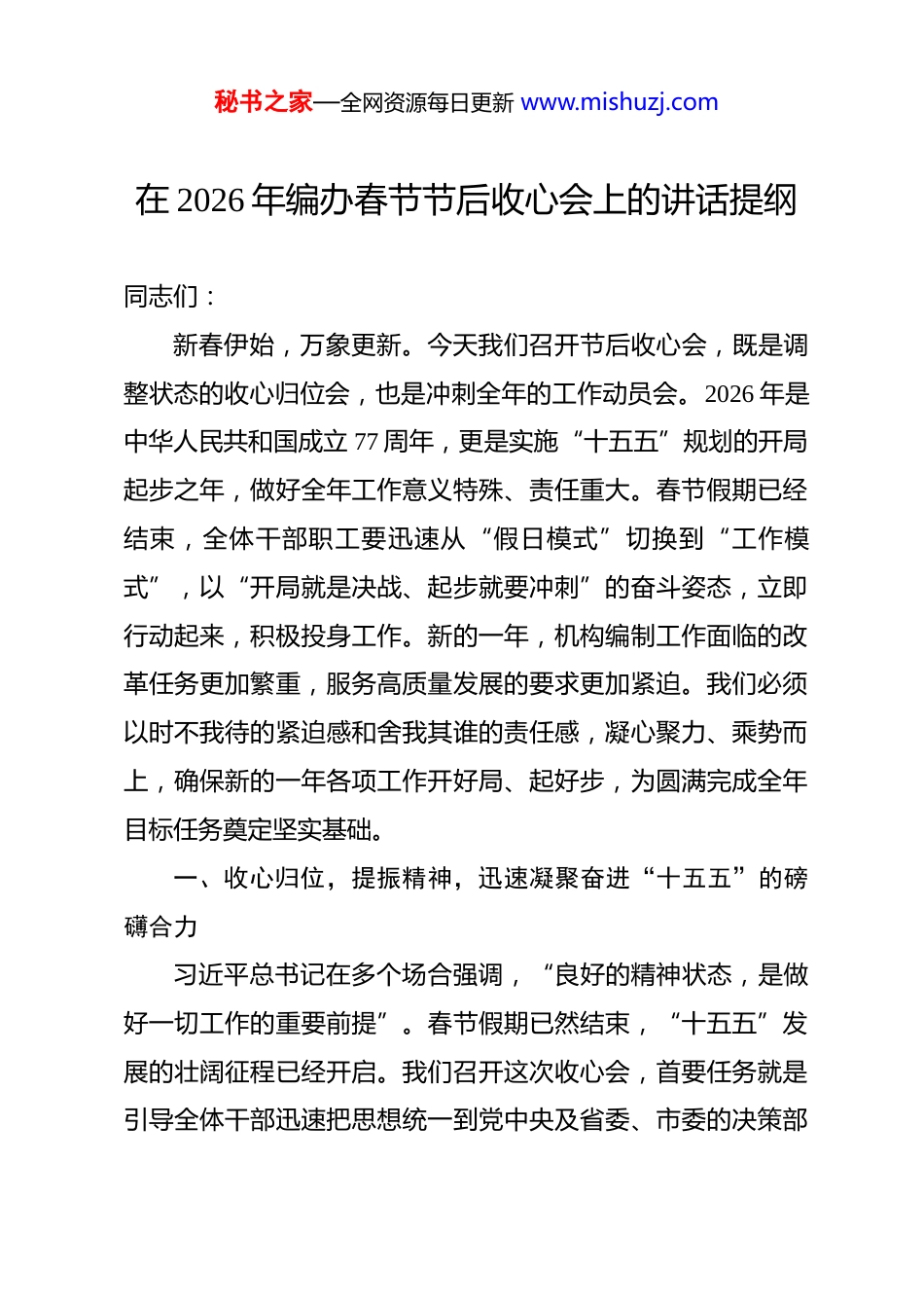 秘书之家—全网资源每日更新 www.mishuzj.com在 2026 年编办春节节后收心会上的讲话提纲 同志们:新春伊始,万象更新。今天我们召开节后收心会,既是调整状态的收心归位会,也是冲刺全年的工作动员会。2026 年是中华人民共和国成立 77 周年,更是实施“十五五”规划的开局起步之年,做好全年工作意义特殊、责任重大。春节假期已经结束,全体干部职工要迅速从“假日模式”切换到“工作模式”,以“开局就是决战、起步就要冲刺”的奋斗姿态,立即行动起来,积极投身工作。新的一年,机构编制工作面临的改革任务更加繁重,服务高质量发展的要求更加紧迫。我们必须以时不我待的紧迫感和舍我其谁的责任感,凝心聚力、乘势而上,确保新的一年各项工作开好局、起好步,为圆满完成全年目标任务奠定坚实基础。一、收心归位,提振精神,迅速凝聚奋进“十五五”的磅礴合力习近平总书记在多个场合强调,“良好的精神状态,是做好一切工作的重要前提”。春节假期已然结束,“十五五”发展的壮阔征程已经开启。我们召开这次收心会,首要任务就是引导全体干部迅速把思想统一到党中央及省委、市委的决策部秘书之家—全网资源每日更新 www.mishuzj.com署上来,把精力集中到新一年的工作谋划和落实上来。节后“收心归位”,不仅是纪律要求,更是政治责任和事业需要。全办上下必须深刻认识到,机构编制资源是重要政治资源、执政资源,我们的工作成效直接关系国家治理体系和治理能力现代化。面对新阶段、新任务,容不得丝毫懈怠,必须立即从“过年状态”转为“战斗状态”,以饱满的热情、务实的作风、昂扬的斗志,全身心投入到新一年的工作中,为“十五五”时期机构编制工作高质量发展凝聚起心往一处想、劲往一处使的强大合力。(一)深化思想认识,在提高政治站位中把稳方向之舵新的一年,各项工作千头万绪,但首要的是统一思想、提高认识。我们必须深刻把握机构编制工作的政治属性,始终将其置于党和国家事业发展全局中来审视和推进。一是要持续强化理论武装,筑牢政治忠诚。要坚持把学习贯彻习近平新时代中国特色社会主义思想作为首要政治任务,特别是要深学细悟习近平总书记关于机构编制工作的重要论述和重要指示批示精神。要健全以学铸魂、以学增智、以学正风、以学促干的长效机制,引导全体干部自觉在思想上政治上行动上同党中央保持高度一致,不断提高政治判断力、政治领悟力、政治执行力。要自觉将机构编制工作放到服务全市中心大局中去思考、谋划秘书之家—全网资源每日更新 www.mishuzj.com和推进,确保市委和市委编委的各项决策部署在编办系统不折不扣落地生根。要将对党忠诚体现在坚决贯彻党中央关于深化机构改革、优化编制资源配置等一系列重大战略部署的实际行动上,确保机构编制工作始终沿着正确政治方向前进。二是要深刻领会战略意图,把握发展大势。2026 年是承前启后的关键一年,“十五五”规划将描绘未来五年国家发展新蓝图。我们要深入学习领会党中央关于“进一步全面深化改革”的战略部署,准确把握新发展阶段对机构职能体系提出的新要求。要密切关注中央、省委编办的最新工作动态和政策导向,加强对经济社会发展趋势和治理难题的前瞻性研究。要深刻理解我市在区域发展格局中的新定位、新使命,使机构编制工作更好地对接发展所需、基层所盼、民心所向。三是要切实增强行动自觉,主动担当作为。思想认识的高度决定行动落实的力度。全办干部要清醒认识到,机构编制部门在推进国家治理体系和治理能力现代化中肩负着重要职责。必须克服“年未过完、事不愿干”的懈怠思想,迅速收心聚力,主动将个人工作融入全市机构编制事业发展大局。要树立“今天再晚也是早,明天再早也是晚”的效率意识,对定下的事情马上办、抓紧干,以“时时放心不下”的责任感和“事事紧抓不放”的执行力,推动各项工作往前赶、争主动,为全年工作赢得先机。秘书之家—全网资源每日更新 www.mishuzj.com(二)迅速调整状态,在严明纪律规矩中夯实作风之基作风是战斗力,纪律是生命线。节后工作状态如何,直接反映了单位的整体作风和精神面貌。我们必须以严明的纪律、务实的作风,保障各项工作高效有序...