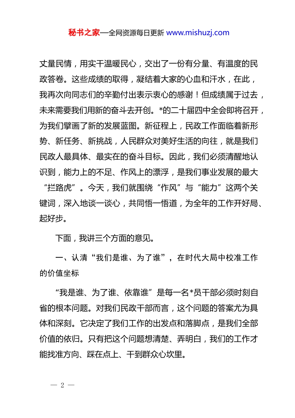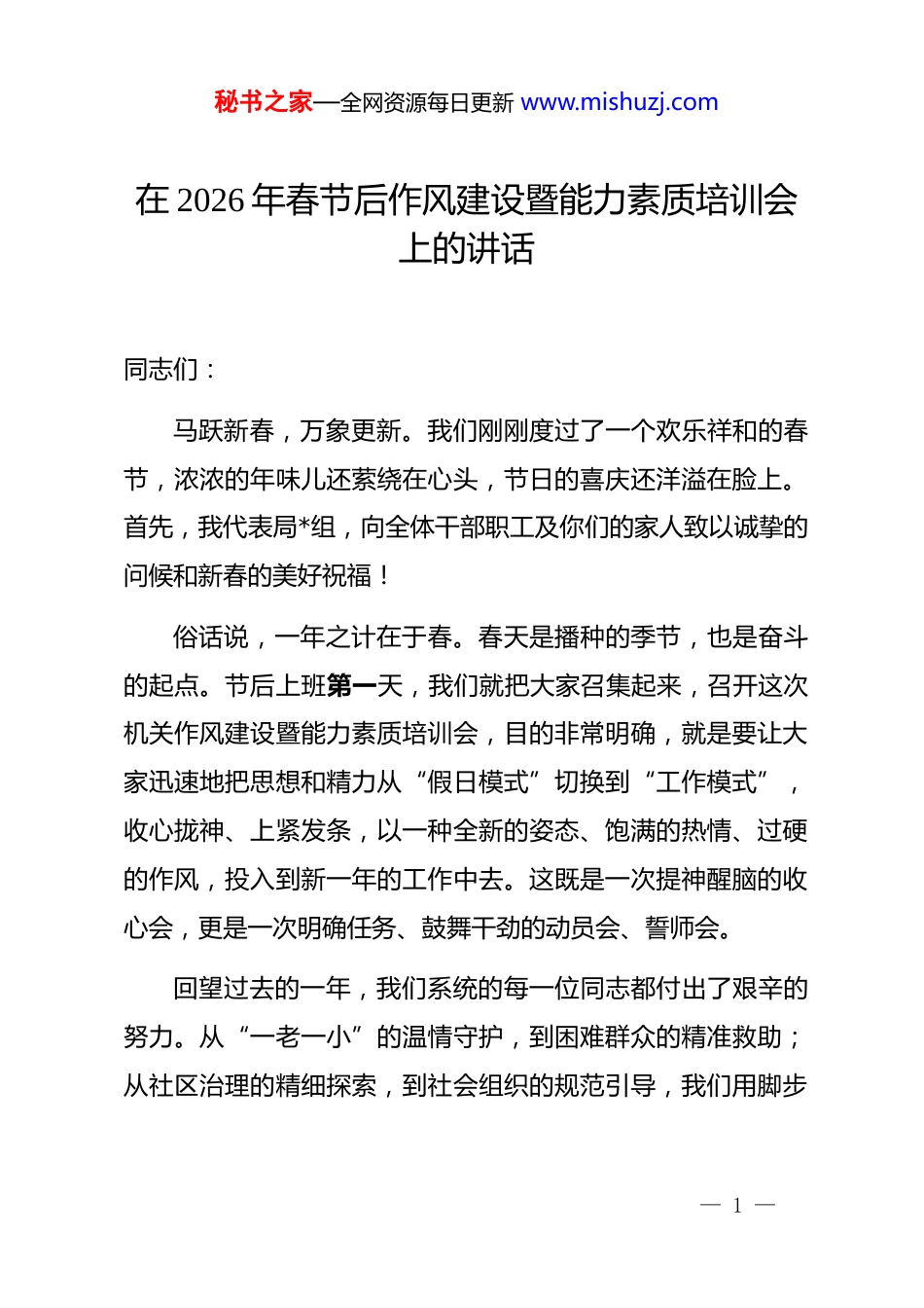 秘书之家—全网资源每日更新 www.mishuzj.com在 2026 年春节后作风建设暨能力素质培训会上的讲话同志们:马跃新春,万象更新。我们刚刚度过了一个欢乐祥和的春节,浓浓的年味儿还萦绕在心头,节日的喜庆还洋溢在脸上。首先,我代表局*组,向全体干部职工及你们的家人致以诚挚的问候和新春的美好祝福!俗话说,一年之计在于春。春天是播种的季节,也是奋斗的起点。节后上班第一天,我们就把大家召集起来,召开这次机关作风建设暨能力素质培训会,目的非常明确,就是要让大家迅速地把思想和精力从“假日模式”切换到“工作模式”,收心拢神、上紧发条,以一种全新的姿态、饱满的热情、过硬的作风,投入到新一年的工作中去。这既是一次提神醒脑的收心会,更是一次明确任务、鼓舞干劲的动员会、誓师会。回望过去的一年,我们系统的每一位同志都付出了艰辛的努力。从“一老一小”的温情守护,到困难群众的精准救助;从社区治理的精细探索,到社会组织的规范引导,我们用脚步— 1 —秘书之家—全网资源每日更新 www.mishuzj.com丈量民情,用实干温暖民心,交出了一份有分量、有温度的民政答卷。这些成绩的取得,凝结着大家的心血和汗水,在此,我再次向同志们的辛勤付出表示衷心的感谢!但成绩属于过去,未来需要我们用新的奋斗去开创。*的二十届四中全会即将召开,为我们擘画了新的发展蓝图。新征程上,民政工作面临着新形势、新任务、新挑战,人民群众对美好生活的向往,就是我们民政人最具体、最实在的奋斗目标。因此,我们必须清醒地认识到,能力上的不足、作风上的漂浮,是我们事业发展的最大“拦路虎”。今天,我们就围绕“作风”与“能力”这两个关键词,深入地谈一谈心,共同悟一悟道,为全年的工作开好局、起好步。下面,我讲三个方面的意见。一、认清“我们是谁、为了谁”,在时代大局中校准工作的价值坐标“我是谁、为了谁、依靠谁”是每一名*员干部必须时刻自省的根本问题。对我们民政干部而言,这个问题的答案尤为具体和深刻。它决定了我们工作的出发点和落脚点,是我们全部价值的依归。只有把这个问题想清楚、弄明白,我们的工作才能找准方向、踩在点上、干到群众心坎里。— 2 —秘书之家—全网资源每日更新 www.mishuzj.com(一)深刻领悟,民政工作是“国之大者”的民生落点。******反复强调,要心怀“国之大者”。什么是“国之大者”?对我们而言,共同富裕、乡村振兴、积极应对人口老龄化这些国家战略,就是“国之大者”。而民政工作,恰恰是这些宏大战略在基层最直接、最具体的实践载体。我们推动养老服务体系建设,让全市超过*亿的老年人能够安享晚年,这不就是积极应对人口老龄化国家战略的生动注脚吗?我们织密兜牢社会救助安全网,确保每一户困难家庭都能求助有门、受助及时,这不就是扎实推进共同富裕的题中之义吗?我们深化基层社会治理,让城乡社区成为居民最放心、最安心的港湾,这不就是夯实*的执政根基的具体行动吗?同志们,我们必须跳出“就民政看民政”的狭隘视野,自觉把我们的每一项工作,哪怕是审批一个低保、调解一个纠纷、登记一个社团,都放到*和国家事业发展全局中去审视、去考量。当我们认识到自己手中的工作,一头连着中央的决策部署,一头连着百姓的安危冷暖时,我们的责任感和使命感就会油然而生,工作的格局和境界就会豁然开朗。(二)时刻体悟,民政工作是“群众急盼”的暖心回应。民政工作被称为“菩萨事业”,我们打交道的对象,大多是社— 3 —秘书之家—全网资源每日更新 www.mishuzj.com会上的特殊困难群体,是“沉默的大多数”。他们的声音或许不大,但他们的期盼最为真切;他们的诉求或许朴素,但解决起来刻不容缓。我们工作的全部意义,就在于回应好这些“急难愁盼”。我时常在想,当我们坐在窗明几净的办公室里,吹着空调、敲着键盘时,是否能想到那些蜷缩在冬日寒风中的流浪人员?当我们为政策文件上的某个措辞反复推敲时,是否能体会到一位重病患者家庭等待救命钱的焦灼?我们手中的权力、我们经办的业务,对我们而言可能是一份程序、一项工作,但对群众来说,可能就是一个家庭的希望,是一个人一生的转折。这种“...