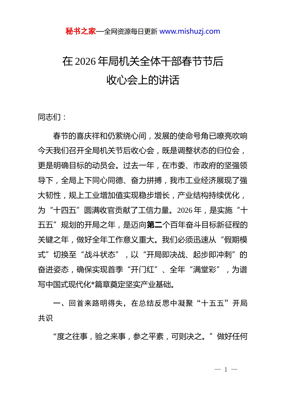 秘书之家—全网资源每日更新 www.mishuzj.com在 2026 年局机关全体干部春节节后收心会上的讲话同志们:春节的喜庆祥和仍萦绕心间,发展的使命号角已嘹亮吹响今天我们召开全局机关节后收心会,既是调整状态的归位会,更是明确目标的动员会。过去一年,在市委、市政府的坚强领导下,全局上下同心同德、奋力拼搏,我市工业经济展现了强大韧性,规上工业增加值实现稳步增长,产业结构持续优化,为“十四五”圆满收官贡献了工信力量。2026 年,是实施“十五五”规划的开局之年,是迈向第二个百年奋斗目标新征程的关键之年,做好全年工作意义重大。我们必须迅速从“假期模式”切换至“战斗状态”,以“开局即决战、起步即冲刺”的奋进姿态,确保实现首季“开门红”、全年“满堂彩”,为谱写中国式现代化*篇章奠定坚实产业基础。一、回首来路明得失,在总结反思中凝聚“十五五”开局共识“度之往事,验之来事,参之平素,可则决之。”做好任何— 1 —秘书之家—全网资源每日更新 www.mishuzj.com工作,都需要深刻总结过去、理性分析当下、科学谋划未来。春节既是辞旧迎新的时间节点,更是我们复盘得失、积蓄力量的重要窗口。我们必须清醒认识到,当前我市工业经济发展仍面临外部环境复杂严峻、内部新旧动能转换接续不畅等多重挑战。因此,首要任务就是收心归位、统一思想,通过对过往工作的系统梳理与审视,引导全体干部将节日欢庆的喜悦,转化为推动新型工业化的澎湃动力,为“十五五”开好局、起好步凝聚最广泛的思想共识和工作合力。(一)盘点成绩增信心,深刻认识发展基础的稳固性过去一年,我们锚定高质量发展首要任务,全力以赴稳增长、促转型、强动能,全市工业经济在承压前行中呈现出稳中向好、进中提质的良好态势。这些成绩的取得,根本在于**************思想的科学指引,在于市委、市政府的正确领导,也凝聚着全局每一位同志的智慧与汗水。通过全面盘点,我们旨在进一步增强发展自信,为新征程再出发注入强劲精神动力。一是工业经济运行稳中有进,基本盘得到有效巩固。我们始终将稳增长摆在突出位置,通过强化运行监测、深化企业服务、落实惠企政策等多措并举,有效应对下行压力。全市规上工业增加值同比增长*%,高于全省平均水平*个百分点,制造业增— 2 —秘书之家—全网资源每日更新 www.mishuzj.com加值占地区生产总值比重稳步提升至*%。重点行业支撑有力,电子信息、装备制造、先进材料等主导产业产值均实现两位数增长。工业投资的关键作用持续发挥,全年制造业投资增长*%,一批事关长远发展的重大项目相继落地开工,为后续增长积蓄了潜能。企业效益逐步改善,通过降本增效、市场开拓等系列举措,规上工业企业利润总额扭转下滑态势,同比增长*%,展现了实体经济的韧性与活力。二是产业结构优化升级步伐加快,新质生产力培育初见成效。我们坚持把发展经济的着力点放在实体经济上,推动产业体系向高端化、智能化、绿色化迈进。传统产业改造升级深入推进,实施“千企技改”行动,推动冶金、化工、纺织等产业通过设备更新、工艺升级焕发新活力。战略性新兴产业蓬勃壮大,新一代信息技术、生物医药、新能源等产业产值占规上工业比重提升至*%,成为拉动增长的重要引擎。未来产业布局前瞻展开,在人工智能、低空经济、前沿新材料等领域积极培育试点示范,部分技术已进入应用验证阶段。产业创新能力持续增强,新增省级以上企业技术中心*家,牵头或参与制定国家、行业标准*项,技术合同成交额实现大幅增长。三是发展动能转换持续深化,数字化转型与绿色化转型协同推进。我们以“智改数转网联”为主攻方向,推动数字技术与实体经济深度融合。智能化改造成效显著,新增省级智能— 3 —秘书之家—全网资源每日更新 www.mishuzj.com工厂(车间)*个,累计推动*家企业上云用平台,两化融合发展水平指数位居全省前列。数字基础设施不断夯实,新建 5g 基站*个,实现了重点区域和工业园区深度覆盖。工业绿色低碳发展扎实推进,严格落实能耗“双控”转向碳排放“双控”要求,新增国家级绿色工厂*家,全市规上工业单位增加值能耗累计下降*%,主要工业固体废弃物综合利用率保...