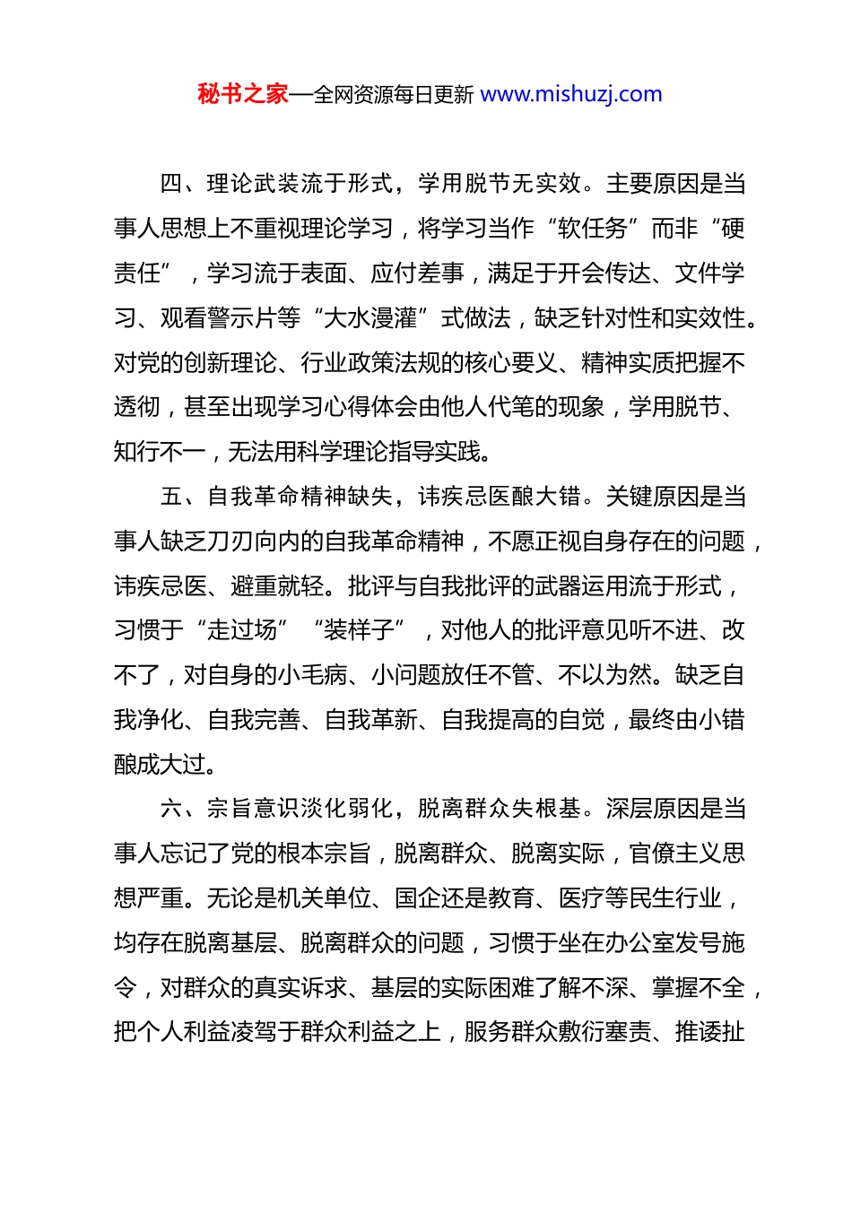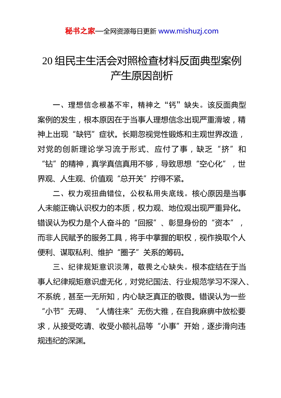秘书之家—全网资源每日更新 www.mishuzj.com20 组民主生活会对照检查材料反面典型案例产生原因剖析 一、理想信念根基不牢,精神之“钙”缺失。该反面典型案例的发生,根本原因在于当事人理想信念出现严重滑坡,精神上出现“缺钙”症状。长期忽视党性锻炼和主观世界改造,对党的创新理论学习流于形式、应付了事,缺乏“挤”和“钻”的精神,真学真信真用不够,导致思想“空心化”,世界观、人生观、价值观“总开关”拧得不紧。二、权力观扭曲错位,公权私用失底线。核心原因是当事人未能正确认识权力的本质,权力观、地位观出现严重异化。错误认为权力是个人奋斗的“回报”、彰显身份的“资本”,而非人民赋予的服务工具,将手中掌握的职权,视作换取个人便利、谋取私利、维护“圈子”关系的筹码。三、纪律规矩意识淡薄,敬畏之心缺失。根本症结在于当事人纪律规矩意识虚无化,对党纪国法、行业规范学习不深入、不系统,甚至一无所知,内心缺乏真正的敬畏。错误认为一些“小节”无碍、“人情往来”无伤大雅,在自我麻痹中放松要求,从接受吃请、收受小额礼品等“小事”开始,逐步滑向违规违纪的深渊。秘书之家—全网资源每日更新 www.mishuzj.com四、理论武装流于形式,学用脱节无实效。主要原因是当事人思想上不重视理论学习,将学习当作“软任务”而非“硬责任”,学习流于表面、应付差事,满足于开会传达、文件学习、观看警示片等“大水漫灌”式做法,缺乏针对性和实效性。对党的创新理论、行业政策法规的核心要义、精神实质把握不透彻,甚至出现学习心得体会由他人代笔的现象,学用脱节、知行不一,无法用科学理论指导实践。五、自我革命精神缺失,讳疾忌医酿大错。关键原因是当事人缺乏刀刃向内的自我革命精神,不愿正视自身存在的问题,讳疾忌医、避重就轻。批评与自我批评的武器运用流于形式,习惯于“走过场”“装样子”,对他人的批评意见听不进、改不了,对自身的小毛病、小问题放任不管、不以为然。缺乏自我净化、自我完善、自我革新、自我提高的自觉,最终由小错酿成大过。六、宗旨意识淡化弱化,脱离群众失根基。深层原因是当事人忘记了党的根本宗旨,脱离群众、脱离实际,官僚主义思想严重。无论是机关单位、国企还是教育、医疗等民生行业,均存在脱离基层、脱离群众的问题,习惯于坐在办公室发号施令,对群众的真实诉求、基层的实际困难了解不深、掌握不全,把个人利益凌驾于群众利益之上,服务群众敷衍塞责、推诿扯秘书之家—全网资源每日更新 www.mishuzj.com皮,最终损害群众利益、败坏行业形象,引发不良社会影响。七、精神懈怠不思进取,消极应付混日子。主要原因是当事人在长期平稳的工作环境中,逐渐丧失了干事创业的激情和斗志,精神懈怠、安于现状。奉行“不求有功、但求无过”的消极心态,对工作敷衍了事、消极应付,缺乏攻坚克难的锐气和开拓创新的意识,满足于完成基本任务、不出现大的问题。八、监督制约机制缺位,权力运行无管控。重要原因是当事人所在单位监督制约体系存在短板,权力运行缺乏有效管控,形成“监督盲区”。内部监督流于形式,同级监督不敢较真、下级监督不敢发声,上级监督存在“远距效应”,日常监督提醒“蜻蜓点水”,未能做到抓早抓小、防微杜渐。。九、制度执行刚性不足,形同虚设无约束。根本原因在于相关规章制度执行力不强,约束力弱化,成了“稻草人”“橡皮筋”。无论是行政监管、企业管理还是行业规范,虽然制定了完善的制度,但在实际执行过程中,存在打折扣、搞变通、走过场的现象,对违反制度的行为查处不力、问责不严。十、政绩观扭曲错位,急功近利搞形式。核心原因是当事人政绩观存在严重偏差,功利主义、形式主义思想作祟,盲目追求短期显绩,忽视长远发展和实际成效。热衷于搞“形象工程”“面子工程”,甚至不惜数据造假、弄虚作假,违背客观秘书之家—全网资源每日更新 www.mishuzj.com规律推进工作,脱离实际、脱离群众。十一、责任落实层层递减,担当精神不足。主要原因是当事人缺乏“时时放心不下”的责任感,担当精神严重缺失,在工作中敷衍了事、不愿负责,遇到问题推诿扯皮、上交矛盾,导致各项工作...