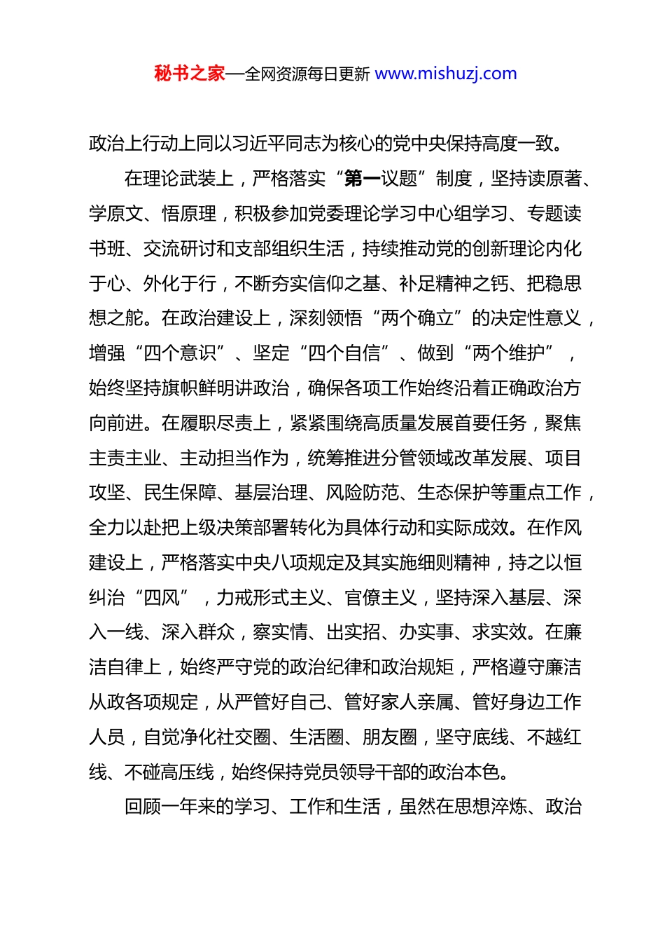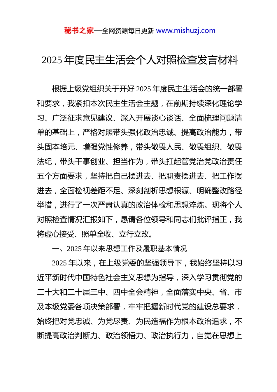 秘书之家—全网资源每日更新 www.mishuzj.com2025 年度民主生活会个人对照检查发言材料 根据上级党组织关于开好 2025 年度民主生活会的统一部署和要求,我紧扣本次民主生活会主题,在前期持续深化理论学习、广泛征求意见建议、深入开展谈心谈话、全面梳理问题清单的基础上,严格对照带头强化政治忠诚、提高政治能力,带头固本培元、增强党性修养,带头敬畏人民、敬畏组织、敬畏法纪,带头干事创业、担当作为,带头扛起管党治党政治责任五个方面要求,坚持把自己摆进去、把职责摆进去、把工作摆进去,全面检视差距不足、深刻剖析思想根源、明确整改路径举措,进行了一次严肃认真的政治体检和思想淬炼。现将个人对照检查情况汇报如下,恳请各位领导和同志们批评指正,我将虚心接受、照单全收、立行立改。一、2025 年以来思想工作及履职基本情况2025 年以来,在上级党委的坚强领导下,我始终坚持以习近平新时代中国特色社会主义思想为指导,深入学习贯彻党的二十大和二十届三中、四中全会精神,全面落实中央、省、市及本级党委各项决策部署,牢牢把握新时代党的建设总要求,始终把对党忠诚、为党尽责、为民造福作为根本政治追求,不断提高政治判断力、政治领悟力、政治执行力,自觉在思想上秘书之家—全网资源每日更新 www.mishuzj.com政治上行动上同以习近平同志为核心的党中央保持高度一致。在理论武装上,严格落实“第一议题”制度,坚持读原著、学原文、悟原理,积极参加党委理论学习中心组学习、专题读书班、交流研讨和支部组织生活,持续推动党的创新理论内化于心、外化于行,不断夯实信仰之基、补足精神之钙、把稳思想之舵。在政治建设上,深刻领悟“两个确立”的决定性意义,增强“四个意识”、坚定“四个自信”、做到“两个维护”,始终坚持旗帜鲜明讲政治,确保各项工作始终沿着正确政治方向前进。在履职尽责上,紧紧围绕高质量发展首要任务,聚焦主责主业、主动担当作为,统筹推进分管领域改革发展、项目攻坚、民生保障、基层治理、风险防范、生态保护等重点工作,全力以赴把上级决策部署转化为具体行动和实际成效。在作风建设上,严格落实中央八项规定及其实施细则精神,持之以恒纠治“四风”,力戒形式主义、官僚主义,坚持深入基层、深入一线、深入群众,察实情、出实招、办实事、求实效。在廉洁自律上,始终严守党的政治纪律和政治规矩,严格遵守廉洁从政各项规定,从严管好自己、管好家人亲属、管好身边工作人员,自觉净化社交圈、生活圈、朋友圈,坚守底线、不越红线、不碰高压线,始终保持党员领导干部的政治本色。回顾一年来的学习、工作和生活,虽然在思想淬炼、政治秘书之家—全网资源每日更新 www.mishuzj.com历练、实践锻炼、专业训练上取得了一定进步,但对照新时代新征程新使命、对照党章党规党纪、对照人民群众新期待、对照先进典型新标杆,通过自我检视、群众提、同事帮、上级点,我清醒认识到,自身在思想、政治、能力、作风、纪律等方面仍存在不少短板弱项,一些问题还具有顽固性和反复性,必须以刀刃向内的自我革命精神,深挖根源、靶向整改、久久为功。二、存在的主要问题和具体表现(一)在带头强化政治忠诚、提高政治能力方面一是理论学习系统性不足,存在碎片化、浅表化问题。能够按要求参加集体学习、完成规定学习任务,但主动学习、系统学习、深度学习的自觉性不强,学习多以“被动跟进、急用现学、按需择学”为主,缺乏整体性规划、长期性坚持、体系化钻研。对习近平新时代中国特色社会主义思想的历史逻辑、理论逻辑、实践逻辑把握不够透彻,对贯穿其中的世界观、方法论和立场观点方法领悟不够深刻,满足于“读过、学过、记过”,没有真正做到学深悟透、融会贯通、入脑入心。对党的创新理论与分管领域工作的结合点、切入点、发力点研究不深,理论指导实践、破解难题的实效不够明显。二是学用结合不够紧密,成果转化能力存在短板。学习与实践“两张皮”的问题尚未根本解决,把学习当作任务完成多、秘书之家—全网资源每日更新 www.mishuzj.com结合实际运用少,运用党的创新理论分析新形势、研究新问题、化解新矛盾的能力不足。面对改革...