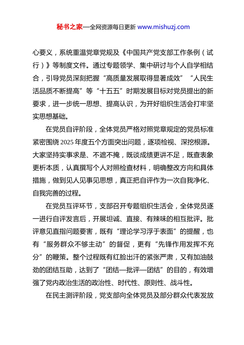 秘书之家—全网资源每日更新 www.mishuzj.com2025 年度组织生活会支部民主评议党员情况总结报告 为深入贯彻落实全面从严治党战略部署,持续锻造忠诚干净担当的党员队伍,切实提升基层党组织政治功能和组织功能,按照局党委统一安排,我支部于 2026 年*月扎实开展了 2025 年度组织生活会暨民主评议党员工作。本次评议紧扣学习贯彻党的二十大和二十届四中全会精神主线,既是一次严肃的党内政治生活淬炼,也是一场深刻的党性教育和思想洗礼。全体党员坚持刀刃向内、自我革命,在查摆问题中校准方向,在相互批评中凝聚共识,在整改提升中砥砺初心,有效激发了奋进新征程的内生动力。现将有关情况总结如下:一、工作开展情况本次民主评议严格遵循“严、实、细”原则,精心组织、规范程序,确保全过程高质量、见实效。工作分五个阶段有序推进:学习动员、个人自评、党员互评、民主测评、组织评定,形成闭环管理链条。在学习动员阶段,党支部组织全体党员深入学习领会党的二十大及二十届三中、四中全会精神,原原本本研读《中共中央关于制定国民经济和社会发展第十五个五年规划的建议》核秘书之家—全网资源每日更新 www.mishuzj.com心要义,系统重温党章党规及《中国共产党支部工作条例(试行)》等制度文件。通过专题领学、集中研讨与个人自学相结合,引导党员深刻把握“高质量发展取得显著成效”“人民生活品质不断提高”等“十五五”时期发展目标对党员提出的新要求,进一步统一思想、提高认识,为开好组织生活会打牢坚实思想基础。在党员自评阶段,全体党员严格对照党章规定的党员标准紧密围绕 2025 年度五个方面突出问题,逐项检视、深挖根源。大家坚持实事求是、不遮不掩,既谈成绩更讲不足,既查表象更析本质,认真撰写个人对照检查材料,明确整改方向和具体措施,做到见人见事见思想,真正把自评作为一次自我净化、自我完善的过程。在党员互评环节,支部召开专题组织生活会,全体党员逐一进行自评发言后,开展坦诚、直接、有辣味的相互批评。批评意见直指问题要害,既有“理论学习浮于表面”的提醒,也有“服务群众不够主动”的督促,更有“先锋作用发挥不充分”的鞭策。整个过程既有红脸出汗的紧张严肃,又有加油鼓劲的团结互助,达到了“团结—批评—团结”的目的,有效增强了党内政治生活的政治性、时代性、原则性、战斗性。在民主测评阶段,党支部向全体党员及部分群众代表发放秘书之家—全网资源每日更新 www.mishuzj.com测评表,采取无记名方式,按照“优秀”“合格”“基本合格”“不合格”四个等次进行客观公正评价。测评过程坚持标准、规范操作,确保结果真实反映党员日常表现和群众公认度。在组织考察阶段,支委会综合党员自评、互评意见及民主测评结果,结合党员一贯表现和岗位履职情况,对每名党员作出实事求是、客观公正的组织评定,并及时向本人反馈,提出改进要求,推动形成“评议—反馈—整改—提升”的良性循环。二、评议结果本次民主评议,党支部应有党员 32 名,实到 31 名,1 名同志因病履行请假手续,参评率达 96.9%。经综合评定,共评出“优秀”等次党员 6 名,占党员总数的 18.8%;“合格”等次党员 25 名,占 78.1%;无“基本合格”和“不合格”等次党员。总体来看,支部党员队伍主流是好的,绝大多数同志能够自觉加强党性锻炼,积极投身改革发展稳定各项任务,在急难险重工作中冲锋在前,在平凡岗位上默默奉献,充分展现了新时代共产党员的良好风貌。同时,评议也精准识别出部分同志在思想、作风、能力等方面存在的短板弱项,为下一步精准施策、靶向提升提供了重要依据。三、存在的主要问题通过深入查摆与相互评议,支部党员队伍在以下五个方面秘书之家—全网资源每日更新 www.mishuzj.com仍存在亟待解决的突出问题:(一)学习贯彻党的创新理论方面部分党员存在“学用两张皮”现象,对党的创新理论满足于“读过了”“学过了”,但在系统把握、融会贯通上用力不足,未能有效转化为谋划工作的思路、破解难题的办法。个别同志学习主动性不强,存在“要我学”而非“我要学”的心态,导致理论武装的深度和实践指导的效度有待提升。...