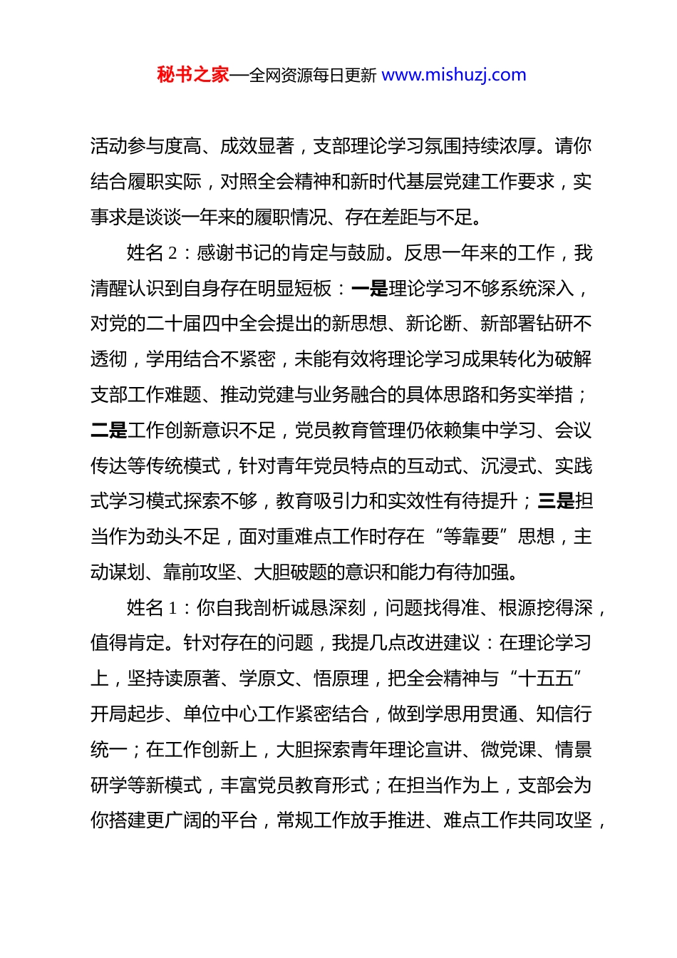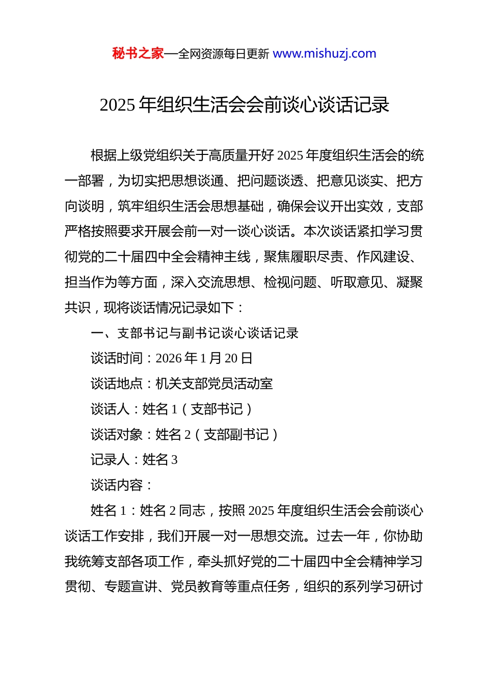秘书之家—全网资源每日更新 www.mishuzj.com2025 年组织生活会会前谈心谈话记录 根据上级党组织关于高质量开好 2025 年度组织生活会的统一部署,为切实把思想谈通、把问题谈透、把意见谈实、把方向谈明,筑牢组织生活会思想基础,确保会议开出实效,支部严格按照要求开展会前一对一谈心谈话。本次谈话紧扣学习贯彻党的二十届四中全会精神主线,聚焦履职尽责、作风建设、担当作为等方面,深入交流思想、检视问题、听取意见、凝聚共识,现将谈话情况记录如下:一、支部书记与副书记谈心谈话记录谈话时间:2026 年 1 月 20 日谈话地点:机关支部党员活动室谈话人:姓名 1(支部书记)谈话对象:姓名 2(支部副书记)记录人:姓名 3谈话内容:姓名 1:姓名 2 同志,按照 2025 年度组织生活会会前谈心谈话工作安排,我们开展一对一思想交流。过去一年,你协助我统筹支部各项工作,牵头抓好党的二十届四中全会精神学习贯彻、专题宣讲、党员教育等重点任务,组织的系列学习研讨秘书之家—全网资源每日更新 www.mishuzj.com活动参与度高、成效显著,支部理论学习氛围持续浓厚。请你结合履职实际,对照全会精神和新时代基层党建工作要求,实事求是谈谈一年来的履职情况、存在差距与不足。姓名 2:感谢书记的肯定与鼓励。反思一年来的工作,我清醒认识到自身存在明显短板:一是理论学习不够系统深入,对党的二十届四中全会提出的新思想、新论断、新部署钻研不透彻,学用结合不紧密,未能有效将理论学习成果转化为破解支部工作难题、推动党建与业务融合的具体思路和务实举措;二是工作创新意识不足,党员教育管理仍依赖集中学习、会议传达等传统模式,针对青年党员特点的互动式、沉浸式、实践式学习模式探索不够,教育吸引力和实效性有待提升;三是担当作为劲头不足,面对重难点工作时存在“等靠要”思想,主动谋划、靠前攻坚、大胆破题的意识和能力有待加强。姓名 1:你自我剖析诚恳深刻,问题找得准、根源挖得深,值得肯定。针对存在的问题,我提几点改进建议:在理论学习上,坚持读原著、学原文、悟原理,把全会精神与“十五五”开局起步、单位中心工作紧密结合,做到学思用贯通、知信行统一;在工作创新上,大胆探索青年理论宣讲、微党课、情景研学等新模式,丰富党员教育形式;在担当作为上,支部会为你搭建更广阔的平台,常规工作放手推进、难点工作共同攻坚,秘书之家—全网资源每日更新 www.mishuzj.com切实提升履职能力。姓名 2:结合工作实际,我也向书记提两点意见建议:一是希望在部署重点工作时,进一步加强统筹谋划,提前明确要求、预留充足筹备时间;二是希望书记多下沉各党小组参与学习交流,发挥头雁引领作用,更好带动全体党员深学细悟、实干担当。姓名 1:你的意见建议客观中肯、贴合实际,我全盘接受、坚决整改。今后我将进一步优化工作统筹,带头参与支部各项学习活动,与你一道把支部各项工作抓细抓实、抓出成效。二、支部书记与组织委员谈心谈话记录谈话时间:2026 年 1 月 21 日谈话地点:支部办公室谈话人:1(支部书记)谈话对象:2(组织委员)记录人:3谈话内容:1:2 同志,过去一年你负责支部组织建设、“三会一课”规范落实、党员发展与教育管理、党费收缴等工作,任务繁杂、责任重大,整体工作程序规范、推进有力,有效夯实了支部基层组织基础。结合全会关于“健全党的组织体系”的工作要求,秘书之家—全网资源每日更新 www.mishuzj.com谈谈你在履职过程中存在的短板弱项和改进方向。2:感谢书记的认可。对照新时代组织建设工作标准,我深感自身存在三方面不足:一是发展党员政治把关不够严实,对发展对象的政治素养、思想动态、日常表现考察不够全面,尤其对八小时外言行、网络言行、社会交往等方面关注核查不足;二是党员精细化管理不到位,对退休党员、流动党员等群体的联系服务不经常、不精准,导致部分党员组织生活参与率不高;三是工作统筹协调能力有待提升,面对多线任务叠加时,存在轻重不分、顾此失彼的情况,工作质效受到影响。1:你查摆的问题直击要害、切合实际,整改方向也较为清晰。发展党员是支部政治建设的...