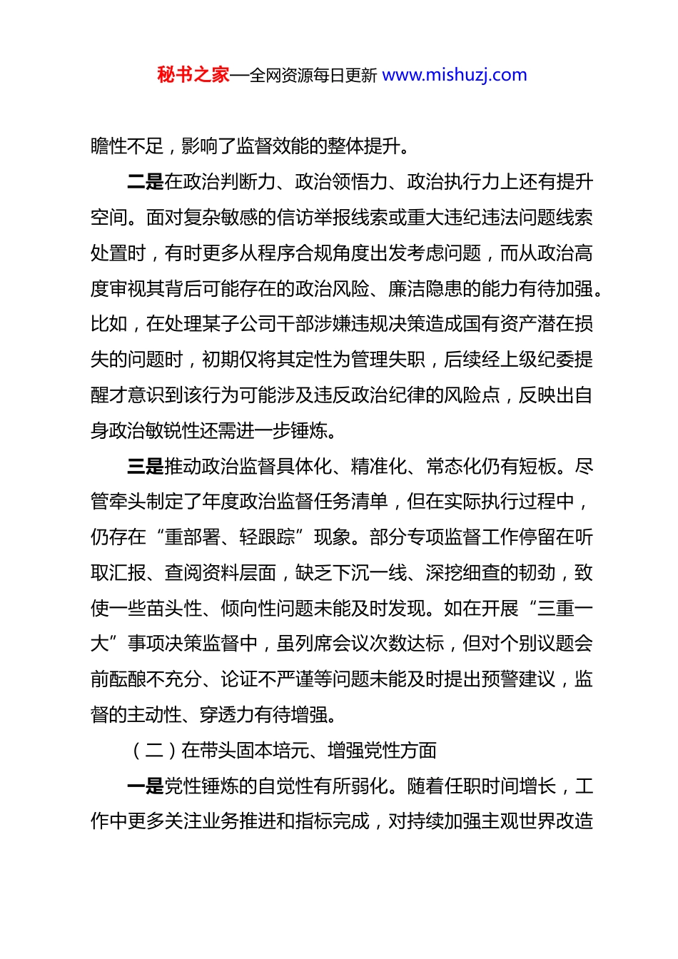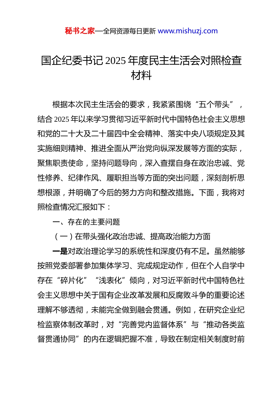 秘书之家—全网资源每日更新 www.mishuzj.com国企纪委书记 2025 年度民主生活会对照检查材料 根据本次民主生活会的要求,我紧紧围绕“五个带头”,结合 2025 年以来学习贯彻习近平新时代中国特色社会主义思想和党的二十大及二十届四中全会精神、落实中央八项规定及其实施细则精神、推进全面从严治党向纵深发展等方面的实际,聚焦职责使命,坚持问题导向,深入查摆自身在政治忠诚、党性修养、纪律作风、履职担当等方面的突出问题,深刻剖析思想根源,并明确了今后的努力方向和整改措施。下面,我将对照检查情况汇报如下:一、存在的主要问题(一)在带头强化政治忠诚、提高政治能力方面一是对政治理论学习的系统性和深度仍有不足。虽然能够按照党委部署参加集体学习、完成规定动作,但在个人自学中存在“碎片化”“浅表化”倾向,对习近平新时代中国特色社会主义思想中关于国有企业改革发展和反腐败斗争的重要论述理解不够透彻,未能完全做到融会贯通。例如,在研究企业纪检监察体制改革时,对“完善党内监督体系”与“推动各类监督贯通协同”的内在逻辑把握不准,导致在制定相关制度时前秘书之家—全网资源每日更新 www.mishuzj.com瞻性不足,影响了监督效能的整体提升。二是在政治判断力、政治领悟力、政治执行力上还有提升空间。面对复杂敏感的信访举报线索或重大违纪违法问题线索处置时,有时更多从程序合规角度出发考虑问题,而从政治高度审视其背后可能存在的政治风险、廉洁隐患的能力有待加强。比如,在处理某子公司干部涉嫌违规决策造成国有资产潜在损失的问题时,初期仅将其定性为管理失职,后续经上级纪委提醒才意识到该行为可能涉及违反政治纪律的风险点,反映出自身政治敏锐性还需进一步锤炼。三是推动政治监督具体化、精准化、常态化仍有短板。尽管牵头制定了年度政治监督任务清单,但在实际执行过程中,仍存在“重部署、轻跟踪”现象。部分专项监督工作停留在听取汇报、查阅资料层面,缺乏下沉一线、深挖细查的韧劲,致使一些苗头性、倾向性问题未能及时发现。如在开展“三重一大”事项决策监督中,虽列席会议次数达标,但对个别议题会前酝酿不充分、论证不严谨等问题未能及时提出预警建议,监督的主动性、穿透力有待增强。(二)在带头固本培元、增强党性方面一是党性锤炼的自觉性有所弱化。随着任职时间增长,工作中更多关注业务推进和指标完成,对持续加强主观世界改造秘书之家—全网资源每日更新 www.mishuzj.com的紧迫感有所下降。在参加组织生活方面,虽然能按时参加支部活动,但以普通党员身份主动发言、接受批评较少,尤其在专题组织生活会上,自我批评多集中于工作层面,触及思想深处、灵魂深处的内容不多,存在“避重就轻”现象。二是理想信念的根基还需进一步夯实。面对当前反腐败斗争依然严峻复杂的形势,个别时候产生过“疲劳厌战”情绪,特别是在连续查处几起案件后,感到压力较大,出现“歇一歇、缓一缓”的想法。这种心态虽未影响工作推进,但反映出自身在坚定理想信念、保持斗争精神方面还存在薄弱环节,没有始终以“永远在路上”的清醒坚定投身正风肃纪反腐实践。三是宗旨意识树得不够牢固。作为纪委书记,本应是职工群众利益的坚定维护者,但在日常工作中,倾听基层员工特别是普通职工对党风廉政建设意见建议的渠道还不够畅通。除信访接待日外,主动下基层调研少,与一线职工面对面交流不多,对企业内部存在的“微腐败”问题掌握不够全面。例如,有职工反映个别部门存在报销审核把关不严、变相福利发放等问题,前期未能第一时间掌握情况,说明群众观念还需进一步强化。(三)在带头敬畏人民、敬畏组织、敬畏法纪方面一是对“三个敬畏”的理解还需深化并转化为行动自觉。在敬畏人民方面,虽然始终坚持执纪为民导向,但在推动解决秘书之家—全网资源每日更新 www.mishuzj.com职工反映强烈的突出问题上,攻坚力度不够。如针对某项目长期拖欠农民工工资引发的信访问题,虽督促相关部门整改,但未主动牵头成立专班全程跟进,直到问题发酵后才介入,暴露出服务群众的主动性和责任感有待提升。在敬畏组织方面,执行民主集中制原则总体严格,但在...