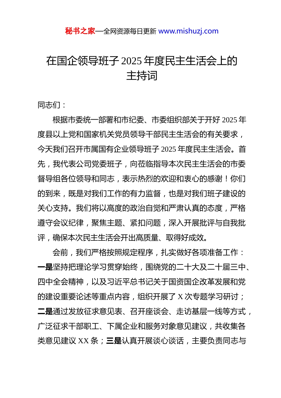 秘书之家—全网资源每日更新 www.mishuzj.com在国企领导班子 2025 年度民主生活会上的主持词 同志们:根据市委统一部署和市纪委、市委组织部关于开好 2025 年度县以上党和国家机关党员领导干部民主生活会的有关要求,今天我们召开市属国有企业领导班子 2025 年度民主生活会。首先,我代表公司党委班子,向莅临指导本次民主生活会的市委督导组各位领导和同志,表示热烈的欢迎和衷心的感谢!你们的到来,既是对我们工作的有力监督,也是对我们班子建设的关心支持。我们将以高度的政治自觉和严肃认真的态度,严格遵守会议纪律,聚焦主题、紧扣问题,深入开展批评与自我批评,确保本次民主生活会开出高质量、取得好成效。会前,我们严格按照规定程序,扎实做好各项准备工作:一是坚持把理论学习贯穿始终,围绕党的二十大及二十届三中、四中全会精神,以及习近平总书记关于国资国企改革发展和党的建设重要论述等重点内容,组织开展了 X 次专题学习研讨;二是通过发放征求意见表、召开座谈会、走访基层一线等方式,广泛征求干部职工、下属企业和服务对象意见建议,共收集各类意见建议 XX 条;三是认真开展谈心谈话,主要负责同志与秘书之家—全网资源每日更新 www.mishuzj.com班子成员之间、班子成员相互之间、班子成员与分管部门负责同志之间普遍开展了“一对一”“面对面”的谈心交心,交流思想、指出不足、提出建议;四是认真撰写对照检查材料和发言提纲,党委书记主持起草班子对照检查材料,并对班子成员发言提纲逐一审核把关,确保查摆问题准、原因剖析深、整改措施实。经报请市委组织部和市纪委审核同意,材料已按要求修改完善,具备召开会议条件。本次会议共有四项议程:第一项议程:通报上一年度民主生活会整改措施落实情况和本次民主生活会征求意见情况;第二项议程:由我代表领导班子作对照检查发言;第三项议程:班子成员依次进行个人对照检查,开展批评与自我批评;第四项议程:请市委督导组组长作点评讲话;第五项议程:由我代表班子作表态发言。下面,进行会议第一项议程:由党委副书记、总经理 XXX同志通报上一年度民主生活会整改落实情况和本次民主生活会会前征求意见情况。(通报完毕)……秘书之家—全网资源每日更新 www.mishuzj.com现在,进行会议第二项议程:由我代表领导班子作对照检查发言。(发言完毕)……现在,进行会议第三项议程:班子成员依次进行个人对照检查,开展批评与自我批评。请大家本着对党负责、对事业负责、对同志负责的态度,开门见山、直奔主题,实事求是地开展批评,虚心接受他人意见,真正达到“红脸出汗、排毒治病”的效果。(按顺序逐一进行,每人发言后其他成员对其提出批评意见)……现在,进行会议第四项议程:让我们以热烈的掌声,欢迎市委督导组组长 XXX 同志作指导点评讲话,大家欢迎!(督导组讲话完毕)同志们,刚才,市委督导组 XXX 组长作了十分重要的讲话,充分肯定了我们这次民主生活会的前期准备和整体成效,认为会议主题鲜明、程序规范、组织严密、批评诚恳,达到了预期目的。同时,也精准指出了我们在理论武装深度、问题查摆广度、整改落实力度等方面存在的不足,并就下一步加强班子建秘书之家—全网资源每日更新 www.mishuzj.com设、深化问题整改、推动企业发展提出了明确要求。讲话站位高、把脉准、指导性强,具有很强的政治性、针对性和可操作性,为我们今后的工作指明了方向、提供了遵循。我们一定认真学习领会,坚决抓好贯彻落实。下面,进行会议第五项议程:由我代表领导班子作表态发言。针对此次民主生活会查摆出的问题和督导组提出的指导意见,我们班子将以刀刃向内的勇气、抓铁有痕的决心,坚决扛起整改责任,切实把会议成果转化为推动企业高质量发展的实际成效。重点从以下四个方面抓好落实:一、以思想破冰引领发展突围,在理论武装上再深化。坚持把学习贯彻习近平新时代中国特色社会主义思想作为首要政治任务,持续在学懂弄通做实上下功夫,特别是深入领会党中央关于国有企业改革发展和党的建设新部署新要求,准确把握发展新质生产力的核心要义。紧密结合企业实际,把学习成果转化为谋划战...