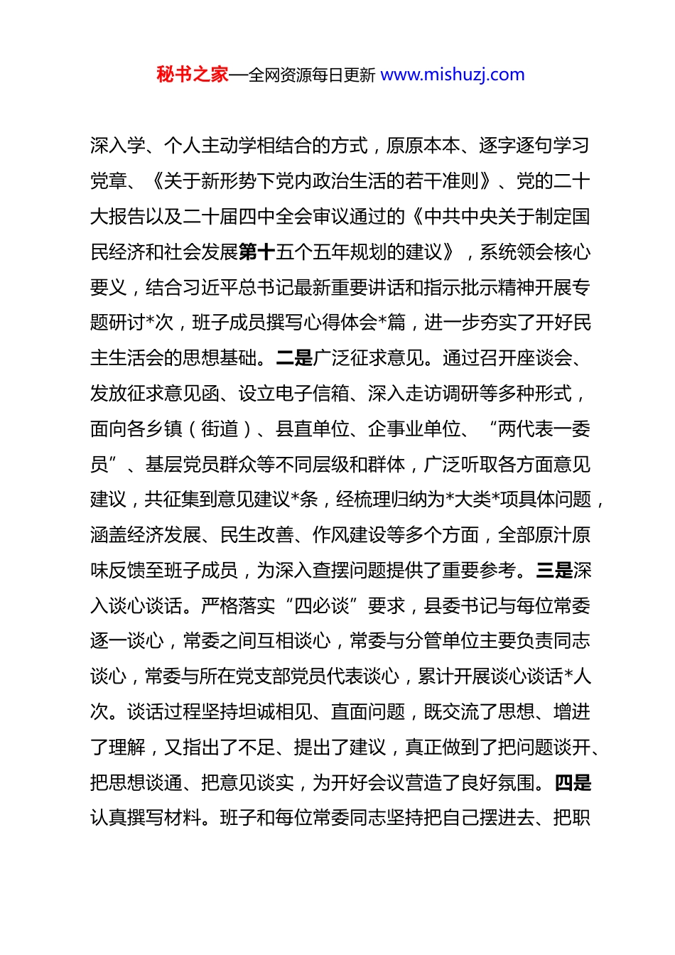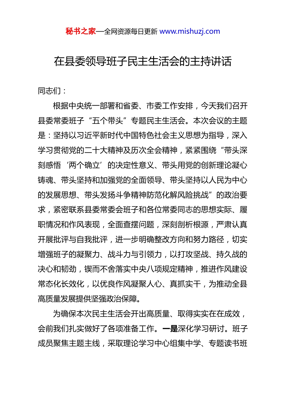 秘书之家—全网资源每日更新 www.mishuzj.com在县委领导班子民主生活会的主持讲话 同志们:根据中央统一部署和省委、市委工作安排,今天我们召开县委常委班子“五个带头”专题民主生活会。本次会议的主题是:坚持以习近平新时代中国特色社会主义思想为指导,深入学习贯彻党的二十大精神及历次全会精神,紧紧围绕“带头深刻感悟‘两个确立’的决定性意义、带头用党的创新理论凝心铸魂、带头坚持和加强党的全面领导、带头坚持以人民为中心的发展思想、带头发扬斗争精神防范化解风险挑战”的政治要求,紧密联系县委常委会班子和各位常委同志的思想实际、履职情况和作风表现,全面查摆问题,深刻剖析根源,严肃认真开展批评与自我批评,进一步明确整改方向和努力路径,切实增强班子的凝聚力、战斗力与引领力,以打攻坚战、持久战的决心和韧劲,锲而不舍落实中央八项规定精神,推进作风建设常态化长效化,以优良作风凝聚人心、真抓实干,为推动全县高质量发展提供坚强政治保障。为确保本次民主生活会开出高质量、取得实实在在成效,会前我们扎实做好了各项准备工作。一是深化学习研讨。班子成员聚焦主题主线,采取理论学习中心组集中学、专题读书班秘书之家—全网资源每日更新 www.mishuzj.com深入学、个人主动学相结合的方式,原原本本、逐字逐句学习党章、《关于新形势下党内政治生活的若干准则》、党的二十大报告以及二十届四中全会审议通过的《中共中央关于制定国民经济和社会发展第十五个五年规划的建议》,系统领会核心要义,结合习近平总书记最新重要讲话和指示批示精神开展专题研讨*次,班子成员撰写心得体会*篇,进一步夯实了开好民主生活会的思想基础。二是广泛征求意见。通过召开座谈会、发放征求意见函、设立电子信箱、深入走访调研等多种形式,面向各乡镇(街道)、县直单位、企事业单位、“两代表一委员”、基层党员群众等不同层级和群体,广泛听取各方面意见建议,共征集到意见建议*条,经梳理归纳为*大类*项具体问题,涵盖经济发展、民生改善、作风建设等多个方面,全部原汁原味反馈至班子成员,为深入查摆问题提供了重要参考。三是深入谈心谈话。严格落实“四必谈”要求,县委书记与每位常委逐一谈心,常委之间互相谈心,常委与分管单位主要负责同志谈心,常委与所在党支部党员代表谈心,累计开展谈心谈话*人次。谈话过程坚持坦诚相见、直面问题,既交流了思想、增进了理解,又指出了不足、提出了建议,真正做到了把问题谈开、把思想谈通、把意见谈实,为开好会议营造了良好氛围。四是认真撰写材料。班子和每位常委同志坚持把自己摆进去、把职秘书之家—全网资源每日更新 www.mishuzj.com责摆进去、把工作摆进去,紧扣“五个带头”要求,逐项对照检查,深入查找突出问题,深刻剖析思想根源,明确整改措施,反复修改完善对照检查材料和个人发言提纲,并按规定程序报审把关,确保了问题找准、根源析透、措施务实。本次会议共有五项议程:第一项议程,由我代表县委常委班子作对照检查发言;第二项议程,县委常委班子成员逐一进行个人对照检查,每位同志发言后,其他同志对其提出批评意见;第三项议程,针对所提批评意见,作简要表态回应;第四项议程,请到会指导的上级领导讲话;第五项议程,由我作会议总结,并就抓好整改落实工作提出具体要求。刚才,我代表县委常委班子作了对照检查,各位常委同志依次作了深刻的个人对照检查。大家开门见山、实事求是,相互之间开展了严肃认真、“辣味”十足的批评,既指出了具体问题,也提出了改进建议,充分体现了对党忠诚、对事业负责、对同志关心的政治自觉和党性修养。上级党委**同志代表指导组作了重要讲话,充分肯定了我县此次民主生活会准备充分、主题聚焦、查摆深入、批评诚恳,达到了统一思想、增进团结、改进工作的预期目的,并就进一步加强班子建设、深化问题整秘书之家—全网资源每日更新 www.mishuzj.com改、推动改革发展提出了明确要求和殷切期望,讲话政治性、指导性、针对性很强,我们要认真学习领会,坚决贯彻落实。总体来看,这次专题民主生活会体现了四个鲜明特点:一是政治站位高,准备工作扎实。班子成员自...