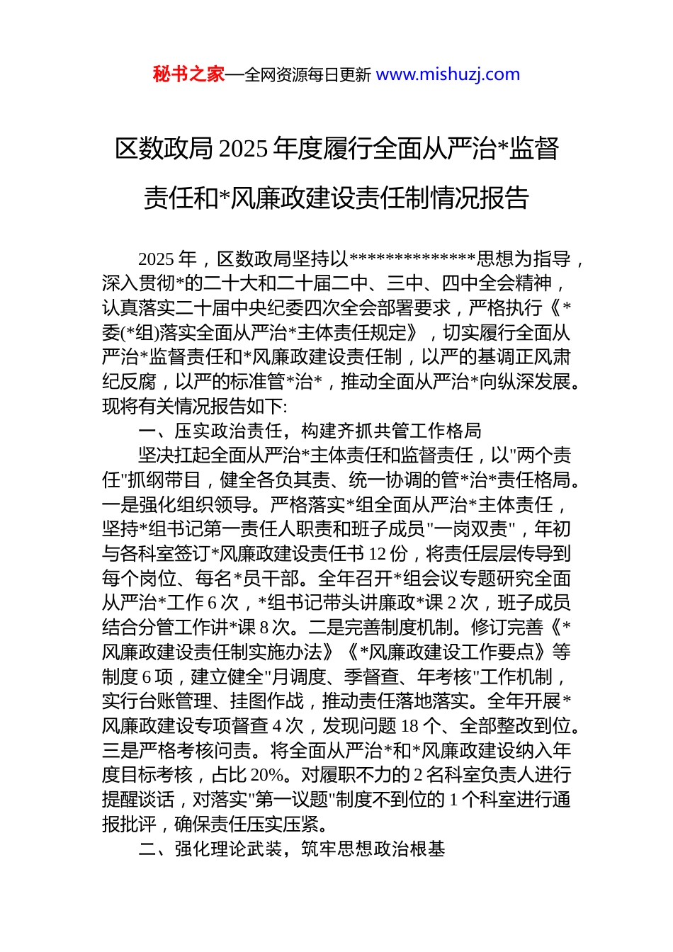 秘书之家—全网资源每日更新 www.mishuzj.com区数政局 2025 年度履行全面从严治*监督责任和*风廉政建设责任制情况报告2025 年,区数政局坚持以**************思想为指导,深入贯彻*的二十大和二十届二中、三中、四中全会精神,认真落实二十届中央纪委四次全会部署要求,严格执行《*委(*组)落实全面从严治*主体责任规定》,切实履行全面从严治*监督责任和*风廉政建设责任制,以严的基调正风肃纪反腐,以严的标准管*治*,推动全面从严治*向纵深发展。现将有关情况报告如下:一、压实政治责任,构建齐抓共管工作格局坚决扛起全面从严治*主体责任和监督责任,以"两个责任"抓纲带目,健全各负其责、统一协调的管*治*责任格局。一是强化组织领导。严格落实*组全面从严治*主体责任,坚持*组书记第一责任人职责和班子成员"一岗双责",年初与各科室签订*风廉政建设责任书 12 份,将责任层层传导到每个岗位、每名*员干部。全年召开*组会议专题研究全面从严治*工作 6 次,*组书记带头讲廉政*课 2 次,班子成员结合分管工作讲*课 8 次。二是完善制度机制。修订完善《*风廉政建设责任制实施办法》《*风廉政建设工作要点》等制度 6 项,建立健全"月调度、季督查、年考核"工作机制,实行台账管理、挂图作战,推动责任落地落实。全年开展*风廉政建设专项督查 4 次,发现问题 18 个、全部整改到位。三是严格考核问责。将全面从严治*和*风廉政建设纳入年度目标考核,占比 20%。对履职不力的 2 名科室负责人进行提醒谈话,对落实"第一议题"制度不到位的 1 个科室进行通报批评,确保责任压实压紧。二、强化理论武装,筑牢思想政治根基秘书之家—全网资源每日更新 www.mishuzj.com坚持把学习贯彻**************思想作为首要政治任务,以理论清醒保证政治坚定、行动自觉。一是深化理论学习。严格落实"第一议题"制度,全年*组理论学习中心组学习 24 次,重点学习*的二十届四中全会精神、******关于*的自我革命的重要思想,学习《中国共产 dj 律处分条例》等*内法规。组织全体*员干部开展理论测试 3 次,平均成绩达到 95.2 分。二是巩固教育成果。持续巩固深化 dj 学习教育成果,组织全体*员原原本本学习《条例》,编印《dj 学习教育应知应会手册》86 册,开展专题研讨 6 次、警示教育 4 次。建立"学习教育、检视整改、建章立制"长效机制,查摆整改问题 26 个,建立完善制度 12 项。三是强化政治监督。围绕"两个维护"开展政治监督,对照*中央决策部署和上级*委工作要求,梳理数字政府建设、数据资源管理、政务服务优化等重点任务清单 38 项,建立台账、定期督办,确保政令畅通、令行禁止。三、严明纪律规矩,持续推进正风肃纪坚持把纪律挺在前面,以严明纪律规范行为,以优良作风凝聚力量。一是强化纪律教育。深入学习贯彻《中国共产 dj 律处分条例》,组织全体*员干部开展纪律教育 12次,观看警示教育片 6 部,参观廉政教育基地 2 次,用身边人身边事警醒教育干部。开展新任科级干部廉政谈话 6 人次、日常提醒谈话 28 人次,做到抓早抓小、防微杜渐。二是深化作风建设。扎实开展深入贯彻落实中央八项规定精神学习教育。持续贯彻落实中央八项规定精神,严格执行"三个不得"要求,重点整治形式主义、官僚主义问题。全年压减会议文件 20%,优化精简督查检查事项 6 项,为基层减负增效。开展"四风"问题专项整治,查摆问题 12 个、全部完成整改。严格公务接待、公车使用、办公用房等管理,全年"三公"经费同比下降 15.6%。三是严格纪律执行。加强日常监督管理,建立*员干部廉政档案 86 份,开展廉政风险排查,梳理风险点 38 个、制定防控措施 126 条。严格执行请秘书之家—全网资源每日更新 www.mishuzj.com示报告制度、个人事项报告制度、领导干部外出报备制度全年未发生违纪违规问题,队伍保持纯洁稳定。四、强化权力监督,规范权力运行机制坚持把权力关进制度笼子,完善监督体系,确保权力在阳光下运行。一是健全监督机制。建立健全"*组主导、纪检组专责、部门协同、群众参与"的监督格局,形成监督合力。强化*内监督,严格执行民主生活...