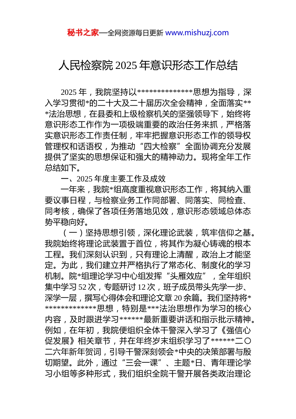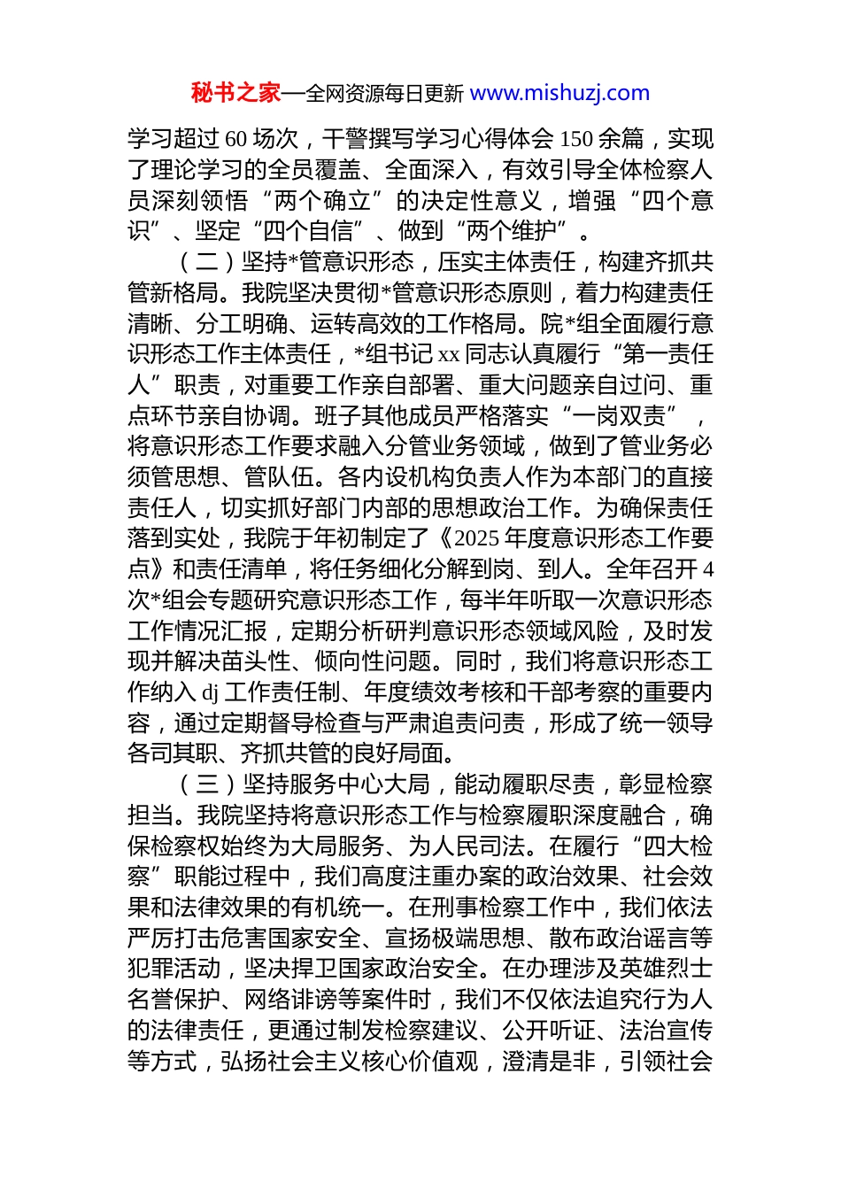 秘书之家—全网资源每日更新 www.mishuzj.com人民检察院 2025 年意识形态工作总结2025 年,我院坚持以**************思想为指导,深入学习贯彻*的二十大及二十届历次全会精神,全面落实***法治思想,在县委和上级检察机关的坚强领导下,始终将意识形态工作作为一项极端重要的政治任务来抓,严格落实意识形态工作责任制,牢牢把握意识形态工作的领导权管理权和话语权,为推动“四大检察”全面协调充分发展提供了坚实的思想保证和强大的精神动力。现将全年工作总结如下。一、2025 年度主要工作及成效一年来,我院*组高度重视意识形态工作,将其纳入重要议事日程,与检察业务工作同部署、同落实、同检查、同考核,确保了各项任务落地见效,意识形态领域总体态势平稳向好。(一)坚持思想引领,深化理论武装,筑牢信仰之基。我院始终将理论武装置于首位,将其作为凝心铸魂的根本工程。我们深刻认识到,只有理论上清醒,政治上才能坚定。为此,我们建立并严格执行了常态化、制度化的学习机制。院*组理论学习中心组发挥“头雁效应”,全年组织集中学习 52 次,专题研讨 12 次,班子成员带头先学一步、深学一层,撰写心得体会和理论文章 20 余篇。我们坚持将**************思想,特别是***法治思想作为学习的核心内容,及时跟进学习******最新重要讲话和指示批示精神。例如,在年初,我院便组织全体干警深入学习了《强信心促发展》相关章节,并在年终岁末组织学习了******二〇二六年新年贺词,引导干警深刻领会*中央的决策部署与殷切期望。此外,通过“三会一课”、主题*日、青年理论学习小组等多种形式,我们组织全院干警开展各类政治理论秘书之家—全网资源每日更新 www.mishuzj.com学习超过 60 场次,干警撰写学习心得体会 150 余篇,实现了理论学习的全员覆盖、全面深入,有效引导全体检察人员深刻领悟“两个确立”的决定性意义,增强“四个意识”、坚定“四个自信”、做到“两个维护”。(二)坚持*管意识形态,压实主体责任,构建齐抓共管新格局。我院坚决贯彻*管意识形态原则,着力构建责任清晰、分工明确、运转高效的工作格局。院*组全面履行意识形态工作主体责任,*组书记 xx 同志认真履行“第一责任人”职责,对重要工作亲自部署、重大问题亲自过问、重点环节亲自协调。班子其他成员严格落实“一岗双责”,将意识形态工作要求融入分管业务领域,做到了管业务必须管思想、管队伍。各内设机构负责人作为本部门的直接责任人,切实抓好部门内部的思想政治工作。为确保责任落到实处,我院于年初制定了《2025 年度意识形态工作要点》和责任清单,将任务细化分解到岗、到人。全年召开 4次*组会专题研究意识形态工作,每半年听取一次意识形态工作情况汇报,定期分析研判意识形态领域风险,及时发现并解决苗头性、倾向性问题。同时,我们将意识形态工作纳入 dj 工作责任制、年度绩效考核和干部考察的重要内容,通过定期督导检查与严肃追责问责,形成了统一领导各司其职、齐抓共管的良好局面。(三)坚持服务中心大局,能动履职尽责,彰显检察担当。我院坚持将意识形态工作与检察履职深度融合,确保检察权始终为大局服务、为人民司法。在履行“四大检察”职能过程中,我们高度注重办案的政治效果、社会效果和法律效果的有机统一。在刑事检察工作中,我们依法严厉打击危害国家安全、宣扬极端思想、散布政治谣言等犯罪活动,坚决捍卫国家政治安全。在办理涉及英雄烈士名誉保护、网络诽谤等案件时,我们不仅依法追究行为人的法律责任,更通过制发检察建议、公开听证、法治宣传等方式,弘扬社会主义核心价值观,澄清是非,引领社会秘书之家—全网资源每日更新 www.mishuzj.com风尚。我们紧密围绕县委县政府的中心工作和人民群众的“急难愁盼”问题,找准检察工作的切入点和着力点,在服务保障高质量发展、维护社会安全稳定、促进社会公平正义的司法实践中,生动诠释了检察机关的政治属性和责任担当,让人民群众在每一个司法案件中感受到公平正义与主流价值的引领。(四)坚持底线思维,严管各类阵地,有效防范化解风险。我院牢固树立阵地意识,严格落实主管主办和属地...