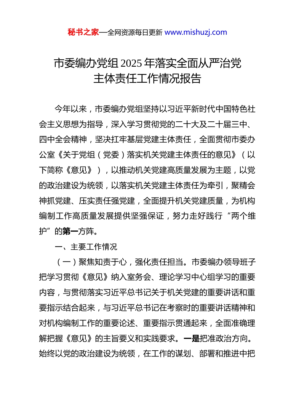 秘书之家—全网资源每日更新 www.mishuzj.com市委编办党组 2025 年落实全面从严治党主体责任工作情况报告 今年以来,市委编办党组坚持以习近平新时代中国特色社会主义思想为指导,深入学习贯彻党的二十大及二十届三中、四中全会精神,坚决扛牢基层党建主体责任,全面贯彻市委办公室《关于党组(党委)落实机关党建主体责任的意见》(以下简称《意见》),以推动机关党建高质量发展为主题,以党的政治建设为统领,以落实机关党建主体责任为牵引,聚精会神抓党建、压实责任强党建,全面提升机关党建质量,为机构编制工作高质量发展提供坚强保证,努力走好践行“两个维护”的第一方阵。一、主要工作情况(一)聚焦知责于心,强化责任担当。市委编办领导班子把学习贯彻《意见》纳入室务会、理论学习中心组学习的重要内容,与贯彻落实习近平总书记关于机关党建的重要讲话和重要指示结合起来,与习近平总书记在考察时的重要讲话精神和对机构编制工作的重要论述、重要指示贯通起来,全面准确理解把握《意见》的主旨要义和实践要求。一是把准政治方向。始终以党的政治建设为统领,在工作的谋划、部署和推进中把秘书之家—全网资源每日更新 www.mishuzj.com党的政治标准和政治要求贯穿全过程,保持坚定的政治定力,持续深化政治机关建设。组织党员干部深入学习关于习近平总书记党的建设的重要思想,系统掌握新时代党的建设总要求和根本原则,教育引导党员干部坚定拥护“两个确立”,带头践行“两个维护”,不断提高政治判断力、政治领悟力和政治执行力。二是细化责任清单。将机关党建与年度全面从严治党工作、意识形态等工作紧密结合,将《意见》分解为 3 个台账共43 条任务,即《市委编办领导班子落实机关党建主体责任台账》28 条、《市委编办主要领导严格履行机关党建第一责任人职责台账》7 条、《市委编办其他领导班子成员严格落实机关党建“一岗双责”台账》8 条,具体化、条目化涵盖政治建设、思想建设、组织建设、作风建设、纪律建设、制度建设以及反腐败斗争等各方面要求,明确“谁来抓、抓什么、抓到什么程度”,真正把党建责任量化到事、明确到岗、精准到人、定位到时。三是筑牢思想根基。在明晰责任的基础上,着力唤醒主体意识,激发内生动力。时刻牢记思想是行动的先导,思想统一是政治统一、行动统一的基础,要把抓好党建作为最大政绩,坚决承担好、落实好机关党建主体责任,切实用坚实的思想理论支撑和科学理论的指引来实现机构编制工作高质量发展。通过民主生活会、专题会、谈心谈话等方式,经常性对照责任清秘书之家—全网资源每日更新 www.mishuzj.com单反思检视,查找差距不足,变“要我抓”为“我要抓”,变“被动应付”为“主动作为”,真正将党建责任铭刻于心、融入血脉。(二)聚焦担责于身,压实责任链条。将责任层层分解、环环相扣、压紧压实,形成横向到边、纵向到底的严密责任网络,确保压力传导不衰减、责任覆盖无死角。一是强化主责意识。坚持“书记抓、抓书记”,严格履行党组(党委)书记第一责任人责任,抓班子,带队伍,将党建责任扛在肩上、抓在手中,做到重要工作亲自部署、重大问题亲自过问、重点环节亲自协调。在谋划全局、部署任务时,优先考虑党建工作;在资源配置、力量配备上,优先保障党建工作;在检查考核、评优评先时,优先衡量党建成效,推动其他班子成员认真履行“一岗双责”,并传导到所属基层党组织书记,推动种好“党建责任田”,发挥“头雁”带“群雁”效应。二是落实“一岗双责”。领导班子成员严格落实“一岗双责”,将分管领域业务工作与党建工作同谋划、同部署、同推进、同考核,定期研究、检查、报告分管范围内的党建工作情况。督促指导分管处室(中心)党支部书记履行好职责,形成一级抓一级、层层抓落实的工作格局,确保党建责任与业务管理责任相互嵌入、一体落实。三是健全传导机制。压力传导不到底,责任落实必悬秘书之家—全网资源每日更新 www.mishuzj.com空。搭建党组(党委)履行主体责任、机关党委和所属党支部配合落实的工作体系,着力打通责任落实的“最后一公里”,将党建责任和要求精准传递到每一个支部、...