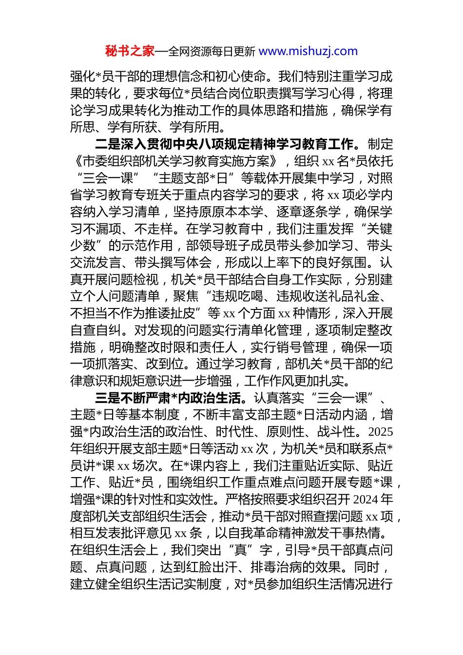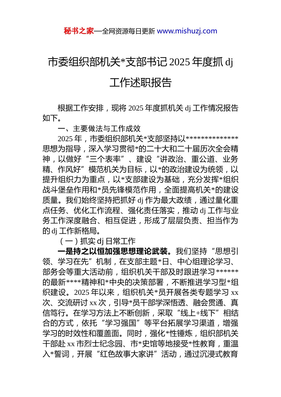 秘书之家—全网资源每日更新 www.mishuzj.com市委组织部机关*支部书记 2025 年度抓 dj工作述职报告根据工作安排,现将 2025 年度抓机关 dj 工作情况报告如下。一、主要做法与工作成效2025 年,市委组织部机关*支部坚持以**************思想为指导,深入学习贯彻*的二十大和二十届历次全会精神,以做好“三个表率”、建设“讲政治、重公道、业务精、作风好”模范机关为目标,以*的政治建设为统领,以提升组织力为重点,以*支部建设为基础,充分发挥*组织战斗堡垒作用和*员先锋模范作用,全面提高机关*的建设质量。我们始终坚持把抓好 dj 作为最大政绩,通过量化重点任务、优化工作流程、强化责任落实,推动 dj 工作与业务工作深度融合、相互促进,形成了层层负责、担当作为的 dj 工作新格局。(一)抓实 dj 日常工作一是持之以恒加强思想理论武装。我们坚持“思想引领、学习在先”机制,在支部主题*日、中心组理论学习、部务会等重大活动前,组织机关干部及时跟进学习******的最新****精神和*中央的决策部署,不断推进学习型*组织建设。2025 年以来,组织机关*员开展各类专题学习 xx次、交流研讨 xx 次,引导*员干部学深悟透、融会贯通、真信笃行。在学习方法上不断创新,采取“线上+线下”相结合的方式,依托“学习强国”等平台拓展学习渠道,增强学习的时效性和覆盖面。同时,强化*性锤炼,组织部机关干部赴 xx 市烈士纪念园、市*史馆等地接受*性教育,重温入*誓词,开展“红色故事大家讲”活动,通过沉浸式教育秘书之家—全网资源每日更新 www.mishuzj.com强化*员干部的理想信念和初心使命。我们特别注重学习成果的转化,要求每位*员结合岗位职责撰写学习心得,将理论学习成果转化为推动工作的具体思路和措施,确保学有所思、学有所获、学有所用。二是深入贯彻中央八项规定精神学习教育工作。制定《市委组织部机关学习教育实施方案》,组织 xx 名*员依托“三会一课”“主题支部*日”等载体开展集中学习,对照省学习教育专班关于重点内容学习的要求,将 xx 项必学内容纳入学习清单,坚持原原本本学、逐章逐条学,确保学习不漏项、不走样。在学习教育中,我们注重发挥“关键少数”的示范作用,部领导班子成员带头参加学习、带头交流发言、带头撰写体会,形成以上率下的良好氛围。认真开展问题检视,机关*员干部结合自身工作实际,分别建立个人问题清单,聚焦“违规吃喝、违规收送礼品礼金、不担当不作为推诿扯皮”等 xx 个方面 xx 种情形,深入开展自查自纠。对发现的问题实行清单化管理,逐项制定整改措施,明确整改时限和责任人,实行销号管理,确保一项一项抓落实、改到位。通过学习教育,部机关*员干部的纪律意识和规矩意识进一步增强,工作作风更加扎实。三是不断严肃*内政治生活。认真落实“三会一课”、主题*日等基本制度,不断丰富支部主题*日活动内涵,增强*内政治生活的政治性、时代性、原则性、战斗性。2025年组织开展支部主题*日等活动 xx 次,为机关*员和联系点*员讲*课 xx 场次。在*课内容上,我们注重贴近实际、贴近工作、贴近*员,围绕组织工作重点难点问题开展专题*课,增强*课的针对性和实效性。严格按照要求组织召开 2024 年度部机关支部组织生活会,推动*员干部对照查摆问题 xx 项,相互发表批评意见 xx 条,以自我革命精神激发干事热情。在组织生活会上,我们突出“真”字,引导*员干部真点问题、点真问题,达到红脸出汗、排毒治病的效果。同时,建立健全组织生活记实制度,对*员参加组织生活情况进行秘书之家—全网资源每日更新 www.mishuzj.com量化考核,将考核结果作为*员评先评优的重要依据,增强*员参加组织生活的自觉性和主动性。四是抓实抓细*员队伍建设。加强对*员的教育、管理、监督和服务,增强*员教育管理的针对性和实效性。严格*费收缴管理,规范年度*费核算,确保*费收缴及时、足额。建立定期谈心谈话制度,支部委员分工负责,每季度至少与机关*员谈心谈话 xx 次,实时掌握思想动态,及时发现和解决苗头性、倾向性问题。在*员发展工作上,我们坚持政治标准,严格程序,注重从业务骨干中发展*员,2...
