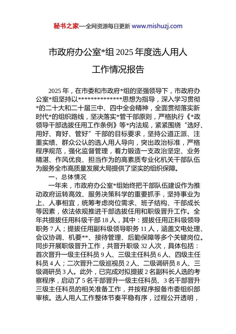 秘书之家—全网资源每日更新 www.mishuzj.com市政府办公室*组 2025 年度选人用人工作情况报告2025 年,在市委和市政府*组的坚强领导下,市政府办公室*组坚持以**************思想为指导,深入学习贯彻*的二十大和二十届三中、四中全会精神,全面贯彻落实新时代*的组织路线,坚决落实*管干部原则,严格执行《*政领导干部选拔任用工作条例》等*内法规,紧紧围绕“选好、用好、育好、管好”干部的目标要求,坚持公道正派、注重实绩、群众公认的选人用人导向,突出政治标准,严格程序规范,强化监督管理,着力锻造一支政治坚定、业务精湛、作风优良、担当作为的高素质专业化机关干部队伍为服务全市高质量发展大局提供了坚实的组织保障。一、总体情况一年来,市政府办公室*组始终把干部队伍建设作为推动政府运转高效、服务决策科学的重要抓手,坚持事业为上、人事相宜,统筹考虑岗位需求、班子结构、干部成长等因素,依法依规推进干部选拔任用和职级晋升工作。全年共提拔任用科级干部 18 人,其中:提拔任用正科级领导职务 7 人;提拔任用副科级领导职务 11 人,涵盖文电处理、会议协调、机要**、接待管理、后勤保障等多个关键岗位。同步开展职级晋升工作,共晋升职级 32 人次,具体包括:首次晋升一级主任科员 9 人、三级主任科员 6 人、四级主任科员 4 人;二次晋升二级巡视员 2 人、二级调研员 8 人、三级调研员 3 人。此外,已完成对拟提拔 2 名副科长人选的考察程序,启动了 5 名干部晋升一级主任科员、3 名干部晋升三级主任科员的相关准备工作,并按程序报备市委组织部审核。选人用人工作整体节奏平稳有序,过程公开透明,秘书之家—全网资源每日更新 www.mishuzj.com结果公平公正,得到了广大干部职工的普遍认可。二、主要工作情况(一)坚持*管干部,把牢政治首关,确保选人用人方向不偏。办公室*组始终坚持将政治建设摆在首位,严格落实“*管干部”根本原则,牢牢把握选人用人的政治方向和政治标准,在组织部门开展的“一报告两评议”工作中,我办选人用人工作满意度测评达 96.3%,较上年提升 1.1 个百分点,位列市级机关前列,充分体现了干部群众对*组工作的高度认同。一是严守选任基本原则。坚持德才兼备、以德为先,五湖四海、任人唯贤,坚持事业为上、人岗相适、人事相宜,坚持民主集中制和依法依规办事。在每一次动议、推荐、考察、决定环节中,均做到集体研究、充分酝酿、末位表态、逐人发言,切实防止个人说了算或搞“小圈子”选人。二是突出政治素质考察。建立常态化政治表现纪实机制,通过日常观察、谈心谈话、年度考核、重大任务表现等方式,重点考察干部的政治忠诚、政治定力、政治担当、政治能力和政治自律。特别是在疫情防控应急值守、重大政策文件起草、突发事件应对等关键时刻注重识别干部是否敢于斗争、勇于负责、善于作为。三是坚决践行“两个维护”。教育引导全体*员干部深刻领悟“两个确立”的决定性意义,自觉在思想上政治上行动上同*中央保持高度一致。把是否坚决贯彻中央决策部署、是否严格落实请示报告制度、是否严守政治纪律和政治规矩作为衡量干部政治品质的核心内容,确保选出的干部政治上靠得住、信得过、能放心。(二)规范操作流程,强化全程监督,确保选人用人程序过硬。坚持把制度执行挺在前面,严格按照规定程序推进干部选拔任用各环节工作,做到环环相扣、严谨细致经得起检验。一是加强分析研判。结合领导班子运行状况干部梯队结构、岗位空缺情况,定期开展干部队伍建设专题调研,形成《市政府办公室干部队伍建设三年规 划秘书之家—全网资源每日更新 www.mishuzj.com(2025—2027)》和《2025 年度干部选任与职级晋升实施方案》,明确“老中青结合、专业互补、梯次合理”的配备思路,统筹推进干部使用与培养。二是规范动议提名。根据岗位需要和干部储备情况,由*组会前进行充分沟通酝酿,提出初步意向人选。对涉及重要岗位调整的,提前征求分管副市长意见,确保人选既符合组织要求,又能适应实际工作需要。所有动议方案均提交*组会议集体审议,杜绝临时动议、突击提拔现象。三是严格民主推荐。坚持谈话...