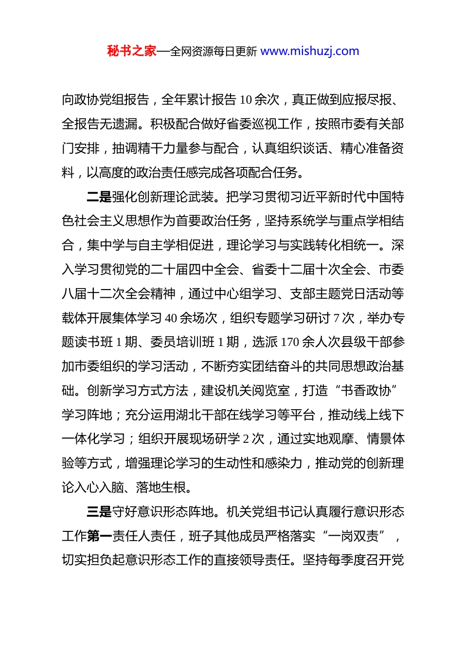 秘书之家—全网资源每日更新 www.mishuzj.com市政协办公室机关党总支书记 2025 年抓党建工作述职报告 根据市直机关工委关于开展 2025 年度市直机关基层党组织书记抓党建工作述职评议的通知要求,现将 2025 年度抓机关党建工作报告如下:一、主要做法与工作成效(一)强引领、铸忠诚,全面加强党的领导一是坚决做到“两个维护”。牢固树立政治机关意识,深刻认识政协机关首先是政治机关的本质属性,将“两个维护”作为最高政治原则和根本政治规矩贯穿机关党建工作始终。严格落实“第一议题”制度,坚持把学习贯彻习近平总书记重要讲话和指示批示精神作为党组会议、总支会议、支部会议的“第一议题”,做到及时跟进学、深入思考学、联系实际学。今年以来,累计召开各类学习会议 20 余场次,确保政协机关工作始终沿着正确政治方向前进。开展学习贯彻习近平总书记重要指示批示精神专项自查工作,针对涉及政协工作的 2 条重要批示,建立台账清单管理机制,实行销号管理,确保件件有着落、事事有回音。严格执行请示报告制度,坚持将党建重要工作、意识形态重大情况、人事调整事项、重大活动筹备等及时秘书之家—全网资源每日更新 www.mishuzj.com向政协党组报告,全年累计报告 10 余次,真正做到应报尽报、全报告无遗漏。积极配合做好省委巡视工作,按照市委有关部门安排,抽调精干力量参与配合,认真组织谈话、精心准备资料,以高度的政治责任感完成各项配合任务。二是强化创新理论武装。把学习贯彻习近平新时代中国特色社会主义思想作为首要政治任务,坚持系统学与重点学相结合,集中学与自主学相促进,理论学习与实践转化相统一。深入学习贯彻党的二十届四中全会、省委十二届十次全会、市委八届十二次全会精神,通过中心组学习、支部主题党日活动等载体开展集体学习 40 余场次,组织专题学习研讨 7 次,举办专题读书班 1 期、委员培训班 1 期,选派 170 余人次县级干部参加市委组织的学习活动,不断夯实团结奋斗的共同思想政治基础。创新学习方式方法,建设机关阅览室,打造“书香政协”学习阵地;充分运用湖北干部在线学习等平台,推动线上线下一体化学习;组织开展现场研学 2 次,通过实地观摩、情景体验等方式,增强理论学习的生动性和感染力,推动党的创新理论入心入脑、落地生根。三是守好意识形态阵地。机关党组书记认真履行意识形态工作第一责任人责任,班子其他成员严格落实“一岗双责”,切实担负起意识形态工作的直接领导责任。坚持每季度召开党秘书之家—全网资源每日更新 www.mishuzj.com组会议专题研究意识形态工作,定期分析研判意识形态领域风险点,建立健全风险排查、监测、预警、处置机制。重点抓好政协全会、重大活动、重要节日等关键节点的新闻宣传、舆情监测和舆论引导工作,制定完善应急预案,确保不出现重大舆情事件。严格落实“三审三校”机制,加强对政协网站、公众号等媒体的内容管理,强化信息发布前置把关和全过程监管。今年以来,通过政协各类宣传平台发布信息 1000 余条,积极弘扬主旋律、传播正能量,有效巩固壮大主流思想舆论阵地。全年未发生意识形态领域责任事件,保持了平稳可控、向上向好的态势。(二)抓党建、强根基,筑牢坚强战斗堡垒一是严肃组织生活。坚持从自身做起,带头以普通党员身份参加双重组织生活,带头开展批评与自我批评,带头为党员干部讲党课 2 场次,带头与党员干部开展谈心谈话 50 余人次,为全体党员干部树立了标杆、作出了表率。严格按照组织生活制度要求,今年以来组织召开组织生活会 2 场次、开展支部主题党日活动 20 场次,其中组织赴市革命烈士纪念园开展红色教育 1 场次,联合结对帮扶村开展支部主题党日活动 2 场次,增强了组织生活的吸引力和感染力。用心用情做好老党员服务保障工作,走访慰问 20 余名退休党员干部,为 3 名老党员颁发光秘书之家—全网资源每日更新 www.mishuzj.com荣在党 50 年纪念章,传递组织的关怀和温暖。坚持把“三会一课”等基本组织制度作为全面从严治党向基层延伸的重要抓手,推动党内组织生活常态化、规范化、制度化,把全面从严治党要...