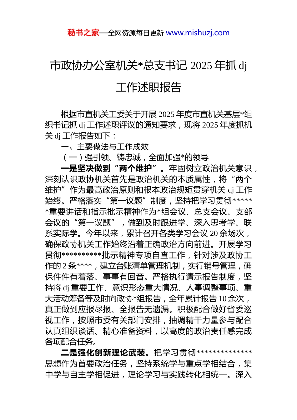 秘书之家—全网资源每日更新 www.mishuzj.com市政协办公室机关*总支书记 2025 年抓 dj工作述职报告根据市直机关工委关于开展 2025 年度市直机关基层*组织书记抓 dj 工作述职评议的通知要求,现将 2025 年度抓机关 dj 工作报告如下:一、主要做法与工作成效(一)强引领、铸忠诚,全面加强*的领导一是坚决做到“两个维护”。牢固树立政治机关意识,深刻认识政协机关首先是政治机关的本质属性,将“两个维护”作为最高政治原则和根本政治规矩贯穿机关 dj 工作始终。严格落实“第一议题”制度,坚持把学习贯彻******重要讲话和指示批示精神作为*组会议、总支会议、支部会议的“第一议题”,做到及时跟进学、深入思考学、联系实际学。今年以来,累计召开各类学习会议 20 余场次,确保政协机关工作始终沿着正确政治方向前进。开展学习贯彻**********批示精神专项自查工作,针对涉及政协工作的 2 条****,建立台账清单管理机制,实行销号管理,确保件件有着落、事事有回音。严格执行请示报告制度,坚持将 dj 重要工作、意识形态重大情况、人事调整事项、重大活动筹备等及时向政协*组报告,全年累计报告 10 余次,真正做到应报尽报、全报告无遗漏。积极配合做好省委巡视工作,按照市委有关部门安排,抽调精干力量参与配合认真组织谈话、精心准备资料,以高度的政治责任感完成各项配合任务。二是强化创新理论武装。把学习贯彻**************思想作为首要政治任务,坚持系统学与重点学相结合,集中学与自主学相促进,理论学习与实践转化相统一。深入秘书之家—全网资源每日更新 www.mishuzj.com学习贯彻*的二十届四中全会、省委十二届十次全会、市委八届十二次全会精神,通过中心组学习、支部主题*日活动等载体开展集体学习 40 余场次,组织专题学习研讨 7 次,举办专题读书班 1 期、委员培训班 1 期,选派 170 余人次县级干部参加市委组织的学习活动,不断夯实团结奋斗的共同思想政治基础。创新学习方式方法,建设机关阅览室,打造“书香政协”学习阵地;充分运用湖北干部在线学习等平台,推动线上线下一体化学习;组织开展现场研学 2 次,通过实地观摩、情景体验等方式,增强理论学习的生动性和感染力,推动*的创新理论入心入脑、落地生根。三是守好意识形态阵地。机关*组书记认真履行意识形态工作第一责任人责任,班子其他成员严格落实“一岗双责”,切实担负起意识形态工作的直接领导责任。坚持每季度召开*组会议专题研究意识形态工作,定期分析研判意识形态领域风险点,建立健全风险排查、监测、预警、处置机制。重点抓好政协全会、重大活动、重要节日等关键节点的新闻宣传、舆情监测和舆论引导工作,制定完善应急预案,确保不出现重大舆情事件。严格落实“三审三校”机制,加强对政协网站、公众号等媒体的内容管理,强化信息发布前置把关和全过程监管。今年以来,通过政协各类宣传平台发布信息 1000 余条,积极弘扬主旋律、传播正能量,有效巩固壮大主流思想舆论阵地。全年未发生意识形态领域责任事件,保持了平稳可控、向上向好的态势。(二)抓 dj、强根基,筑牢坚强战斗堡垒一是严肃组织生活。坚持从自身做起,带头以普通*员身份参加双重组织生活,带头开展批评与自我批评,带头为*员干部讲*课 2 场次,带头与*员干部开展谈心谈话 50 余人次,为全体*员干部树立了标杆、作出了表率。严格按照组织生活制度要求,今年以来组织召开组织生活会 2 场次、开展支部主题*日活动 20 场次,其中组织赴市革命烈士纪念秘书之家—全网资源每日更新 www.mishuzj.com园开展红色教育 1 场次,联合结对帮扶村开展支部主题*日活动 2 场次,增强了组织生活的吸引力和感染力。用心用情做好老*员服务保障工作,走访慰问 20 余名退休*员干部,为 3 名老*员颁发光荣在*50 年纪念章,传递组织的关怀和温暖。坚持把“三会一课”等基本组织制度作为全面从严治*向基层延伸的重要抓手,推动*内组织生活常态化、规范化、制度化,把全面从严治*要求压实到每个支部、落实到每名*员。二是加强支部建设。深入推进“*旗领航·赋能协商”dj品牌建设,着力打造...