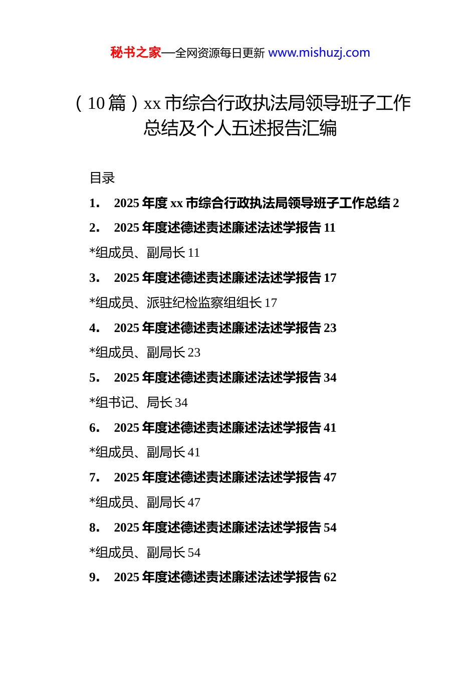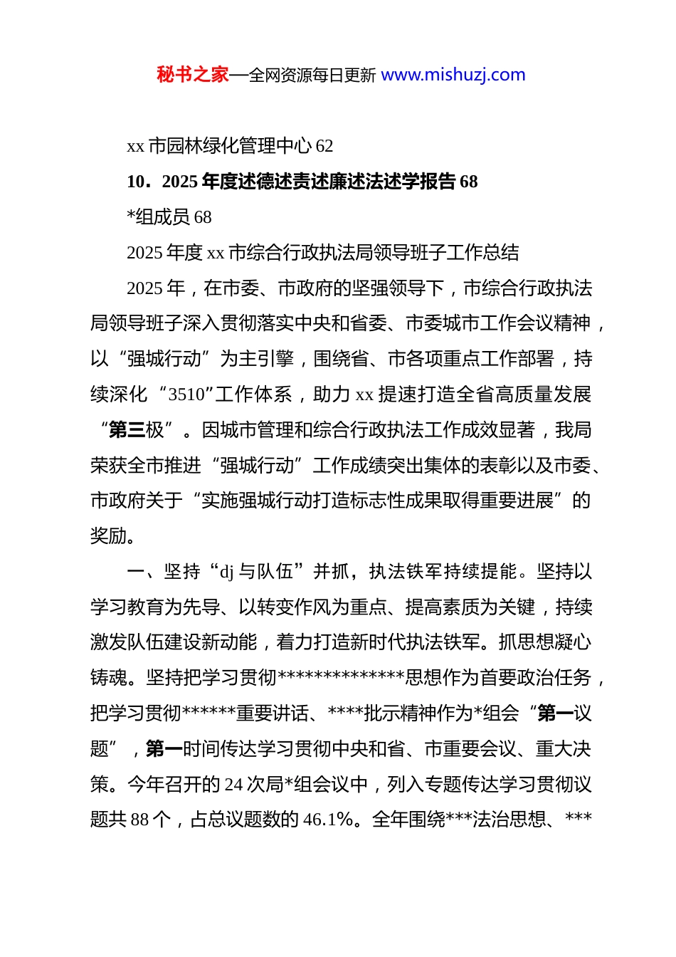 秘书之家—全网资源每日更新 www.mishuzj.com(10 篇)xx 市综合行政执法局领导班子工作总结及个人五述报告汇编目录1.2025 年度 xx 市综合行政执法局领导班子工作总结 22.2025 年度述德述责述廉述法述学报告 11*组成员、副局长 113.2025 年度述德述责述廉述法述学报告 17*组成员、派驻纪检监察组组长 174.2025 年度述德述责述廉述法述学报告 23*组成员、副局长 235.2025 年度述德述责述廉述法述学报告 34*组书记、局长 346.2025 年度述德述责述廉述法述学报告 41*组成员、副局长 417.2025 年度述德述责述廉述法述学报告 47*组成员、副局长 478.2025 年度述德述责述廉述法述学报告 54*组成员、副局长 549.2025 年度述德述责述廉述法述学报告 62秘书之家—全网资源每日更新 www.mishuzj.comxx 市园林绿化管理中心 6210. 2025 年度述德述责述廉述法述学报告 68*组成员 682025 年度 xx 市综合行政执法局领导班子工作总结2025 年,在市委、市政府的坚强领导下,市综合行政执法局领导班子深入贯彻落实中央和省委、市委城市工作会议精神,以“强城行动”为主引擎,围绕省、市各项重点工作部署,持续深化“3510”工作体系,助力 xx 提速打造全省高质量发展“第三极”。因城市管理和综合行政执法工作成效显著,我局荣获全市推进“强城行动”工作成绩突出集体的表彰以及市委、市政府关于“实施强城行动打造标志性成果取得重要进展”的奖励。一、坚持“dj 与队伍”并抓,执法铁军持续提能。坚持以学习教育为先导、以转变作风为重点、提高素质为关键,持续激发队伍建设新动能,着力打造新时代执法铁军。抓思想凝心铸魂。坚持把学习贯彻**************思想作为首要政治任务,把学习贯彻******重要讲话、****批示精神作为*组会“第一议题”,第一时间传达学习贯彻中央和省、市重要会议、重大决策。今年召开的 24 次局*组会议中,列入专题传达学习贯彻议题共 88 个,占总议题数的 46.1%。全年围绕***法治思想、***秘书之家—全网资源每日更新 www.mishuzj.com文化思想、《*政机关厉行节约反对浪费条例》等开展理论学习中心组专题学习 13 次。优作风筑牢堡垒。坚决落实市委“拧紧各级*委清廉建设责任链条”的要求,在年初全系统会议上专题部署全面从严治*工作,并在局*组会议上专题研究全面从严治*工作 7 次。严格落实“一岗双责”,签订《全面从严治*责任书》和《dj 工作责任书》,明确局属单位全面从严治*和 dj 工作的主体责任以及主要负责人的第一责任。扎实开展深入贯彻中央八项规定精神学习教育,一体推进“学查改促”。持续擦亮“执法蓝”“环卫橙”“市政红”“公用黄”“园林绿”等dj 品牌,市市容环境卫生管理中心第一*支部获评市直机关“五星双强”*支部。重培养赋能添彩。健全干部人才培养选拔机制,开展局系统年轻干部比选择优,综合选拔 13 人纳入年轻干部人才储备库。通过“线上+线下”“理论+实践”等培训方式,开展裁量权基准制度培训等各类专题培训班、轮训班,全面提升基层执法能力水平。提炼形成“统分结合”“一心五统”等基层执法队伍融合新模式,编制工作指引并在全市推广,进一步推动执法队伍正规化、专业化、职业化建设。二、坚持“建园与办会”并举,园博筹办持续提速。按照住建部“转型、创新、节俭”办会要求和“百姓园博、国际园博、先锋园博、文化园博、全城园博”五大转型方向,坚持高秘书之家—全网资源每日更新 www.mishuzj.com位统筹、高标建设、高效招展、高质保障,各项筹办工作取得阶段性成效。系统强化顶层设计。持续优化筹办方案、总体规划、展园设计和运营机制,构建“城中建园、城园一体”的空间格局,坚持“建园为民、全民共享”的理念,探索“园产融合、招商前置”的运营模式。10 月 15 日,园博会组委会二次会议审议通过了开闭幕式、宣传标识与吉祥物、展陈策划等 7 项方案。提速攻坚工程建设。园博园 1-3 标及跨线桥、周边 7 个配套道路、34 个城市展园已基本完成工程建设,仙湖调蓄已完成水工工程、土方外运等工作并准备竣工验收,园博园红线内特殊场所整合也已基本完成。精...