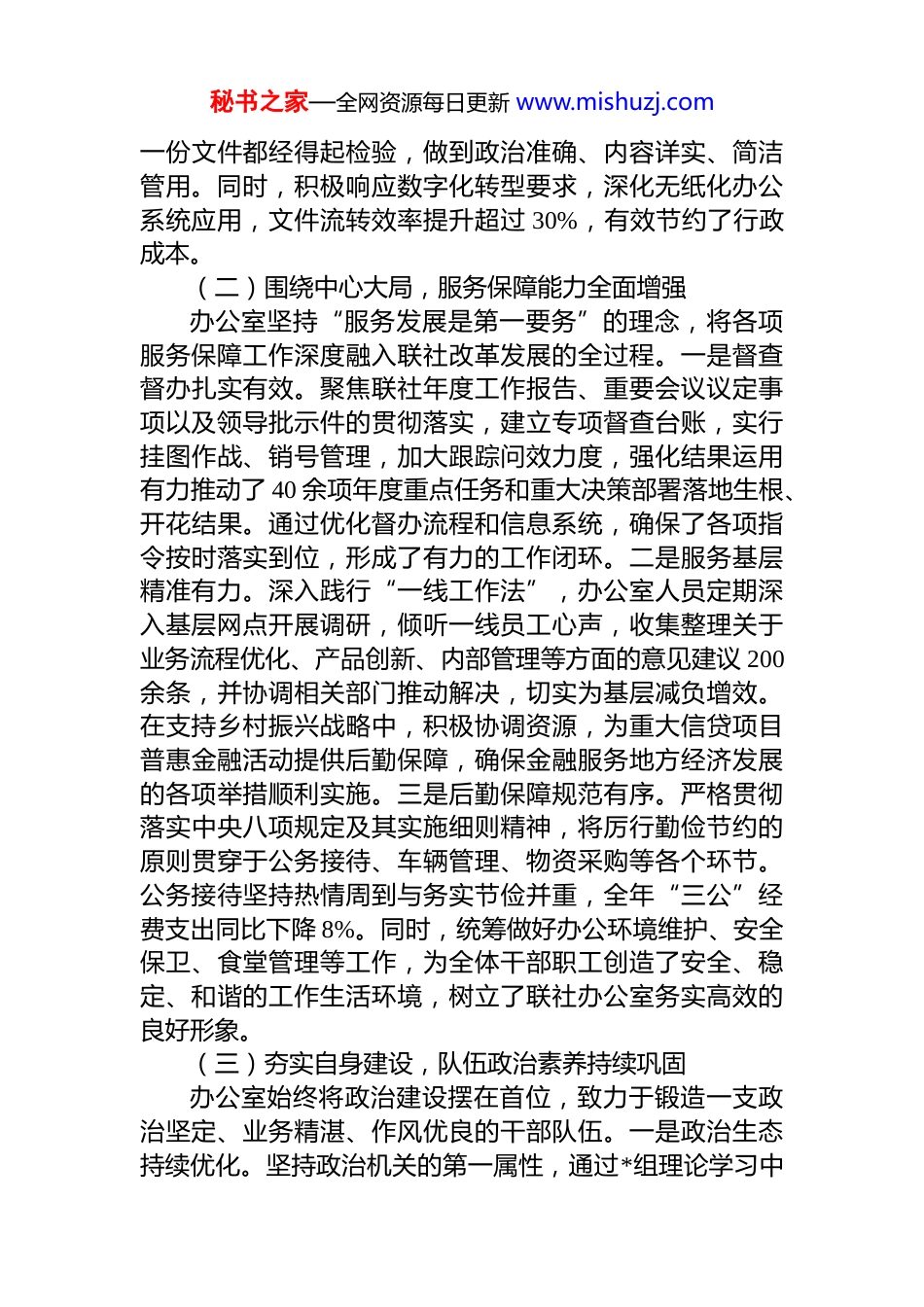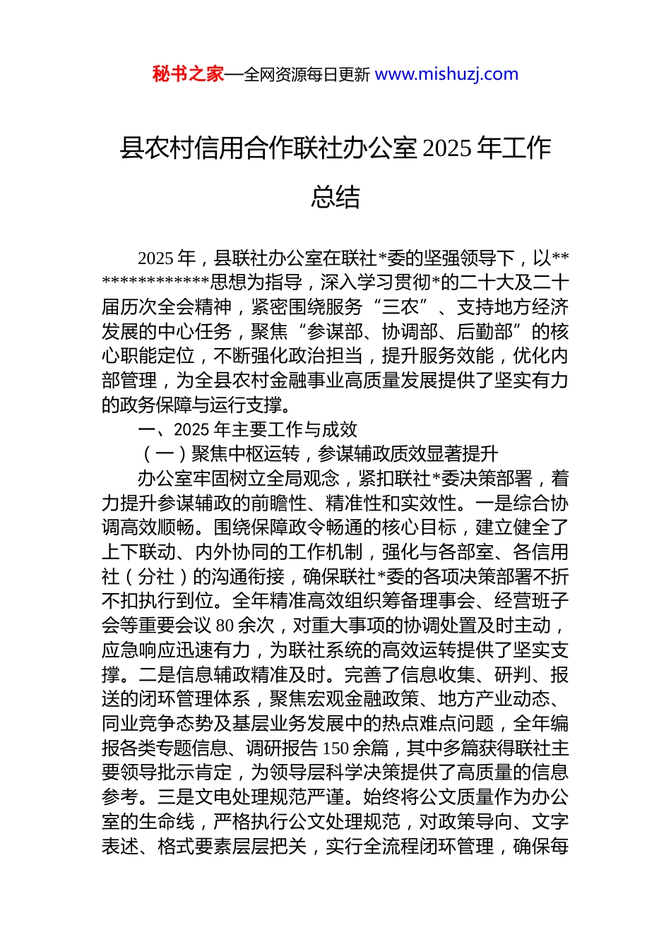 秘书之家—全网资源每日更新 www.mishuzj.com县农村信用合作联社办公室 2025 年工作总结2025 年,县联社办公室在联社*委的坚强领导下,以**************思想为指导,深入学习贯彻*的二十大及二十届历次全会精神,紧密围绕服务“三农”、支持地方经济发展的中心任务,聚焦“参谋部、协调部、后勤部”的核心职能定位,不断强化政治担当,提升服务效能,优化内部管理,为全县农村金融事业高质量发展提供了坚实有力的政务保障与运行支撑。一、2025 年主要工作与成效(一)聚焦中枢运转,参谋辅政质效显著提升办公室牢固树立全局观念,紧扣联社*委决策部署,着力提升参谋辅政的前瞻性、精准性和实效性。一是综合协调高效顺畅。围绕保障政令畅通的核心目标,建立健全了上下联动、内外协同的工作机制,强化与各部室、各信用社(分社)的沟通衔接,确保联社*委的各项决策部署不折不扣执行到位。全年精准高效组织筹备理事会、经营班子会等重要会议 80 余次,对重大事项的协调处置及时主动,应急响应迅速有力,为联社系统的高效运转提供了坚实支撑。二是信息辅政精准及时。完善了信息收集、研判、报送的闭环管理体系,聚焦宏观金融政策、地方产业动态、同业竞争态势及基层业务发展中的热点难点问题,全年编报各类专题信息、调研报告 150 余篇,其中多篇获得联社主要领导批示肯定,为领导层科学决策提供了高质量的信息参考。三是文电处理规范严谨。始终将公文质量作为办公室的生命线,严格执行公文处理规范,对政策导向、文字表述、格式要素层层把关,实行全流程闭环管理,确保每秘书之家—全网资源每日更新 www.mishuzj.com一份文件都经得起检验,做到政治准确、内容详实、简洁管用。同时,积极响应数字化转型要求,深化无纸化办公系统应用,文件流转效率提升超过 30%,有效节约了行政成本。(二)围绕中心大局,服务保障能力全面增强办公室坚持“服务发展是第一要务”的理念,将各项服务保障工作深度融入联社改革发展的全过程。一是督查督办扎实有效。聚焦联社年度工作报告、重要会议议定事项以及领导批示件的贯彻落实,建立专项督查台账,实行挂图作战、销号管理,加大跟踪问效力度,强化结果运用有力推动了 40 余项年度重点任务和重大决策部署落地生根、开花结果。通过优化督办流程和信息系统,确保了各项指令按时落实到位,形成了有力的工作闭环。二是服务基层精准有力。深入践行“一线工作法”,办公室人员定期深入基层网点开展调研,倾听一线员工心声,收集整理关于业务流程优化、产品创新、内部管理等方面的意见建议 200余条,并协调相关部门推动解决,切实为基层减负增效。在支持乡村振兴战略中,积极协调资源,为重大信贷项目普惠金融活动提供后勤保障,确保金融服务地方经济发展的各项举措顺利实施。三是后勤保障规范有序。严格贯彻落实中央八项规定及其实施细则精神,将厉行勤俭节约的原则贯穿于公务接待、车辆管理、物资采购等各个环节。公务接待坚持热情周到与务实节俭并重,全年“三公”经费支出同比下降 8%。同时,统筹做好办公环境维护、安全保卫、食堂管理等工作,为全体干部职工创造了安全、稳定、和谐的工作生活环境,树立了联社办公室务实高效的良好形象。(三)夯实自身建设,队伍政治素养持续巩固办公室始终将政治建设摆在首位,致力于锻造一支政治坚定、业务精湛、作风优良的干部队伍。一是政治生态持续优化。坚持政治机关的第一属性,通过*组理论学习中秘书之家—全网资源每日更新 www.mishuzj.com心组学习、专题*课、“三会一课”等形式,持续深化对**************思想和*的二十大精神的学习领悟,引导全体人员不断增强政治判断力、政治领悟力、政治执行力,以实际行动忠诚拥护“两个确立”、坚决做到“两个维护”年初专题研究部署意识形态工作,牢牢掌握了意识形态工作领导权。二是干部队伍坚强有力。坚持正确的选人用人导向,严格按照规定程序开展干部选拔任用,注重在急难险重任务中考察和识别干部,将政治标准和工作实绩作为选人用人的首要依据。通过组织参加省联社调训、岗位技能竞赛、青年员工论坛等多种形式,加强对干部特别是年轻干部的思...