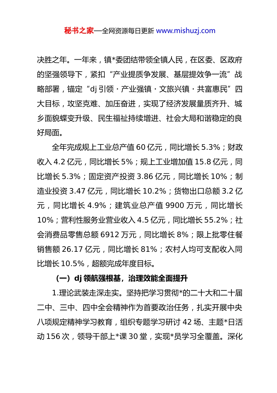 秘书之家—全网资源每日更新 www.mishuzj.com双提双争勇毅笃行奋力谱写“xx・文旅心・共富地”高质量发展新篇章——在中国共产*xx 镇第十六届代表大会第五次会议上各位代表、同志们:现在,我代表中共 xx 区 xx 镇第十六届委员会向大会作工作报告,请各位代表予以审议。本次大会的主题是:坚持以**************思想为指导,全面贯彻*的二十大和二十届二中、三中、四中全会精神及中央经济工作会议精神,深入贯彻******考察浙江重要讲话****批示精神,认真落实省委十五届七次全会、市委十三届八次全会、区委二届七次全会决策部署,扎实开展中央八项规定精神学习教育,总结 2025 年工作,部署 2026 年任务,动员全镇上下聚焦高质量发展首要任务,持续推动“八八战略”走深走实,向着更高水平更高质量的“xx・文旅心・共富地”幸福共富小镇阔步前行。一、实干笃行,硕果盈枝,“xx文旅心共富地”建设・・实现质效双升2025 年是全面贯彻*的二十届三中全会精神、深化“八八战略”新实践的关键一年,也是 xx 镇“双百目标”攻坚突破的秘书之家—全网资源每日更新 www.mishuzj.com决胜之年。一年来,镇*委团结带领全镇人民,在区委、区政府的坚强领导下,紧扣“产业提质争发展、基层提效争一流”战略部署,锚定“dj 引领・产业强镇・文旅兴镇・共富惠民”四大目标,攻坚克难、加压奋进,实现了经济发展量质齐升、城乡面貌蝶变升级、民生福祉持续增进、社会大局和谐稳定的良好局面。全年完成规上工业总产值 60 亿元,同比增长 5.3%;财政收入 4.2 亿元,同比增长 5%;规上工业增加值 15.8 亿元,同比增长 5.3%;固定资产投资 3.86 亿元,同比增长 10%;制造业投资 3.47 亿元,同比增长 10.2%;货物出口总额 3.2 亿元,同比增长 4.9%;建筑业总产值 9900 万元,同比增长10%;营利性服务业营业收入 4.5 亿元,同比增长 55.2%;社会消费品零售总额 6912 万元,同比增长 8%;限上批零住餐销售额 26.17 亿元,同比增长 81%;农村人均可支配收入同比增长 10.5%,超额完成年度目标。(一)dj 领航强根基,治理效能全面提升1.理论武装走深走实。坚持把学习贯彻*的二十大和二十届二中、三中、四中全会精神作为首要政治任务,扎实开展中央八项规定精神学习教育,组织专题学习研讨 42 场、主题*日活动 156 次,领导干部上*课 30 堂,实现*员学习全覆盖。深化秘书之家—全网资源每日更新 www.mishuzj.com“第一议题”制度和“三会一课”规范化建设,创新“xx・青年说”宣讲品牌 2.0 版,开展“宣讲+实践”活动 48 场,获评杭州市基层理论宣讲先进集体。2.基层建设提质增效。深入实施“争星晋位、全域建强”行动,推进抓乡促村“1+3”工作体系迭代升级,xx 村成功创建浙江省先进基层*组织,xx 村入选全国村级议事协商创新实验点。完成村级组织换届“后半篇文章”,实施“青蓝帮带”xx 先锋成长行动 2.0 版,35 名年轻干部全部结对成长,中层干部平均年龄再降 2 岁。开展村级巡察“回头看”,发现问题整改率 100%,查处各类违纪违法案件 13 起,dj 政务处分 9 人,效能问责 3 人,风清气正的政治生态持续巩固。3.统战人才工作创新突破。扩容升级新联会 xx 分会、青雁联盟等平台,建立生物医药、农文旅两大人才智库,引进高层次人才 28 名,培育“xx 特支人才”3 名。打造“xx 人才之家”服务综合体,落实人才“一对一”帮扶机制,解决住房、子女入学等诉求 46 件,人才归属感和幸福感显著提升。(二)产业强镇破瓶颈,发展动能持续增强1.生物医药产业集群壮大。依托海正药业、xx 制药、博之锐生物等龙头企业,延伸生物医药上下游产业链,新增规上医药企业 3 家。博之锐生物“安瑞泽”“安健宁”“安佰诺”三秘书之家—全网资源每日更新 www.mishuzj.com款产品实现全市三甲医院全覆盖,年销售额突破 5 亿元,企业ceo 王海彬博士获评“2025 年浙江省优秀企业家”。xx 制药“特治星”二期项目竣工投产,年新增产值 8 亿元;海正生物三期、力竺智能装备等项目满负荷生产,药谷小镇产值突破 55亿元。2.招商引资...