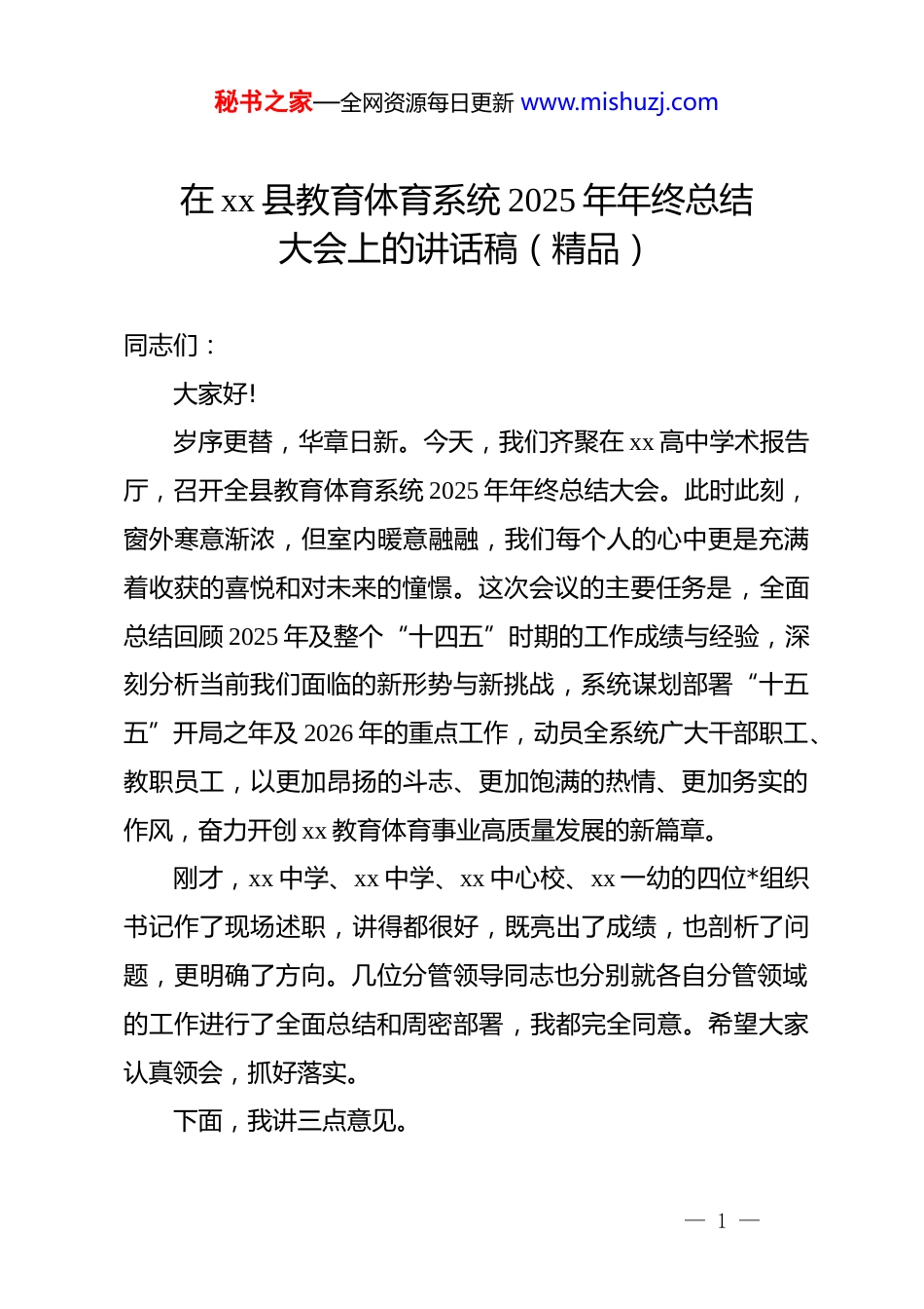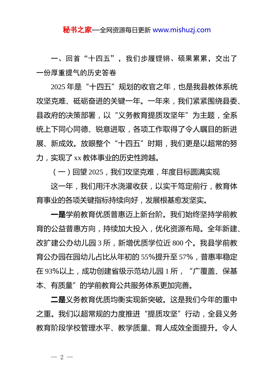 秘书之家—全网资源每日更新 www.mishuzj.com在 xx 县教育体育系统 2025 年年终总结大会上的讲话稿(精品)同志们:大家好!岁序更替,华章日新。今天,我们齐聚在 xx 高中学术报告厅,召开全县教育体育系统 2025 年年终总结大会。此时此刻,窗外寒意渐浓,但室内暖意融融,我们每个人的心中更是充满着收获的喜悦和对未来的憧憬。这次会议的主要任务是,全面总结回顾 2025 年及整个“十四五”时期的工作成绩与经验,深刻分析当前我们面临的新形势与新挑战,系统谋划部署“十五五”开局之年及 2026 年的重点工作,动员全系统广大干部职工、教职员工,以更加昂扬的斗志、更加饱满的热情、更加务实的作风,奋力开创 xx 教育体育事业高质量发展的新篇章。刚才,xx 中学、xx 中学、xx 中心校、xx 一幼的四位*组织书记作了现场述职,讲得都很好,既亮出了成绩,也剖析了问题,更明确了方向。几位分管领导同志也分别就各自分管领域的工作进行了全面总结和周密部署,我都完全同意。希望大家认真领会,抓好落实。下面,我讲三点意见。— 1 —秘书之家—全网资源每日更新 www.mishuzj.com一、回首“十四五”,我们步履铿锵、硕果累累,交出了一份厚重提气的历史答卷2025 年是“十四五”规划的收官之年,也是我县教体系统攻坚克难、砥砺奋进的关键一年。一年来,我们紧紧围绕县委、县政府的决策部署,以“义务教育提质攻坚年”为主题,全系统上下同心同德、锐意进取,各项工作取得了令人瞩目的新进展、新成效。放眼整个“十四五”时期,我们更是以超常的努力,实现了 xx 教体事业的历史性跨越。(一)回望 2025,我们攻坚克难,年度目标圆满实现这一年,我们用汗水浇灌收获,以实干笃定前行,教育体育事业的各项关键指标持续向好,发展根基愈发坚实。一是学前教育优质普惠迈上新台阶。我们始终坚持学前教育的公益普惠方向,持续加大投入,优化资源布局。全年新建、改扩建公办幼儿园 3 所,新增优质学位近 800 个。我县学前教育公办园在园幼儿占比从年初的 55%提升至 57%,普惠率稳定在 93%以上,成功创建省级示范幼儿园 1 所,“广覆盖、保基本、有质量”的学前教育公共服务体系更加完善。二是义务教育优质均衡实现新突破。这是我们今年的重中之重。我们以超常规的力度推进“提质攻坚”行动,全县义务教育阶段学校管理水平、教学质量、育人成效全面提升。令人— 2 —秘书之家—全网资源每日更新 www.mishuzj.com振奋的是,在刚刚公布的全市教育质量综合评价中,我县历史性地荣获区县组一等奖,这是对我县多年来深耕义务教育的最高褒奖,是全体教体人共同奋斗的结晶,标志着 xx 义务教育发展水平迈入了全市第一方阵。三是高中教育振兴创牌取得新进展。我们坚持“稳中有进、特色发展”的思路,普通高中教育质量持续攀升。2025 年高考,我县本科上线率较去年提升了 2.5 个百分点,多名优秀学子被国内顶尖学府录取,xx 高中与 xx 中学的特色化、品牌化建设路径愈发清晰,人民群众对家门口的高中教育满意度显著增强。四是职业教育服务发展彰显新作为。我们紧密对接县域经济社会发展需求,深化产教融合、校企合作。县职业高级中学与本地多家重点企业共建实训基地,开设订单班,毕业生本地就业率超过 60%,为我县产业发展输送了一大批高素质技术技能人才,职业教育的适应性和吸引力不断增强。五是各项事业齐头并进呈现新气象。体育事业蓬勃发展,我们成功举办了县第十届中小学生运动会,群众体育活动丰富多彩。教研科研成果丰硕,全年获得市级以上教学成果奖 8 项。办学条件持续改善,完成了 12 所学校的运动场改造和信息化提升工程。改革创新蹄疾步稳,集团化办学模式在更多学区开花结果。队伍建设坚强有力,全年引进高层次和紧缺学科教师 50— 3 —秘书之家—全网资源每日更新 www.mishuzj.com余名。校园安全防线牢固,“平安校园”建设成果得到持续巩固。(二)纵览“十四五”,我们砥砺奋进,事业发展实现历史性跨越“十四五”这五年,是 xx 教育体育发展史上极不平凡、极具里程碑意义的五年。我们共同见证和推动了 xx 教体事业从夯实...
