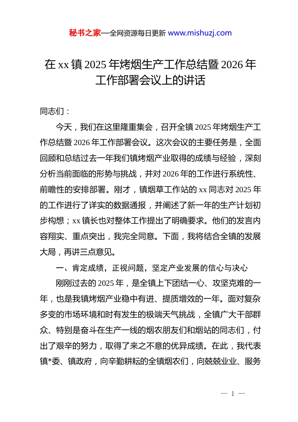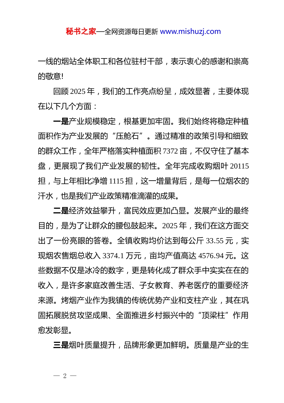 秘书之家—全网资源每日更新 www.mishuzj.com在 xx 镇 2025 年烤烟生产工作总结暨 2026 年工作部署会议上的讲话同志们:今天,我们在这里隆重集会,召开全镇 2025 年烤烟生产工作总结暨 2026 年工作部署会议。这次会议的主要任务是,全面回顾和总结过去一年我们镇烤烟产业取得的成绩与经验,深刻分析当前面临的形势与挑战,并对 2026 年的工作进行系统性、前瞻性的安排部署。刚才,镇烟草工作站的 xx 同志对 2025 年的工作进行了详实的数据通报,并阐述了新一年的生产计划初步构想;xx 镇长也对整体工作提出了明确要求。他们的发言内容翔实、重点突出,我完全同意。下面,我将结合全镇的发展大局,再讲三点意见。一、肯定成绩,正视问题,坚定产业发展的信心与决心刚刚过去的 2025 年,是全镇上下团结一心、攻坚克难的一年,也是我镇烤烟产业稳中有进、提质增效的一年。面对复杂多变的市场环境和时有发生的极端天气挑战,全镇广大干部群众、特别是奋斗在生产一线的烟农朋友们和烟站的同志们,付出了艰辛的努力,取得了来之不意的优异成绩。在此,我代表镇*委、镇政府,向辛勤耕耘的全镇烟农们,向兢兢业业、服务— 1 —秘书之家—全网资源每日更新 www.mishuzj.com一线的烟站全体职工和各位驻村干部,表示衷心的感谢和崇高的敬意!回顾 2025 年,我们的工作亮点纷呈,成效显著,主要体现在以下几个方面:一是产业规模稳定,根基更加牢固。我们始终将稳定种植面积作为产业发展的“压舱石”。通过精准的政策引导和细致的群众工作,全年严格落实种植面积 7372 亩,不仅守住了基本盘,更展现了我们产业发展的韧性。全年完成收购烟叶 20115担,与上年相比净增 1115 担,这一增量背后,是每一位烟农的汗水,也是我们产业政策精准滴灌的成果。二是经济效益攀升,富民效应更加凸显。发展产业的最终目的,是为了让群众的腰包鼓起来。2025 年,我们在这方面交出了一份亮眼的答卷。全镇收购均价达到每公斤 33.55 元,实现烟农售烟总收入 3374.1 万元,亩均产值高达 4576.94 元。这些数据不仅是冰冷的数字,更是转化成了群众手中实实在在的收入,是许多家庭改善生活、子女教育、养老医疗的重要经济来源。烤烟产业作为我镇的传统优势产业和支柱产业,其在巩固拓展脱贫攻坚成果、全面推进乡村振兴中的“顶梁柱”作用愈发彰显。三是烟叶质量提升,品牌形象更加鲜明。质量是产业的生— 2 —秘书之家—全网资源每日更新 www.mishuzj.com命线。我们欣喜地看到,2025 年全镇上等烟比例稳定保持在70.36%的较高水平。这标志着我镇的烤烟生产,已经从过去单纯追求产量的粗放式增长,稳步迈向了更加注重品质和内涵的高质量发展轨道。这得益于我们大力推广的标准化种植技术、专业化烘烤服务以及精细化田间管理,是我镇烟叶市场竞争力的核心体现。成绩固然值得肯定,但我们更要清醒地认识到,前进的道路上依然存在不容忽视的短板和挑战。我们必须以刀刃向内的勇气,正视这些问题:第一,发展布局仍需优化。从全镇范围看,部分村组的烟田还存在零星分散、不成规模的现象,这不仅增加了田间管理的难度和成本,也不利于现代农业机械和先进技术的推广应用。如何通过科学规划,引导土地资源向优势区域、种烟能手集中,是我们必须破解的课题。第二,质量均衡性有待提高。虽然上等烟比例整体较高,但村与村之间、户与户之间依然存在差距。部分烟农在田间管理、成熟采摘、精准烘烤等关键环节的技术掌握还不够到位,导致烟叶质量不稳定,影响了整体效益的最大化。第三,科技支撑能力尚显不足。尽管我们一直在倡导科技兴烟,但精准施肥、绿色防控、智能烘烤等新技术的普及率和— 3 —秘书之家—全网资源每日更新 www.mishuzj.com应用深度还有很大的提升空间。一些烟农依然沿用传统经验,对新技术的接受度不高,导致生产成本居高不下,资源利用效率有待提升。第四,抵御风险的能力依然脆弱。农业生产“靠天吃饭”的局面尚未根本改变,极端天气事件的威胁依然存在。同时,劳动力成本逐年攀升、农资价格波动等外部因素,也给烟农的稳定增收带来了不确定性。我们的农业基础设施...