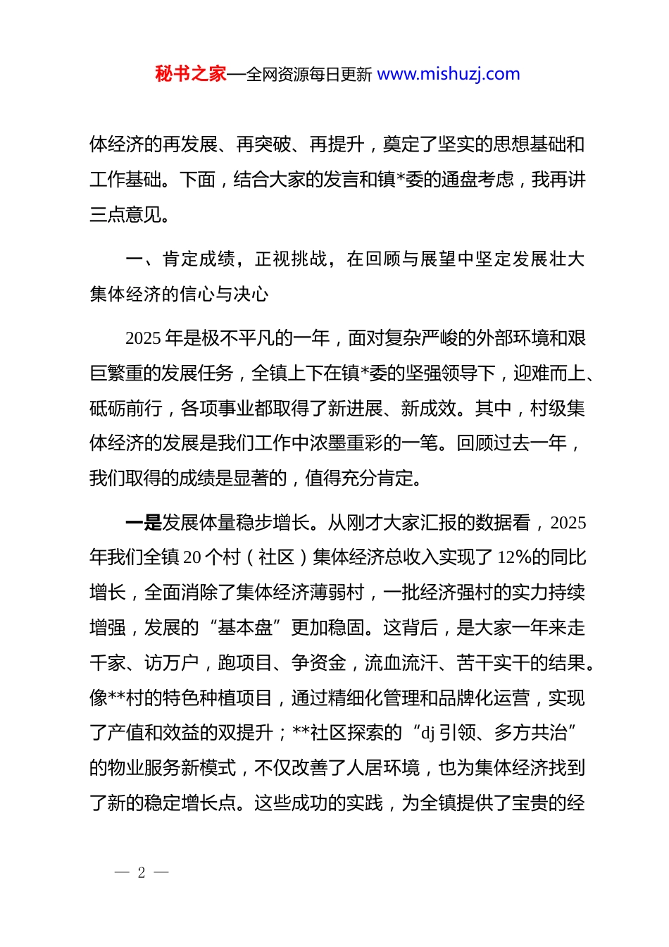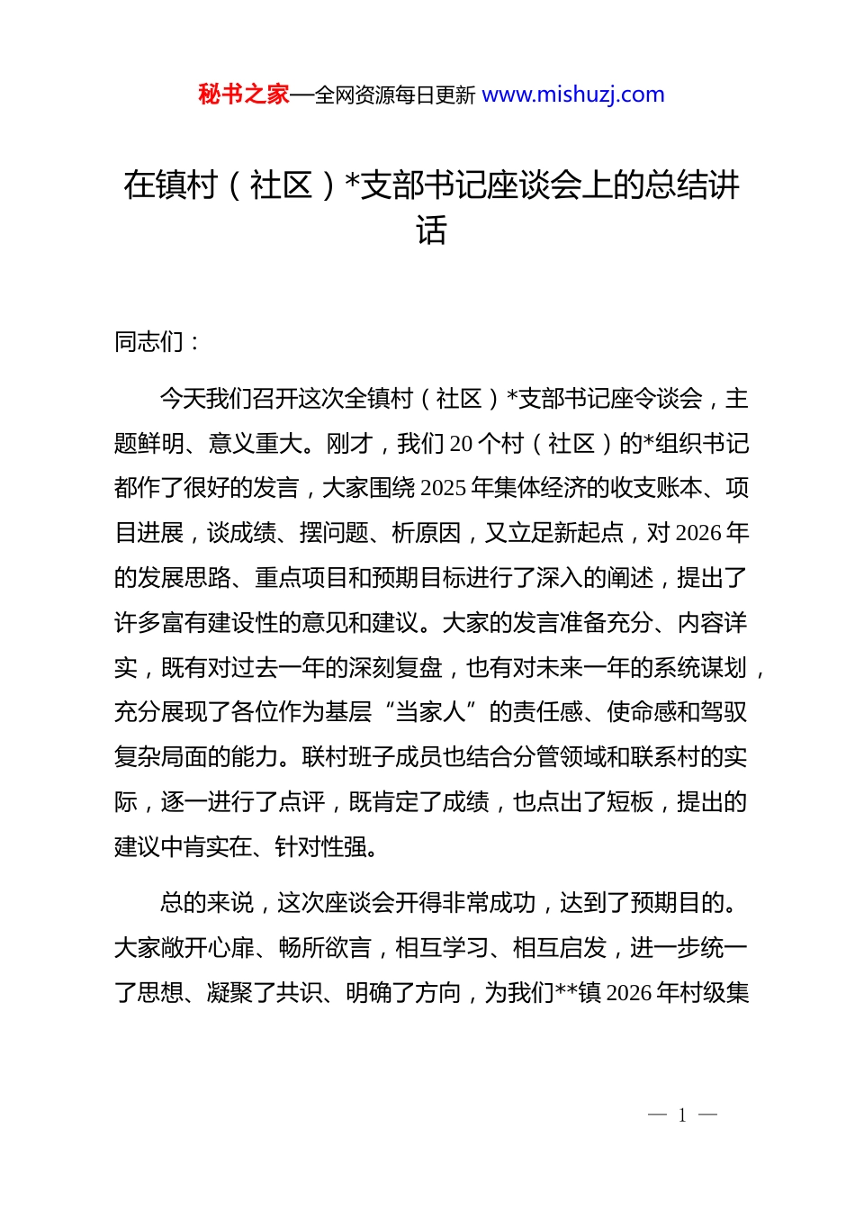 秘书之家—全网资源每日更新 www.mishuzj.com在镇村(社区)*支部书记座谈会上的总结讲话同志们:今天我们召开这次全镇村(社区)*支部书记座令谈会,主题鲜明、意义重大。刚才,我们 20 个村(社区)的*组织书记都作了很好的发言,大家围绕 2025 年集体经济的收支账本、项目进展,谈成绩、摆问题、析原因,又立足新起点,对 2026 年的发展思路、重点项目和预期目标进行了深入的阐述,提出了许多富有建设性的意见和建议。大家的发言准备充分、内容详实,既有对过去一年的深刻复盘,也有对未来一年的系统谋划,充分展现了各位作为基层“当家人”的责任感、使命感和驾驭复杂局面的能力。联村班子成员也结合分管领域和联系村的实际,逐一进行了点评,既肯定了成绩,也点出了短板,提出的建议中肯实在、针对性强。总的来说,这次座谈会开得非常成功,达到了预期目的。大家敞开心扉、畅所欲言,相互学习、相互启发,进一步统一了思想、凝聚了共识、明确了方向,为我们**镇 2026 年村级集— 1 —秘书之家—全网资源每日更新 www.mishuzj.com体经济的再发展、再突破、再提升,奠定了坚实的思想基础和工作基础。下面,结合大家的发言和镇*委的通盘考虑,我再讲三点意见。一、肯定成绩,正视挑战,在回顾与展望中坚定发展壮大集体经济的信心与决心2025 年是极不平凡的一年,面对复杂严峻的外部环境和艰巨繁重的发展任务,全镇上下在镇*委的坚强领导下,迎难而上、砥砺前行,各项事业都取得了新进展、新成效。其中,村级集体经济的发展是我们工作中浓墨重彩的一笔。回顾过去一年,我们取得的成绩是显著的,值得充分肯定。一是发展体量稳步增长。从刚才大家汇报的数据看,2025年我们全镇 20 个村(社区)集体经济总收入实现了 12%的同比增长,全面消除了集体经济薄弱村,一批经济强村的实力持续增强,发展的“基本盘”更加稳固。这背后,是大家一年来走千家、访万户,跑项目、争资金,流血流汗、苦干实干的结果。像**村的特色种植项目,通过精细化管理和品牌化运营,实现了产值和效益的双提升;**社区探索的“dj 引领、多方共治”的物业服务新模式,不仅改善了人居环境,也为集体经济找到了新的稳定增长点。这些成功的实践,为全镇提供了宝贵的经— 2 —秘书之家—全网资源每日更新 www.mishuzj.com验。二是发展模式日益多元。我们欣喜地看到,越来越多的村(社区)正在摆脱过去单一依靠土地发包、资产租赁的“收租型”经济模式。大家开动脑筋、积极探索,服务创收型、产业带动型、合作经营型等多种发展模式百花齐放。从简单的“输血”向可持续的“造血”转变,从依赖资源禀赋向挖掘内生动力转变,发展的路径更宽、后劲更足。这充分说明,我们的思路活了,眼界宽了,发展集体经济的能力和水平有了实质性的提升。三是带动效应初步显现。发展壮大村级集体经济,最终的落脚点是服务群众、造福于民。过去一年,各村(社区)在实现集体增收的同时,普遍加大了对民生事业的投入,基础设施不断完善,公共服务水平持续提高,群众的获得感、幸福感、安全感显著增强。更重要的是,通过集体经济组织这个平台,我们有效地将分散的农户组织起来,提供了更多的就业岗位,拓宽了群众的增收渠道,集体富裕与群众富裕同频共振的良好局面正在形成。在肯定成绩的同时,我们更要清醒地认识到前进道路上的问题和挑战。刚才大家的发言中也或多或少地提到了当前存在— 3 —秘书之家—全网资源每日更新 www.mishuzj.com的困难。综合来看,主要有以下几个方面:第一,发展不平衡的问题依然突出。部分村的集体经济基础仍然薄弱,增长点单一,抗风险能力不强;而一些经济强村也面临着传统优势减弱、新增动力不足的瓶颈。村与村之间的差距,是我们必须着力解决的课题。第二,项目谋划的质量有待提高。一些村的项目还停留在“小打小闹”的层面,缺乏深度调研和科学论证,市场前景不明朗,带动能力有限。敢于谋划大项目、善于运作好项目的能力,是大家普遍需要加强的短板。第三,人才支撑和管理机制尚不健全。懂经营、会管理、善营销的专业人才依然稀缺,部分村(社区)在资金使用、资产管理、收益分...