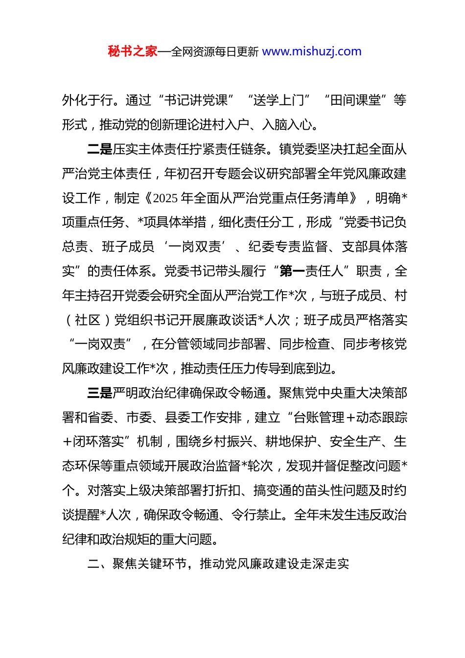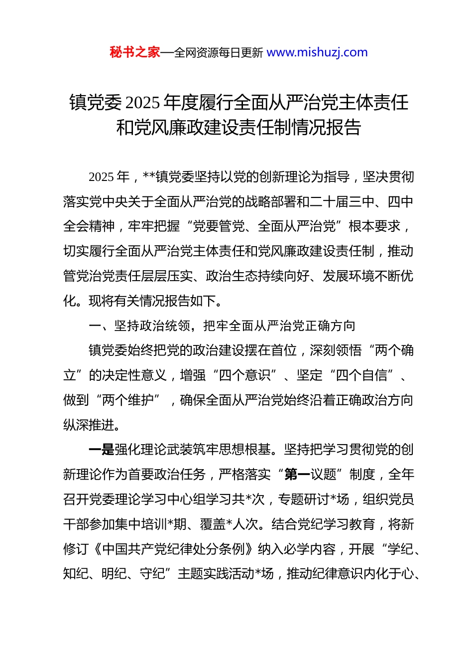 秘书之家—全网资源每日更新 www.mishuzj.com镇党委 2025 年度履行全面从严治党主体责任和党风廉政建设责任制情况报告 2025 年,**镇党委坚持以党的创新理论为指导,坚决贯彻落实党中央关于全面从严治党的战略部署和二十届三中、四中全会精神,牢牢把握“党要管党、全面从严治党”根本要求,切实履行全面从严治党主体责任和党风廉政建设责任制,推动管党治党责任层层压实、政治生态持续向好、发展环境不断优化。现将有关情况报告如下。一、坚持政治统领,把牢全面从严治党正确方向镇党委始终把党的政治建设摆在首位,深刻领悟“两个确立”的决定性意义,增强“四个意识”、坚定“四个自信”、做到“两个维护”,确保全面从严治党始终沿着正确政治方向纵深推进。一是强化理论武装筑牢思想根基。坚持把学习贯彻党的创新理论作为首要政治任务,严格落实“第一议题”制度,全年召开党委理论学习中心组学习共*次,专题研讨*场,组织党员干部参加集中培训*期、覆盖*人次。结合党纪学习教育,将新修订《中国共产党纪律处分条例》纳入必学内容,开展“学纪、知纪、明纪、守纪”主题实践活动*场,推动纪律意识内化于心、秘书之家—全网资源每日更新 www.mishuzj.com外化于行。通过“书记讲党课”“送学上门”“田间课堂”等形式,推动党的创新理论进村入户、入脑入心。二是压实主体责任拧紧责任链条。镇党委坚决扛起全面从严治党主体责任,年初召开专题会议研究部署全年党风廉政建设工作,制定《2025 年全面从严治党重点任务清单》,明确*项重点任务、*项具体举措,细化责任分工,形成“党委书记负总责、班子成员‘一岗双责’、纪委专责监督、支部具体落实”的责任体系。党委书记带头履行“第一责任人”职责,全年主持召开党委会研究全面从严治党工作*次,与班子成员、村(社区)党组织书记开展廉政谈话*人次;班子成员严格落实“一岗双责”,在分管领域同步部署、同步检查、同步考核党风廉政建设工作*次,推动责任压力传导到底到边。三是严明政治纪律确保政令畅通。聚焦党中央重大决策部署和省委、市委、县委工作安排,建立“台账管理+动态跟踪+闭环落实”机制,围绕乡村振兴、耕地保护、安全生产、生态环保等重点领域开展政治监督*轮次,发现并督促整改问题*个。对落实上级决策部署打折扣、搞变通的苗头性问题及时约谈提醒*人次,确保政令畅通、令行禁止。全年未发生违反政治纪律和政治规矩的重大问题。二、聚焦关键环节,推动党风廉政建设走深走实秘书之家—全网资源每日更新 www.mishuzj.com坚持问题导向、目标导向、结果导向相统一,紧盯权力运行关键点、群众关切聚焦点、作风建设薄弱点,一体推进不敢腐、不能腐、不想腐。(一)强化权力监督制约,扎紧制度笼子针对基层“微权力”运行风险,健全完善制度机制。修订《村级“小微权力”清单》,明确*类*项权力事项及运行流程,在全镇*个村(社区)全面推行“阳光三务”线上公开平台,实现党务、村务、财务“一键可查、全程留痕”,群众访问量达*万人次,信访量同比下降*%。在工程项目管理方面,严格执行“四议两公开”和招投标规定,对*万元以上项目实行第三方审计全覆盖,全年核减不合理支出*万元。在资金使用方面,开展惠民惠农财政补贴资金“一卡通”专项治理,清退违规发放资金*万元,追责*人。(二)深化正风肃纪反腐,涵养清风正气驰而不息纠治“四风”顽疾。紧盯重要节点开展明察暗访*次,查处违规收送礼品礼金、公款吃喝等问题*起,处理*人。聚焦形式主义、官僚主义新表现,开展“指尖上的形式主义”专项整治,清理冗余工作群*个,合并重复报表*项,为村级组织减负*%。设立“办不成事”反映窗口*个,推动解决群众急难愁盼问题*件,群众满意度提升至*%。秘书之家—全网资源每日更新 www.mishuzj.com保持惩治腐败高压态势。支持镇纪委依规依纪依法履职,全年处置问题线索*件,立案*件,给予党纪处分*人,其中村干部*人。重点查处了某村原党支部书记虚报冒领耕地地力保护补贴*万元、某站所负责人在审批中吃拿卡要等典型案件,形成有力震慑。同步做好“后半篇文章”,制发纪检监察建议书*份,推动建章立制*项。(三)加强...