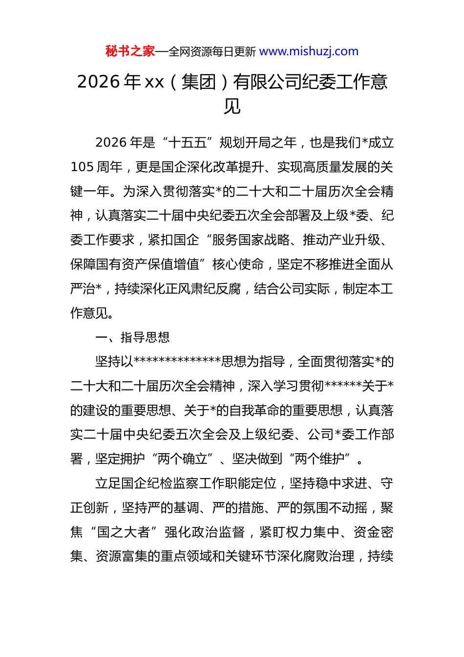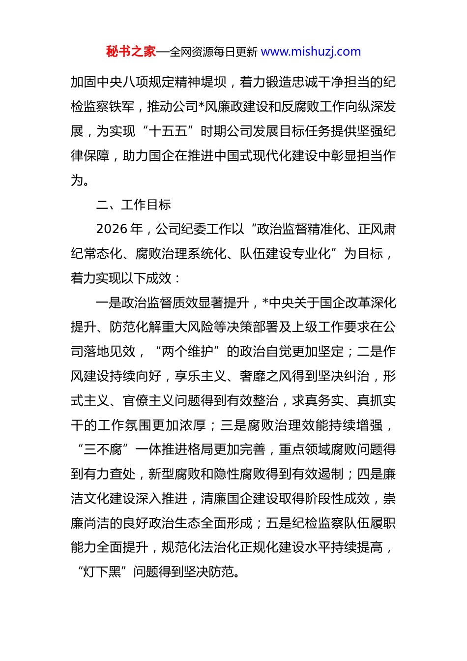 秘书之家—全网资源每日更新 www.mishuzj.com2026 年 xx(集团)有限公司纪委工作意见2026 年是“十五五”规划开局之年,也是我们*成立105 周年,更是国企深化改革提升、实现高质量发展的关键一年。为深入贯彻落实*的二十大和二十届历次全会精神,认真落实二十届中央纪委五次全会部署及上级*委、纪委工作要求,紧扣国企“服务国家战略、推动产业升级、保障国有资产保值增值”核心使命,坚定不移推进全面从严治*,持续深化正风肃纪反腐,结合公司实际,制定本工作意见。一、指导思想坚持以**************思想为指导,全面贯彻落实*的二十大和二十届历次全会精神,深入学习贯彻******关于*的建设的重要思想、关于*的自我革命的重要思想,认真落实二十届中央纪委五次全会及上级纪委、公司*委工作部署,坚定拥护“两个确立”、坚决做到“两个维护”。立足国企纪检监察工作职能定位,坚持稳中求进、守正创新,坚持严的基调、严的措施、严的氛围不动摇,聚焦“国之大者”强化政治监督,紧盯权力集中、资金密集、资源富集的重点领域和关键环节深化腐败治理,持续秘书之家—全网资源每日更新 www.mishuzj.com加固中央八项规定精神堤坝,着力锻造忠诚干净担当的纪检监察铁军,推动公司*风廉政建设和反腐败工作向纵深发展,为实现“十五五”时期公司发展目标任务提供坚强纪律保障,助力国企在推进中国式现代化建设中彰显担当作为。二、工作目标2026 年,公司纪委工作以“政治监督精准化、正风肃纪常态化、腐败治理系统化、队伍建设专业化”为目标,着力实现以下成效:一是政治监督质效显著提升,*中央关于国企改革深化提升、防范化解重大风险等决策部署及上级工作要求在公司落地见效,“两个维护”的政治自觉更加坚定;二是作风建设持续向好,享乐主义、奢靡之风得到坚决纠治,形式主义、官僚主义问题得到有效整治,求真务实、真抓实干的工作氛围更加浓厚;三是腐败治理效能持续增强,“三不腐”一体推进格局更加完善,重点领域腐败问题得到有力查处,新型腐败和隐性腐败得到有效遏制;四是廉洁文化建设深入推进,清廉国企建设取得阶段性成效,崇廉尚洁的良好政治生态全面形成;五是纪检监察队伍履职能力全面提升,规范化法治化正规化建设水平持续提高,“灯下黑”问题得到坚决防范。秘书之家—全网资源每日更新 www.mishuzj.com三、主要工作任务(一)深化政治监督,护航“十五五”开局起步聚焦“国之大者”强化精准监督,紧扣二十届中央纪委五次全会关于国企工作的部署要求,把政治监督贯穿公司改革发展全过程、各方面,确保*中央决策部署落地生根。1.强化核心任务监督。紧盯公司贯彻落实**********批示精神、*中央关于国企改革深化提升、国有资产保值增值、防范化解重大风险、发展新质生产力、推进产业升级等重点任务,建立“清单化+台账式”监督机制,细化 20项以上具体监督指标,开展专项督查 3 轮次,及时发现和纠正贯彻落实中的打折扣、搞变通、打白条等问题,推动各项任务落地见效。重点监督公司重大项目建设、重要资金使用、关键改革举措落实等情况,坚决防止有令不行、有禁不止,确保公司发展始终沿着正确政治方向前进。2.强化“一把手”和领导班子监督。严格落实《中共中央关于加强对“一把手”和领导班子监督的意见》,借鉴国家电网等央企监督实践,通过列席*委会议、民主生活会督导、述责述廉评议、廉政谈话等方式,重点监督“一把手”和领导班子贯彻落实民主集中制、执行“三重一大”决策程序、履职尽责廉洁自律等情况,形成领导班子履职秘书之家—全网资源每日更新 www.mishuzj.com“画像式”评估报告,每季度向公司*委和上级纪委报告监督情况,推动“一把手”扛牢第一责任人责任、领导班子成员履行“一岗双责”。3.强化巡视整改闭环监督。紧盯中央及上级巡视反馈问题整改落实,建立“整改清单+月度调度+季度通报”机制,对巡视反馈问题开展“回头看”,重点检查整改成效、巩固整改成果,坚决防止问题反弹回潮。压实整改主体责任和监督责任,对整改不力、敷衍塞责、虚假整改的,严肃追责问责,推动问题销号清零,实现“整改一个问题、规范一个领域、完善一套制度...