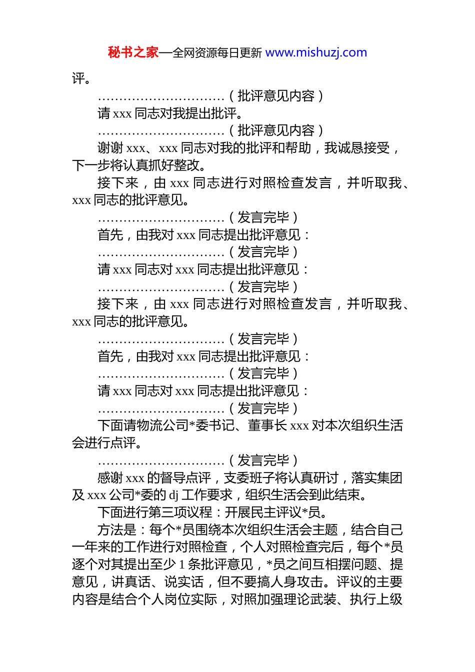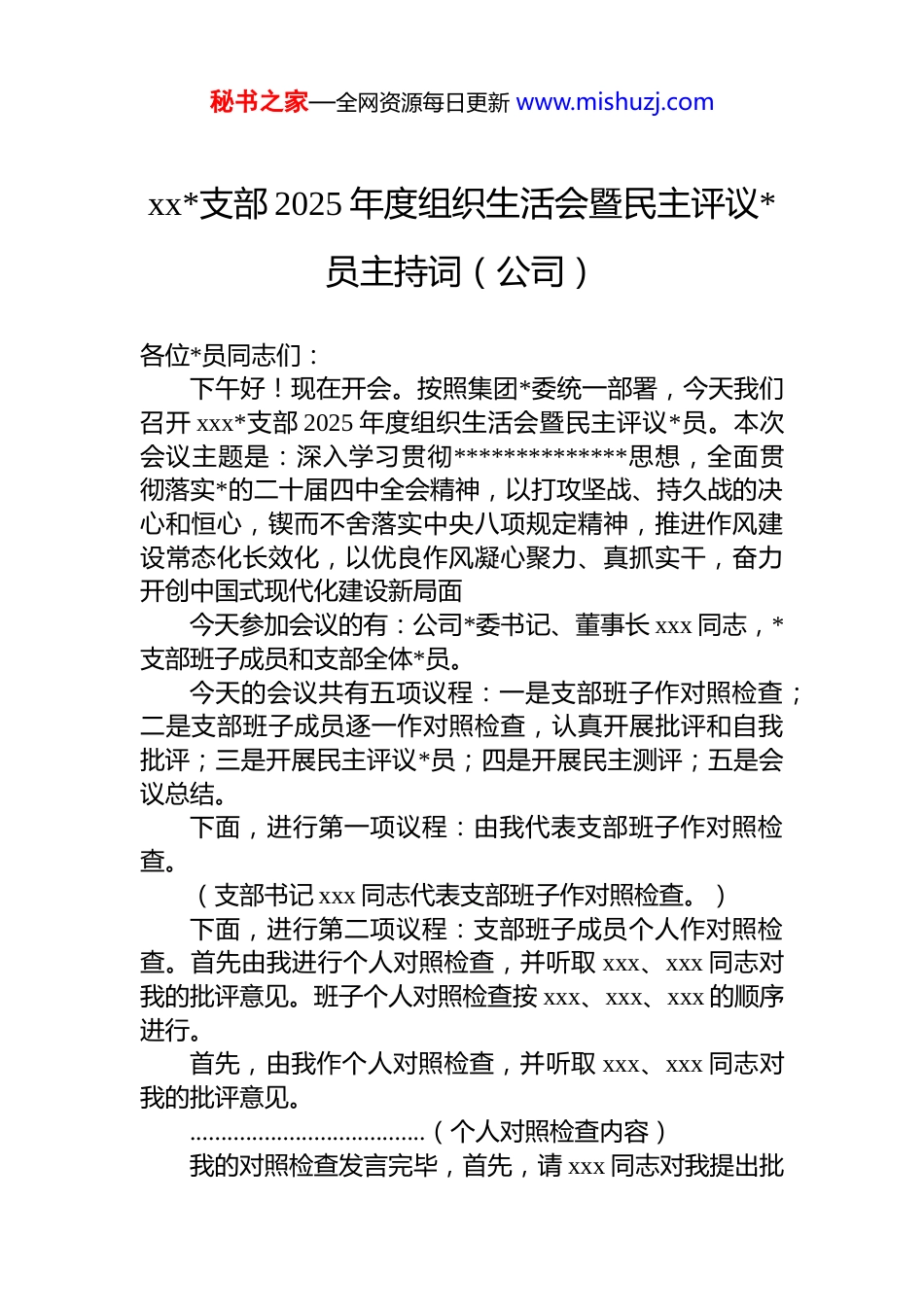 秘书之家—全网资源每日更新 www.mishuzj.comxx*支部 2025 年度组织生活会暨民主评议*员主持词(公司)各位*员同志们:下午好!现在开会。按照集团*委统一部署,今天我们召开 xxx*支部 2025 年度组织生活会暨民主评议*员。本次会议主题是:深入学习贯彻**************思想,全面贯彻落实*的二十届四中全会精神,以打攻坚战、持久战的决心和恒心,锲而不舍落实中央八项规定精神,推进作风建设常态化长效化,以优良作风凝心聚力、真抓实干,奋力开创中国式现代化建设新局面今天参加会议的有:公司*委书记、董事长 xxx 同志,*支部班子成员和支部全体*员。今天的会议共有五项议程:一是支部班子作对照检查;二是支部班子成员逐一作对照检查,认真开展批评和自我批评;三是开展民主评议*员;四是开展民主测评;五是会议总结。下面,进行第一项议程:由我代表支部班子作对照检查。(支部书记 xxx 同志代表支部班子作对照检查。)下面,进行第二项议程:支部班子成员个人作对照检查。首先由我进行个人对照检查,并听取 xxx、xxx 同志对我的批评意见。班子个人对照检查按 xxx、xxx、xxx 的顺序进行。首先,由我作个人对照检查,并听取 xxx、xxx 同志对我的批评意见。......................................(个人对照检查内容)我的对照检查发言完毕,首先,请 xxx 同志对我提出批秘书之家—全网资源每日更新 www.mishuzj.com评。…………………………(批评意见内容)请 xxx 同志对我提出批评。…………………………(批评意见内容)谢谢 xxx、xxx 同志对我的批评和帮助,我诚恳接受,下一步将认真抓好整改。接下来,由 xxx 同志进行对照检查发言,并听取我、xxx 同志的批评意见。…………………………(发言完毕)首先,由我对 xxx 同志提出批评意见:…………………………(发言完毕)请 xxx 同志对 xxx 同志提出批评意见:…………………………(发言完毕)接下来,由 xxx 同志进行对照检查发言,并听取我、xxx 同志的批评意见。…………………………(发言完毕)首先,由我对 xxx 同志提出批评意见:…………………………(发言完毕)请 xxx 同志对 xxx 同志提出批评意见:…………………………(发言完毕)下面请物流公司*委书记、董事长 xxx 对本次组织生活会进行点评。…………………………(发言完毕)感谢 xxx 的督导点评,支委班子将认真研讨,落实集团及 xxx 公司*委的 dj 工作要求,组织生活会到此结束。下面进行第三项议程:开展民主评议*员。方法是:每个*员围绕本次组织生活会主题,结合自己一年来的工作进行对照检查,个人对照检查完后,每个*员逐个对其提出至少 1 条批评意见,*员之间互相摆问题、提意见,讲真话、说实话,但不要搞人身攻击。评议的主要内容是结合个人岗位实际,对照加强理论武装、执行上级秘书之家—全网资源每日更新 www.mishuzj.com组织决定、严格组织生活、加强*员管理监督、做好群众工作、抓好自身建设等六个方面展开。…………………………(批评完毕)下面进行第四项议程:开展民主测评。民主测评采取发放测评表、无记名测评的方式,其中民主评议*员按照“优秀”“合格”“基本合格”“不合格”四种等次,对*员进行测评,支委班子工作及作风情况评议按照“好”“较好”“一般”“差”进行评议。现在请工作人员发放民主评议表和支委班子 2025 年度工作及作风情况评议表。(测评结束后工作人员收回测评表,清点)下面进行第五项议程:会议小结各位*员同志,通过本次组织生活会及民主评议*员,进一步增进了大家的了解,增强了*性观念,提升了支部凝聚力,取得了较好的成效。为深入贯彻落实全面从严治*要求,现结合支部实际,对全体*员提出以下四点要求,请大家对标对表、严格执行,真正发挥先锋模范作用!一是严守政治纪律,坚决维护*的团结统一。要把牢政治方向始终与*中央保持高度一致,不折不扣落实上级决策部署,决不允许打折扣、搞变通,在大是大非面前立场坚定,主动抵制错误言论,坚决不传播、不附和负面信息。要规范政治言行,严守组织程序,重大事项及时请示报告杜绝自行其是、先...