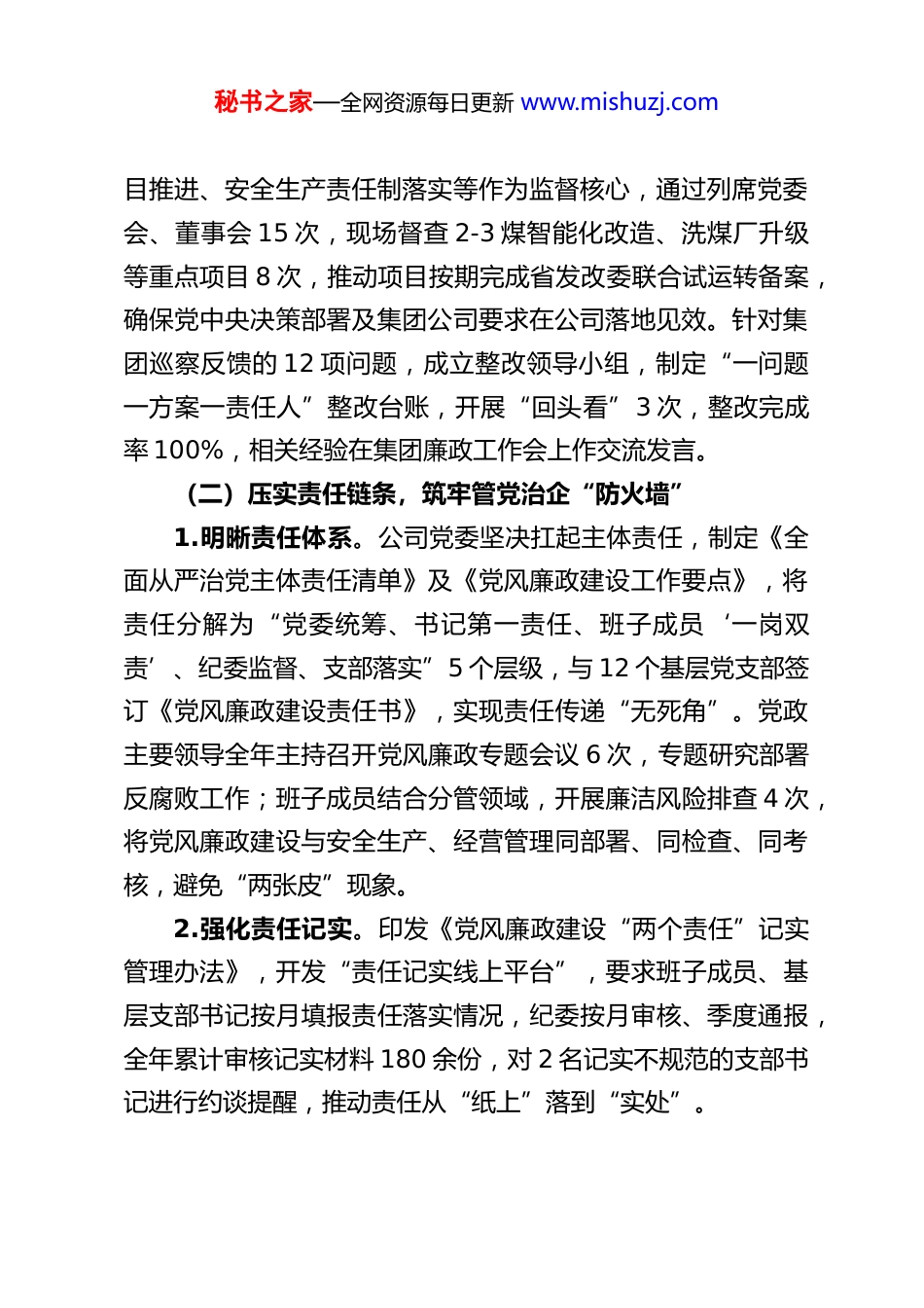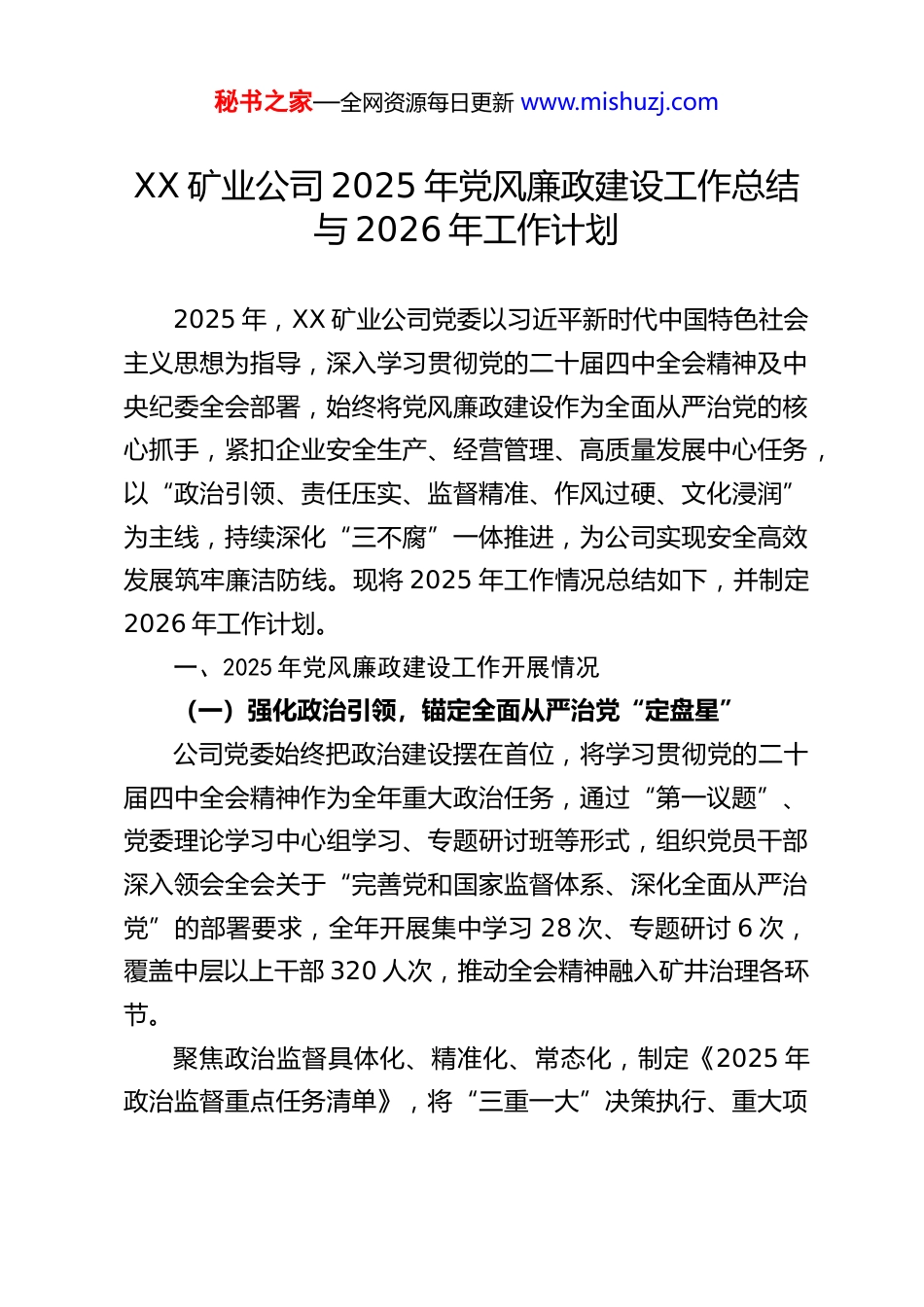 秘书之家—全网资源每日更新 www.mishuzj.comXX 矿业公司 2025 年党风廉政建设工作总结与 2026 年工作计划2025 年,XX 矿业公司党委以习近平新时代中国特色社会主义思想为指导,深入学习贯彻党的二十届四中全会精神及中央纪委全会部署,始终将党风廉政建设作为全面从严治党的核心抓手,紧扣企业安全生产、经营管理、高质量发展中心任务,以“政治引领、责任压实、监督精准、作风过硬、文化浸润”为主线,持续深化“三不腐”一体推进,为公司实现安全高效发展筑牢廉洁防线。现将 2025 年工作情况总结如下,并制定2026 年工作计划。一、2025 年党风廉政建设工作开展情况(一)强化政治引领,锚定全面从严治党“定盘星”公司党委始终把政治建设摆在首位,将学习贯彻党的二十届四中全会精神作为全年重大政治任务,通过“第一议题”、党委理论学习中心组学习、专题研讨班等形式,组织党员干部深入领会全会关于“完善党和国家监督体系、深化全面从严治党”的部署要求,全年开展集中学习 28 次、专题研讨 6 次,覆盖中层以上干部 320 人次,推动全会精神融入矿井治理各环节。聚焦政治监督具体化、精准化、常态化,制定《2025 年政治监督重点任务清单》,将“三重一大”决策执行、重大项秘书之家—全网资源每日更新 www.mishuzj.com目推进、安全生产责任制落实等作为监督核心,通过列席党委会、董事会 15 次,现场督查 2-3 煤智能化改造、洗煤厂升级等重点项目 8 次,推动项目按期完成省发改委联合试运转备案,确保党中央决策部署及集团公司要求在公司落地见效。针对集团巡察反馈的 12 项问题,成立整改领导小组,制定“一问题一方案一责任人”整改台账,开展“回头看”3 次,整改完成率 100%,相关经验在集团廉政工作会上作交流发言。(二)压实责任链条,筑牢管党治企“防火墙”1.明晰责任体系。公司党委坚决扛起主体责任,制定《全面从严治党主体责任清单》及《党风廉政建设工作要点》,将责任分解为“党委统筹、书记第一责任、班子成员‘一岗双责’、纪委监督、支部落实”5 个层级,与 12 个基层党支部签订《党风廉政建设责任书》,实现责任传递“无死角”。党政主要领导全年主持召开党风廉政专题会议 6 次,专题研究部署反腐败工作;班子成员结合分管领域,开展廉洁风险排查 4 次,将党风廉政建设与安全生产、经营管理同部署、同检查、同考核,避免“两张皮”现象。2.强化责任记实。印发《党风廉政建设“两个责任”记实管理办法》,开发“责任记实线上平台”,要求班子成员、基层支部书记按月填报责任落实情况,纪委按月审核、季度通报,全年累计审核记实材料 180 余份,对 2 名记实不规范的支部书记进行约谈提醒,推动责任从“纸上”落到“实处”。秘书之家—全网资源每日更新 www.mishuzj.com3.严格考核问责。将党风廉政建设纳入基层党组织年度考核,权重占比提升至 30%,通过季度督查、年度测评,对考核排名后 2 位的党支部书记进行诫勉谈话,对 3 名履行“一岗双责”不力的中层干部调整岗位,形成“失责必问、问责必严”的鲜明导向。(三)深化作风建设,擦亮干事创业“金招牌”公司党委始终以中央八项规定精神为“标尺”,扎实开展深入贯彻中央八项规定精神学习教育,持续整治“四风”问题,推动作风建设走深走实。1.紧盯节点防反弹。围绕元旦、春节、中秋等关键节点,通过发送廉洁提醒短信 600 余条、开展明察暗访 9 次、公布举报电话等方式,严防公款吃喝、收送礼品礼金、公车私用等隐形变异问题,全年未发现违规违纪行为。2.整治形式主义官僚主义。以“基层减负年”为抓手,精简会议文件,全年召开会议同比减少 25 场次、发文减少 68 份;优化工作流程,取消基层报表 12 项,推动“线上办公”覆盖率达 90%,切实为工区减负。针对工作中推诿扯皮、不作为等问题,查处典型案例 3 起,对 5 名责任人进行批评教育、2 人给予组织处理,形成有力震慑。3.聚焦群众身边微腐败。开展“职工身边不正之风专项整治”,围绕薪酬分配、厂务公开、物资领用等职工关切问题,深入 17 个基层工区,与 210 名职工座谈,发放...