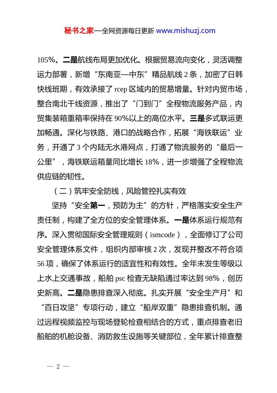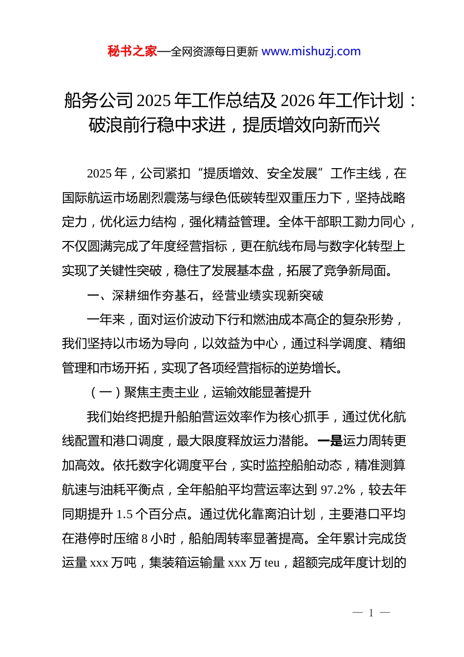 秘书之家—全网资源每日更新 www.mishuzj.com船务公司 2025 年工作总结及 2026 年工作计划:破浪前行稳中求进,提质增效向新而兴2025 年,公司紧扣“提质增效、安全发展”工作主线,在国际航运市场剧烈震荡与绿色低碳转型双重压力下,坚持战略定力,优化运力结构,强化精益管理。全体干部职工勠力同心,不仅圆满完成了年度经营指标,更在航线布局与数字化转型上实现了关键性突破,稳住了发展基本盘,拓展了竞争新局面。一、深耕细作夯基石,经营业绩实现新突破一年来,面对运价波动下行和燃油成本高企的复杂形势,我们坚持以市场为导向,以效益为中心,通过科学调度、精细管理和市场开拓,实现了各项经营指标的逆势增长。(一)聚焦主责主业,运输效能显著提升我们始终把提升船舶营运效率作为核心抓手,通过优化航线配置和港口调度,最大限度释放运力潜能。一是运力周转更加高效。依托数字化调度平台,实时监控船舶动态,精准测算航速与油耗平衡点,全年船舶平均营运率达到 97.2%,较去年同期提升 1.5 个百分点。通过优化靠离泊计划,主要港口平均在港停时压缩 8 小时,船舶周转率显著提高。全年累计完成货运量 xxx 万吨,集装箱运输量 xxx 万 teu,超额完成年度计划的— 1 —秘书之家—全网资源每日更新 www.mishuzj.com105%。二是航线布局更加优化。根据贸易流向变化,灵活调整运力部署,新增“东南亚—中东”精品航线 2 条,加密了日韩快线班期,有效承接了 rcep 区域内的贸易增量。针对内贸市场,整合南北干线资源,推出了“门到门”全程物流服务产品,内贸集装箱重箱率保持在 90%以上的高位水平。三是多式联运更加畅通。深化与铁路、港口的战略合作,拓展“海铁联运”业务,开通了 3 个内陆无水港网点,打通了物流服务的“最后一公里”,海铁联运箱量同比增长 18%,进一步增强了全程物流供应链的韧性。(二)筑牢安全防线,风险管控扎实有效坚持“安全第一,预防为主”的方针,严格落实安全生产责任制,构建了全方位的安全管理体系。一是体系运行规范有序。深入贯彻国际安全管理规则(ismcode),全面修订了公司安全管理体系文件,组织内部审核 2 次,发现并整改不符合项56 项,确保了体系运行的适宜性和有效性。全年未发生等级以上水上交通事故,船舶 psc 检查无缺陷通过率达到 98%,创历史新高。二是隐患排查深入彻底。扎实开展“安全生产月”和“百日攻坚”专项行动,建立“船岸双重”隐患排查机制。通过远程视频监控与现场登轮检查相结合的方式,重点排查老旧船舶的机舱设备、消防救生设施等关键部位,全年累计排查整— 2 —秘书之家—全网资源每日更新 www.mishuzj.com改各类隐患 320 余处,实现了隐患动态清零。三是应急能力显著增强。修订完善了《船舶防台防汛应急预案》等 12 项专项预案,组织开展了“船岸联合搜救”“船舶溢油应急”等实战演练 4 次,有效检验了应急队伍的快速反应能力和协同作战水平。在台风“海葵”等极端天气期间,通过科学指挥、提前避险,确保了所有在航船舶的绝对安全。(三)强化成本管控,精益管理成果丰硕面对高昂的燃油成本和港口费用,我们坚持“算账经营”将成本管控渗透到生产经营的每一个环节。一是燃油管理精准精细。推广应用船舶能效管理系统,对单船油耗进行实时监控和对标分析。大力推行经济航速和纵倾优化技术,开展船体清洗和螺旋桨抛光作业,有效降低了船舶航行阻力。全年营运船舶平均燃油消耗率同比下降 3.8%,节约燃油成本约 xxx 万元。二是采购维修降本增效。完善物资采购招投标机制,扩大集采范围,备件物料采购成本同比下降 5%。深化“自修为主、厂修为辅”的维修理念,鼓励船员开展自主维修保养,严格审核修船工程单,严控非必要修理项目,全年节约修理费用约 xxx万元。三是资金运作稳健高效。加强应收账款管理,建立客户信用评级体系,缩短回款周期,经营性现金流保持正向流入。合理利用金融工具进行汇率风险对锁,有效规避了汇率波动带— 3 —秘书之家—全网资源每日更新 www.mishuzj.com来的财务损失。(四)坚持 dj 引领,团队建设活力迸发坚持以*************...